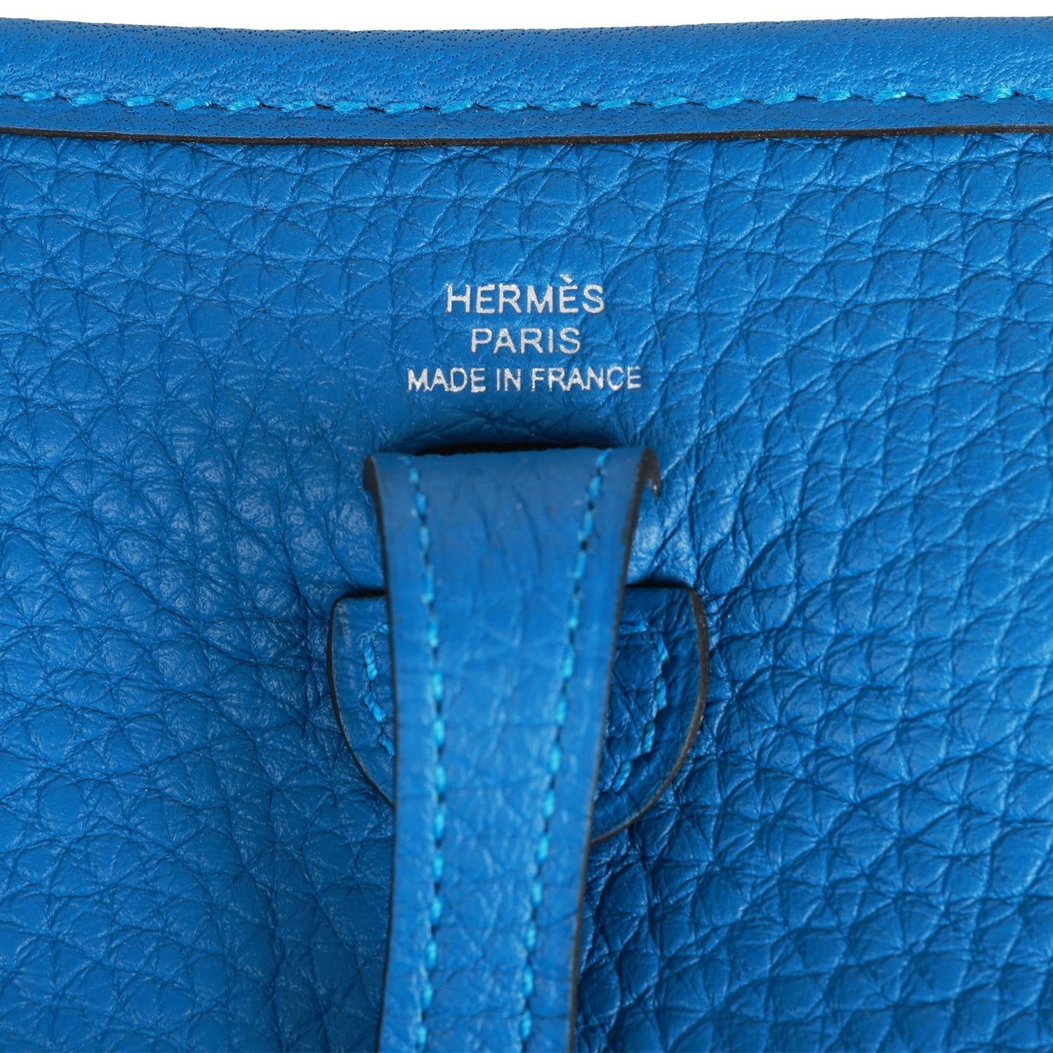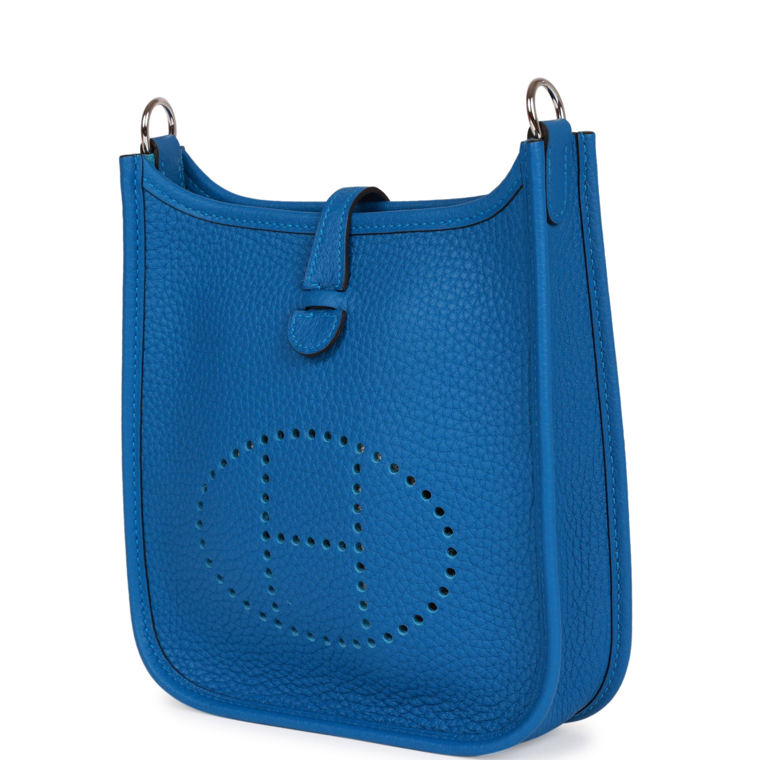 This Evelyne is in Bleu Mykonos clemence leather with palladium hardware and has tonal stitching, pull tab top closure and a White removable canvas and leather shoulder/crossbody strap.