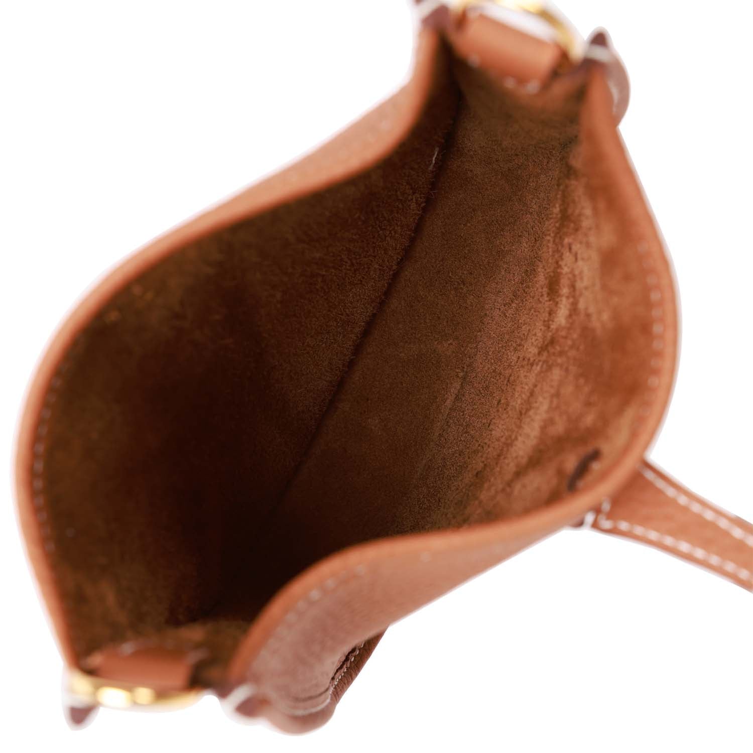 This Evelyne is in Gold clemence leather with gold hardware and has contrast stitching, pull tab top closure and a gold removable canvas and leather shoulder/crossbody strap.