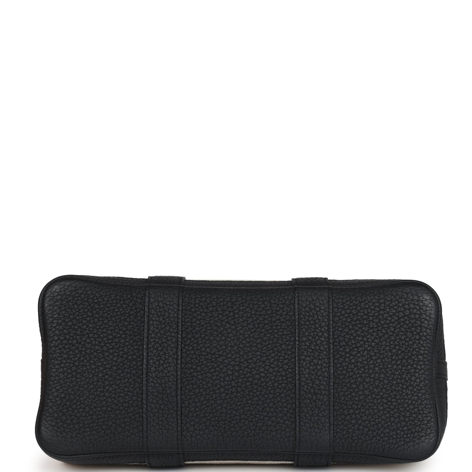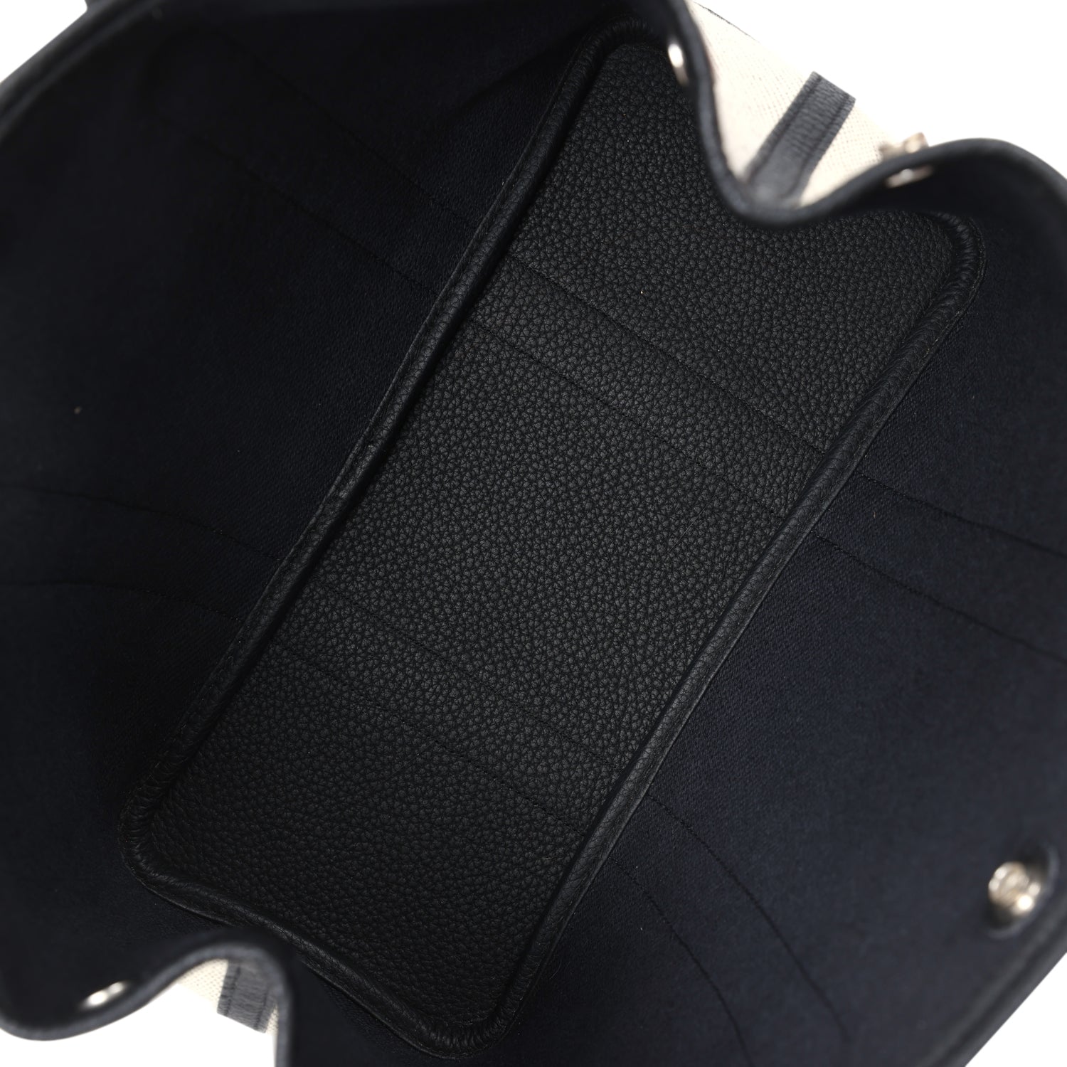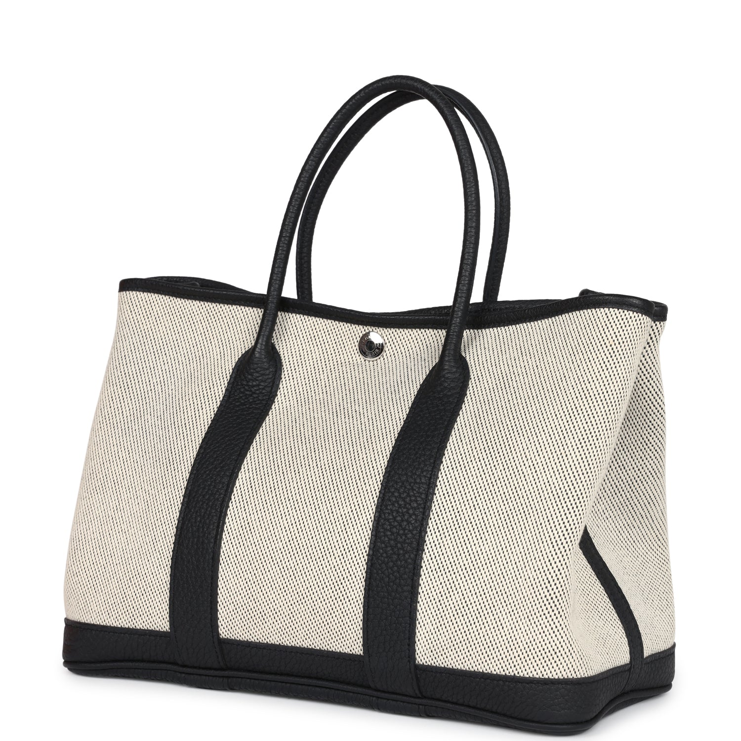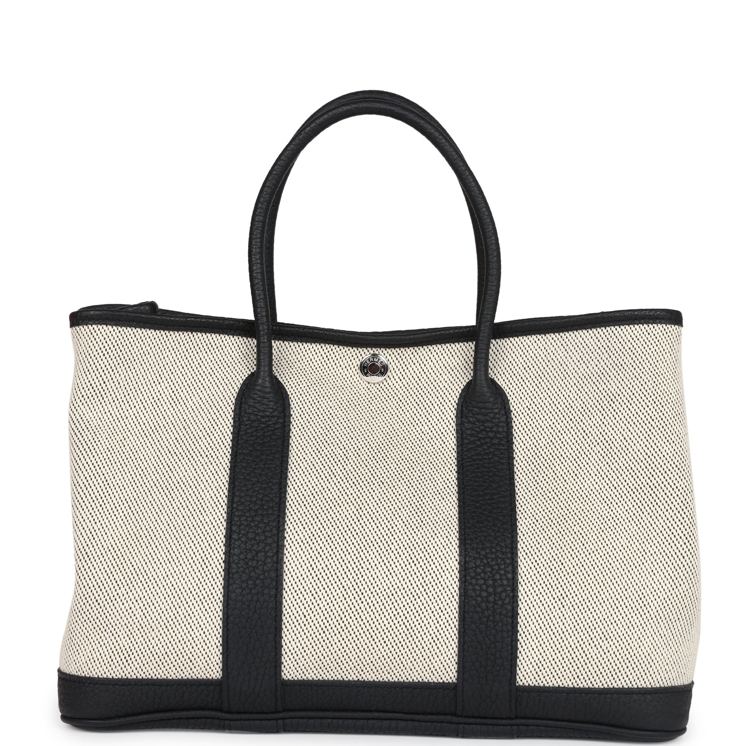 Garden Party 30 is in Ecru toile and Black Negonda leather with classic toile herringbone lining, one engraved palladium front snap closure with two snap closures on side to adjust bag width and two top handles.