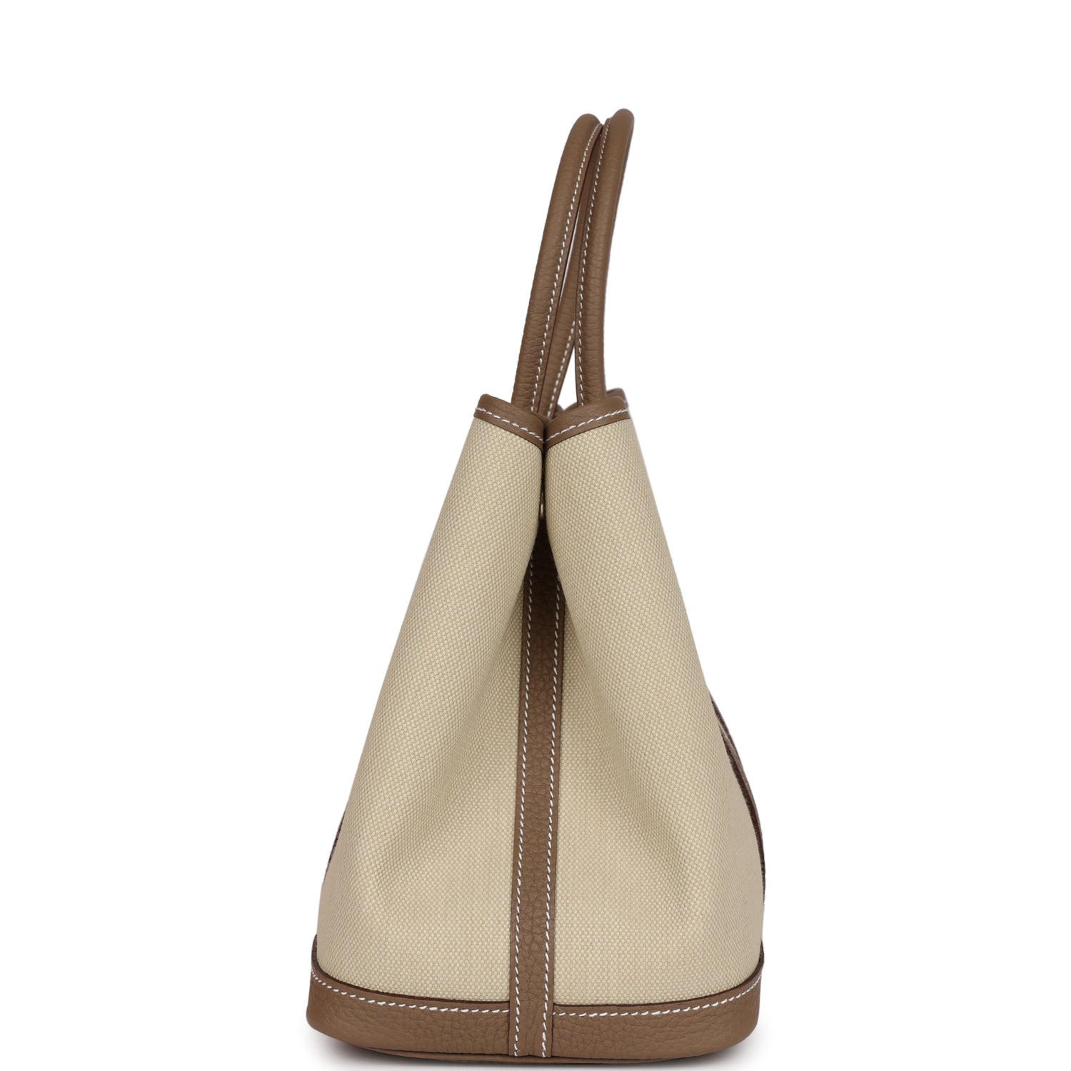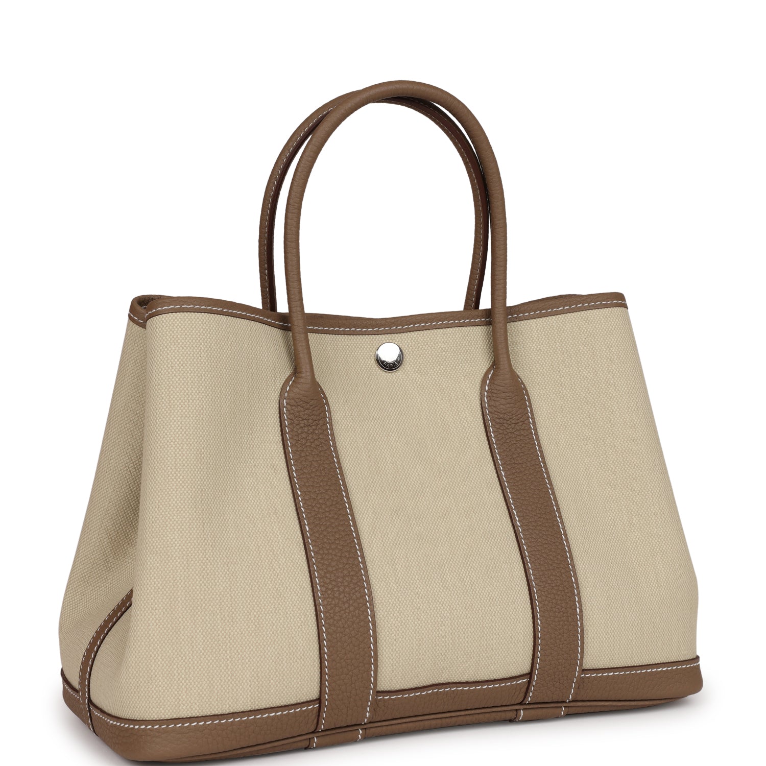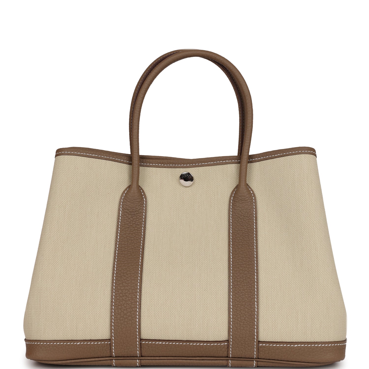 This Garden Party 30 is in Etoupe and Beton Toile and Negonda with Palladium Hardware, contrast stitching, one engraved palladium front snap closure with two snap clousres on the side to adjust bag width. This bag features two top handles