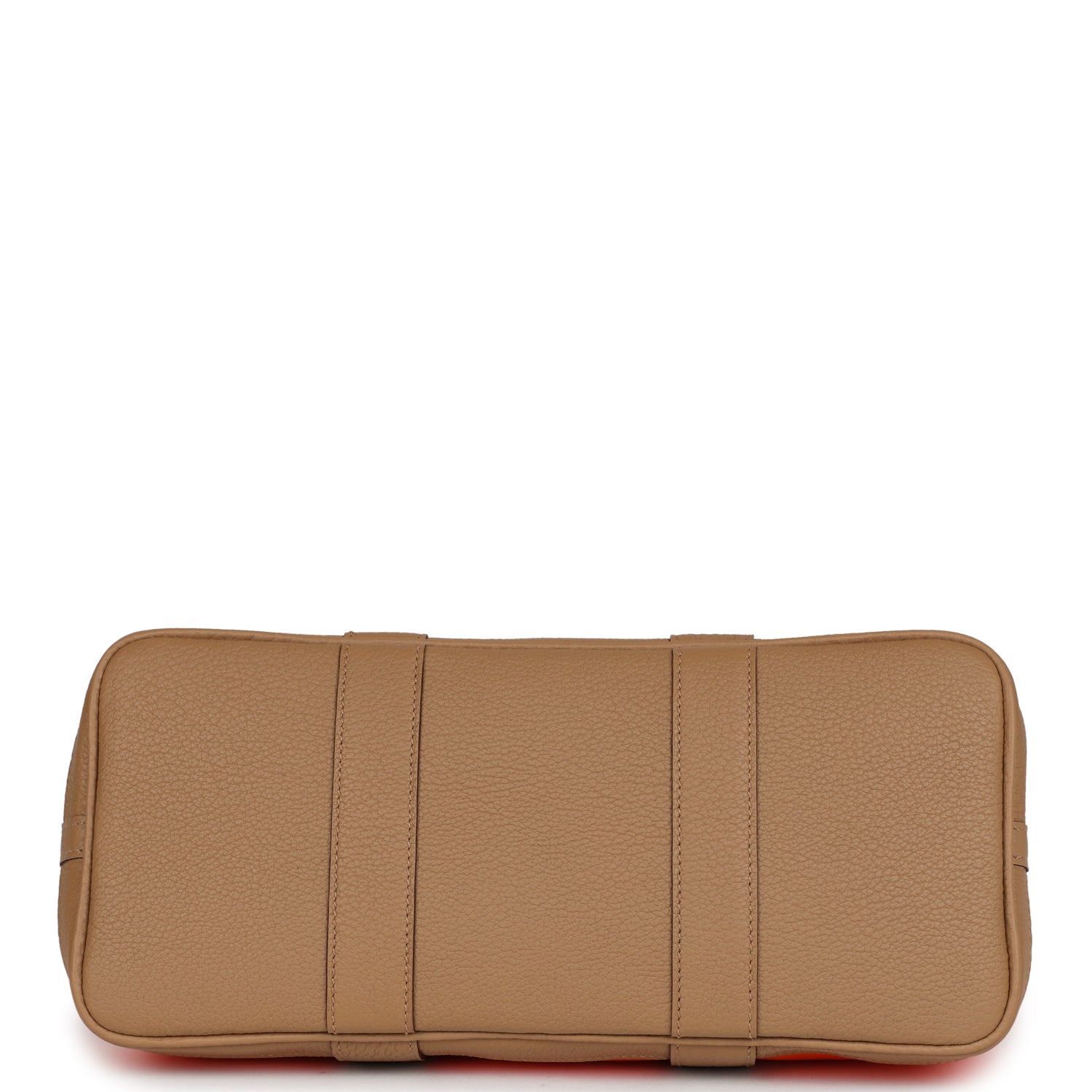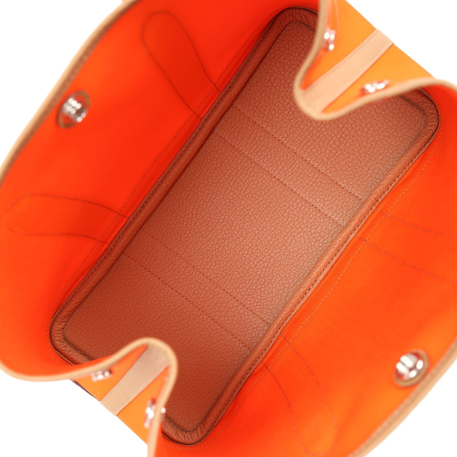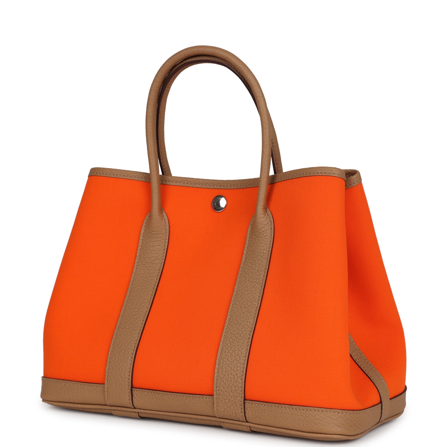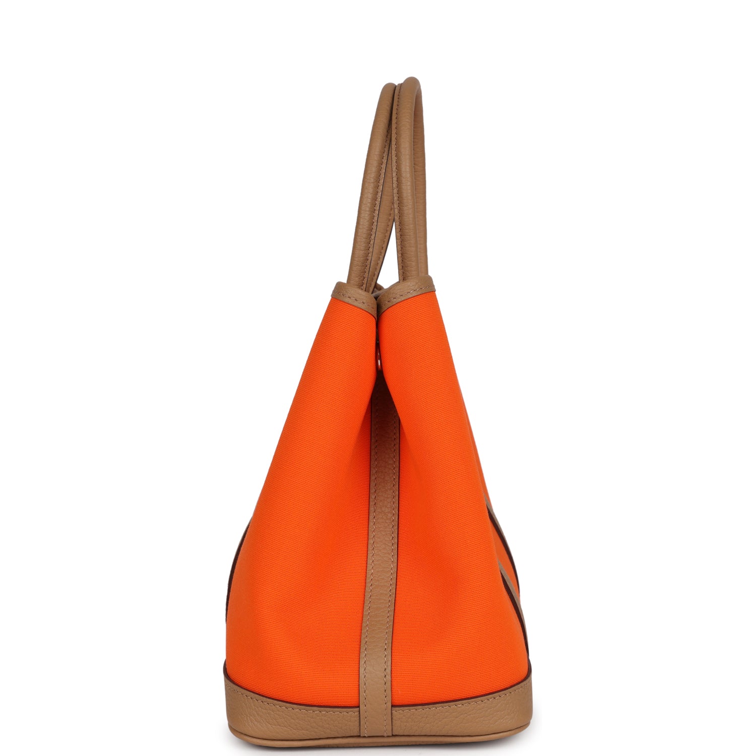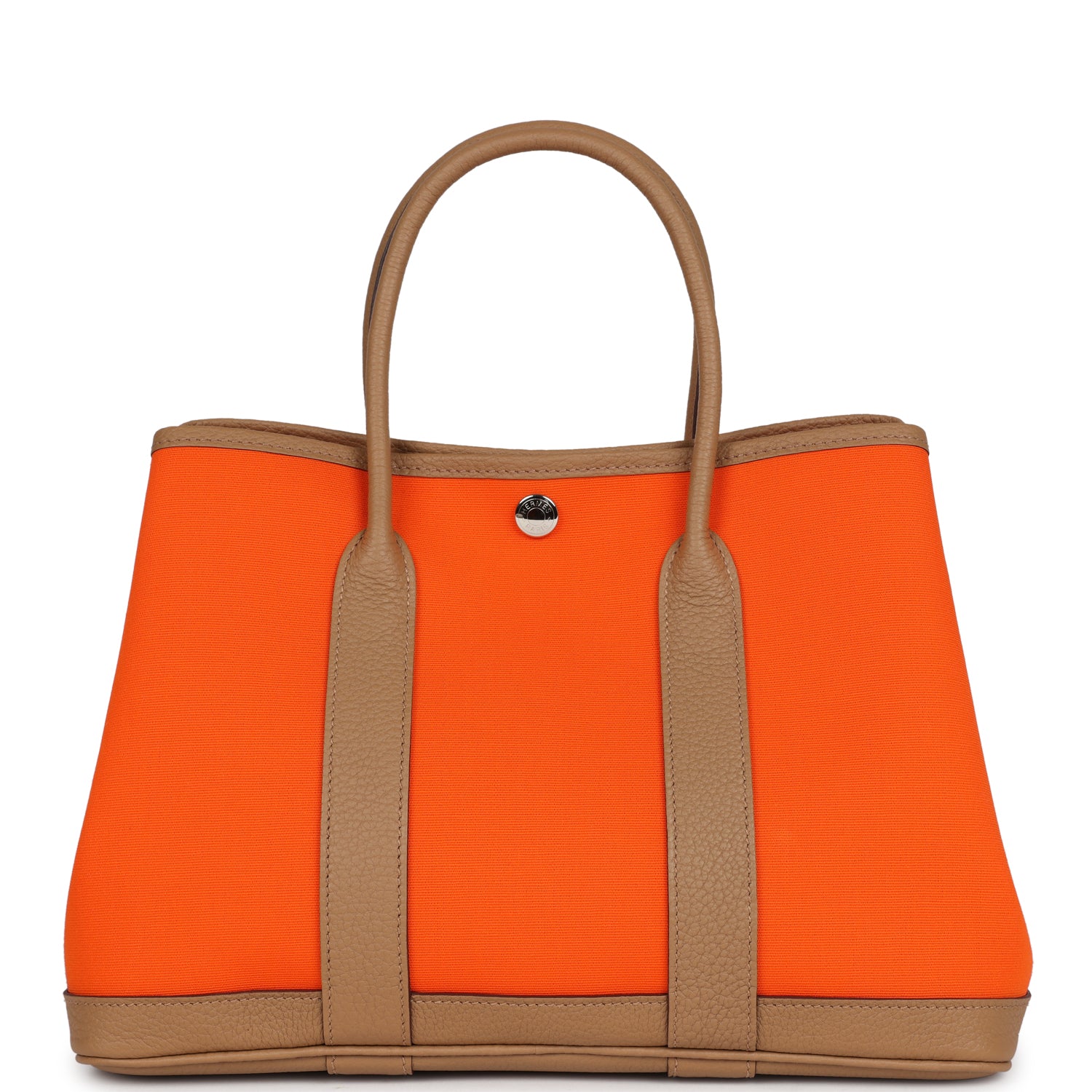 Hermes Garden Party 30 is in Orange Minium toile canvas and Biscuit Negonda leather with palladium hardware, and features tonal stitching, toile canvas lining, one engraved palladium front snap closure with two snap closures on side to adjust bag width. bag features two leather top handles.