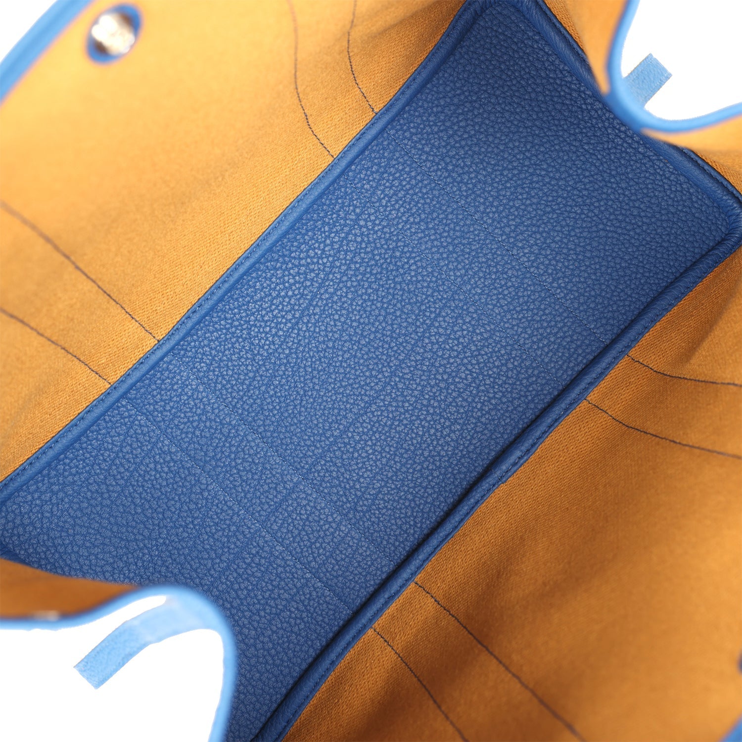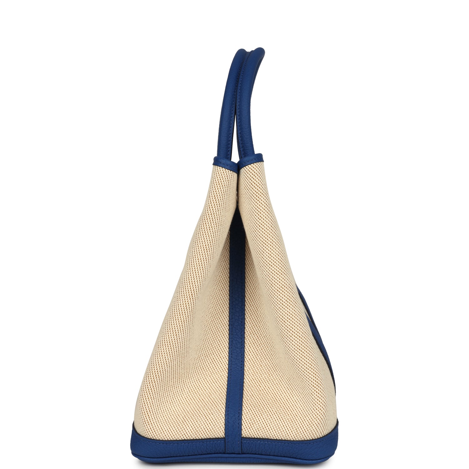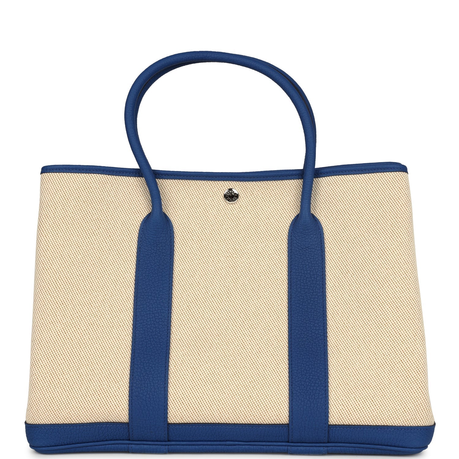 Garden Party is in Bleu France Negonda leather and Ecru canvas with palladium hardware, tonal stitching, Clou de Selle snap closure and double rolled handles.