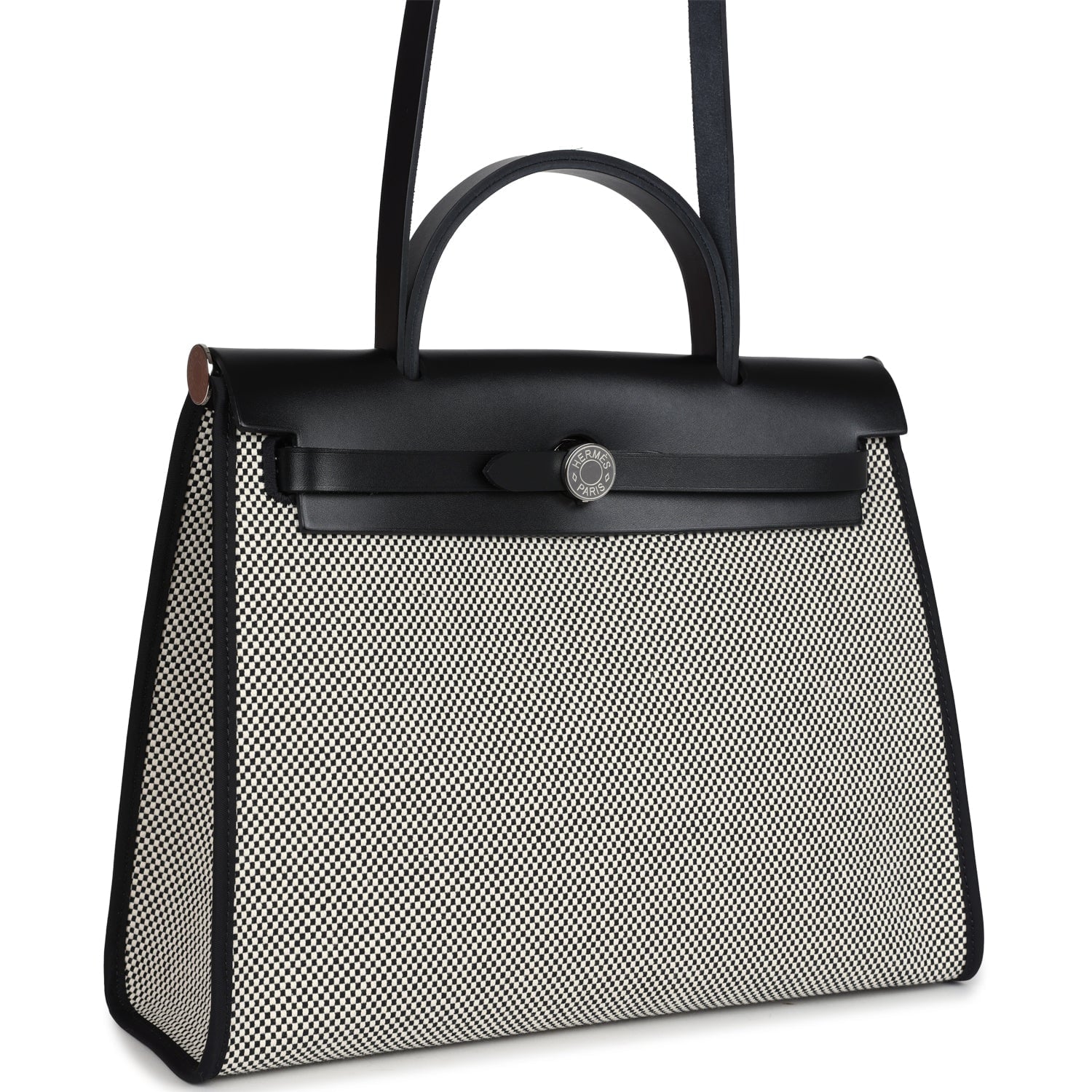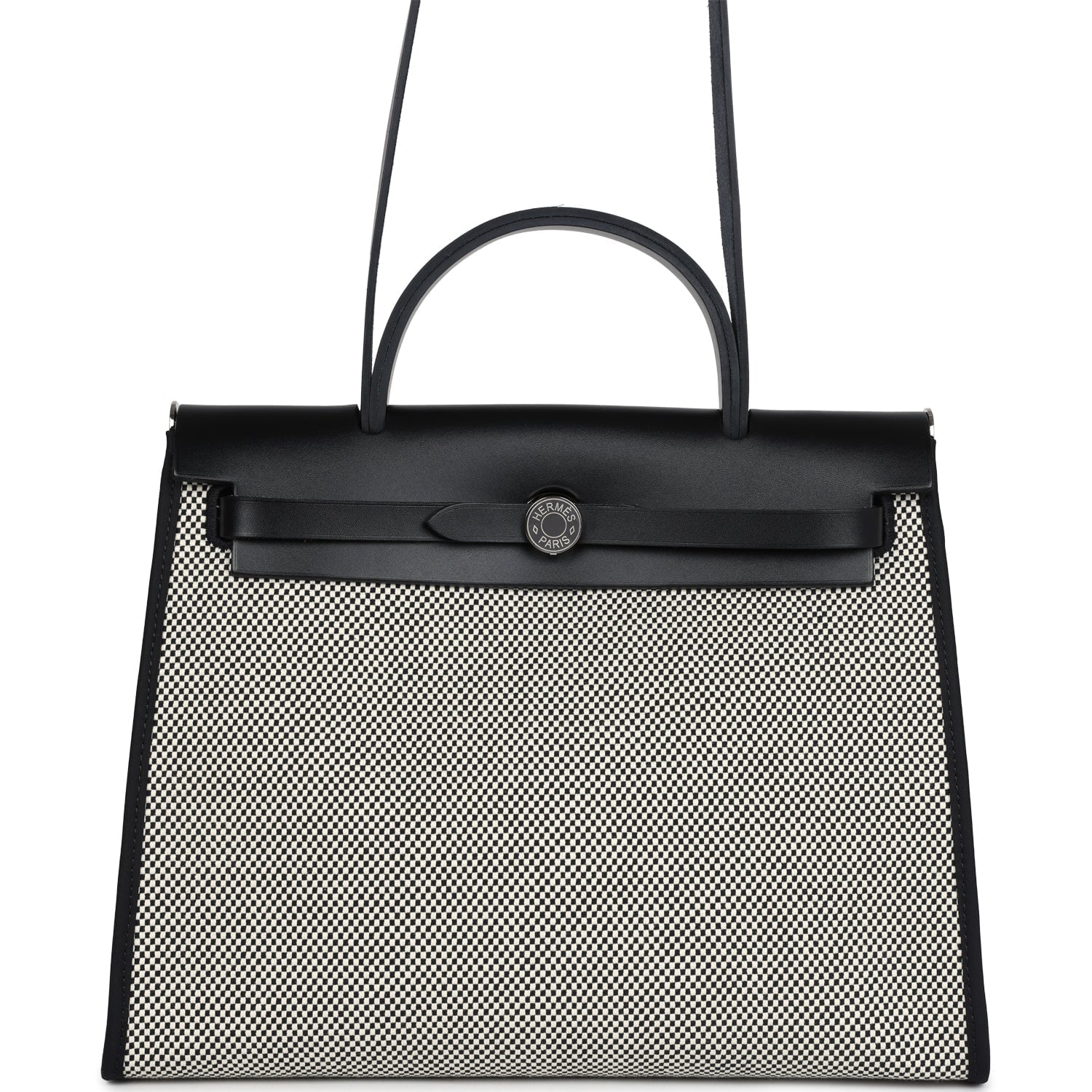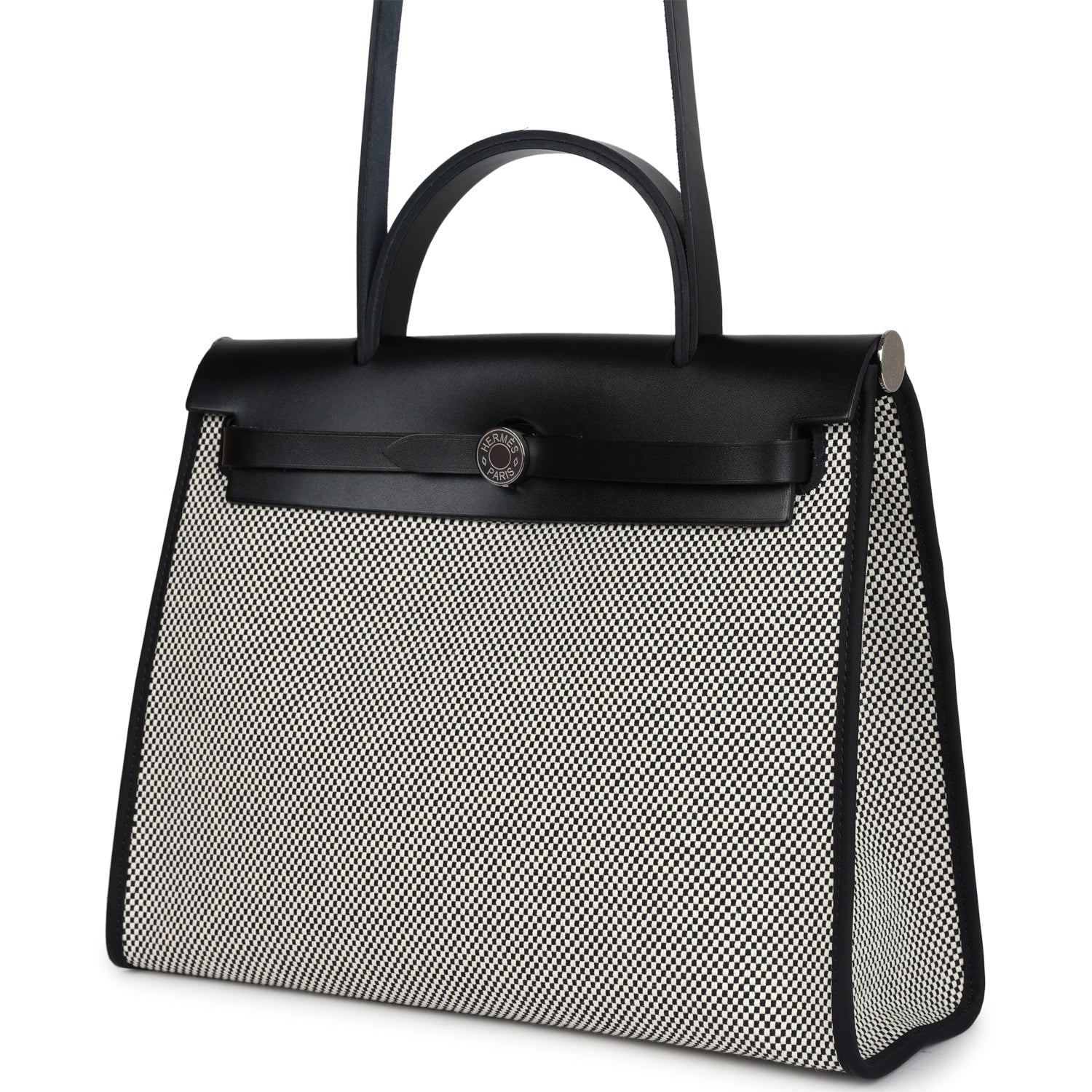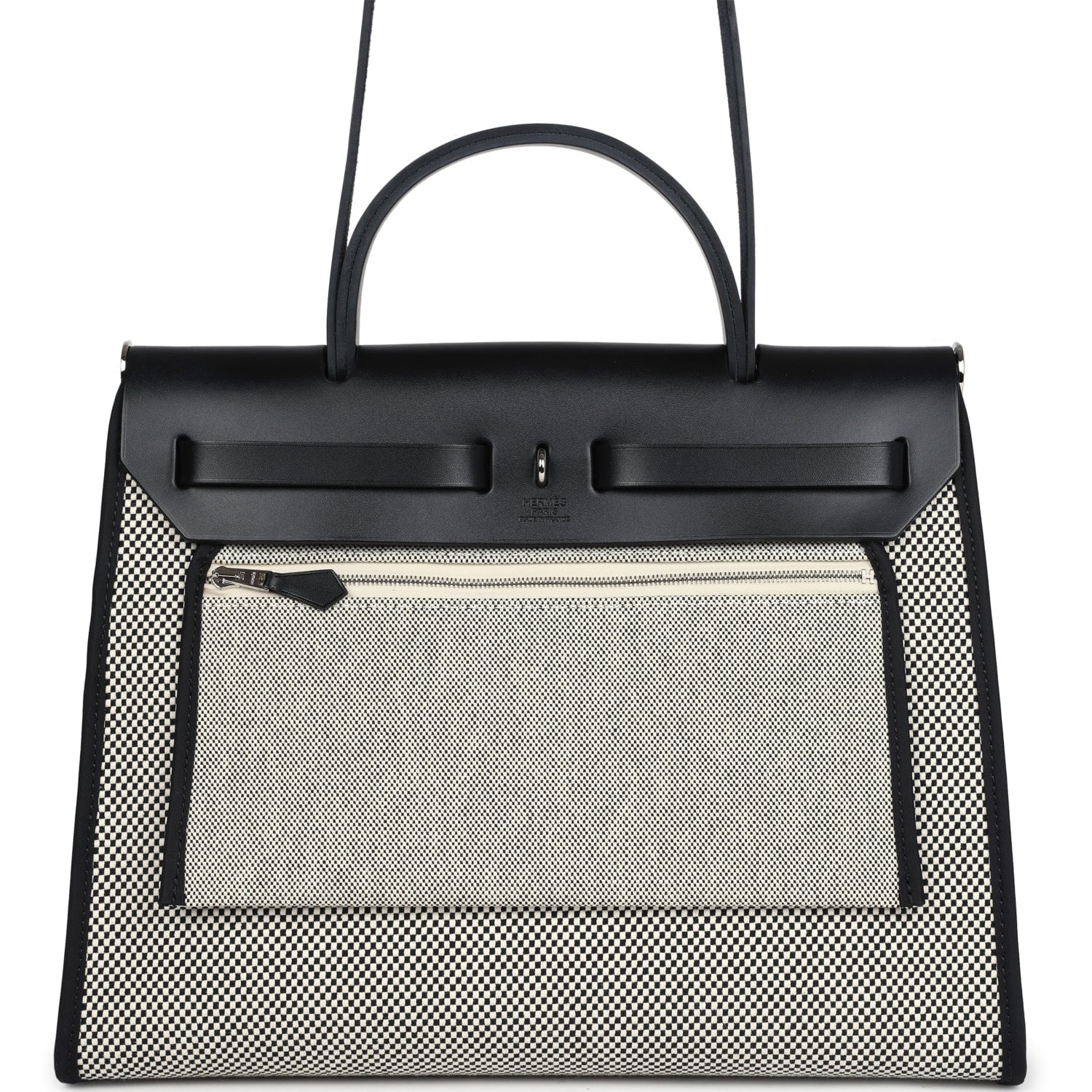 Herbag 31 is in Ecru, White, and Black Criss Viking Toile canvas and Black vache hunter leather with palladium hardware and has tonal stitching, clou de selle closure, top handle and shoulder strap in hunter leather, clochette, interior zip pouch and zip pocket on exterior.