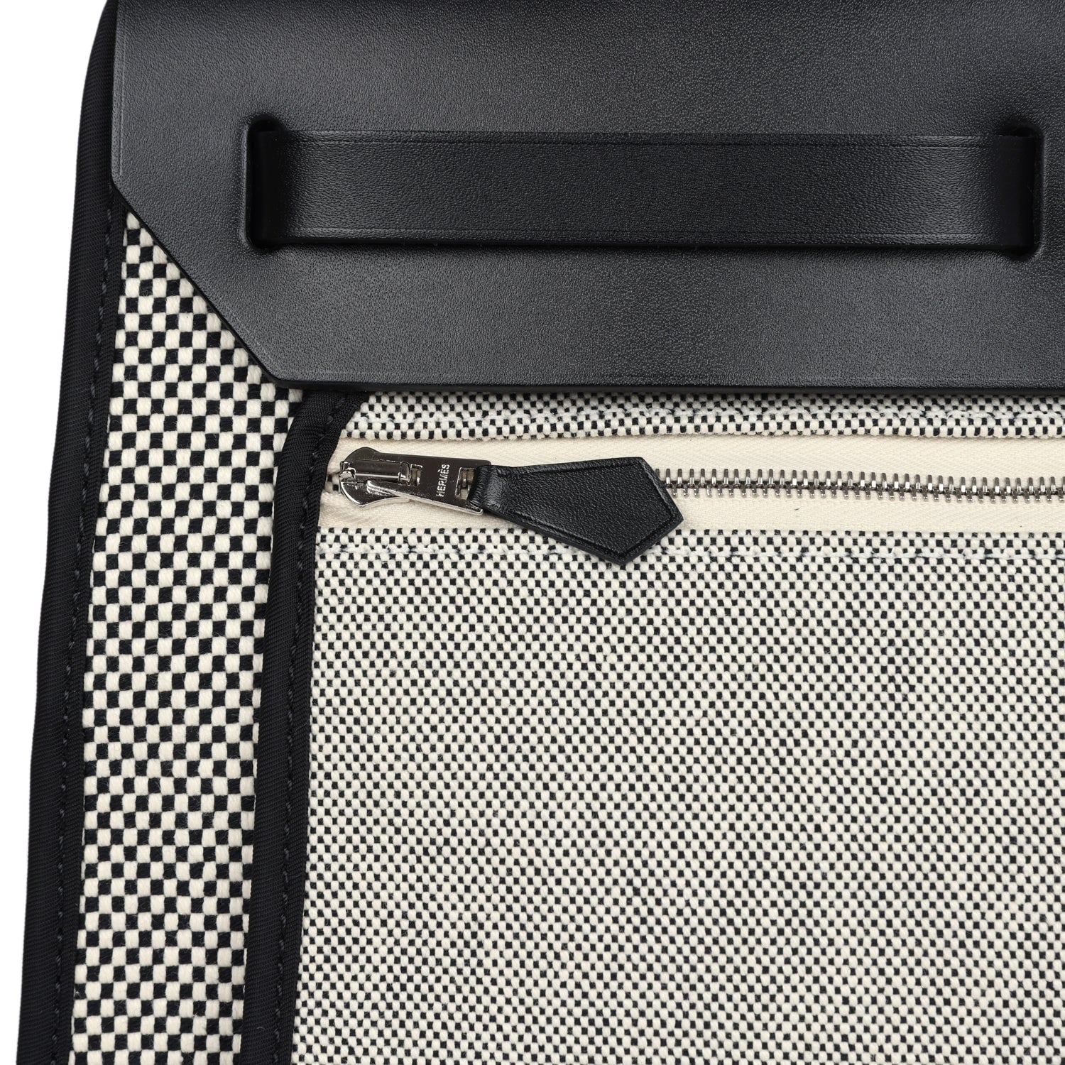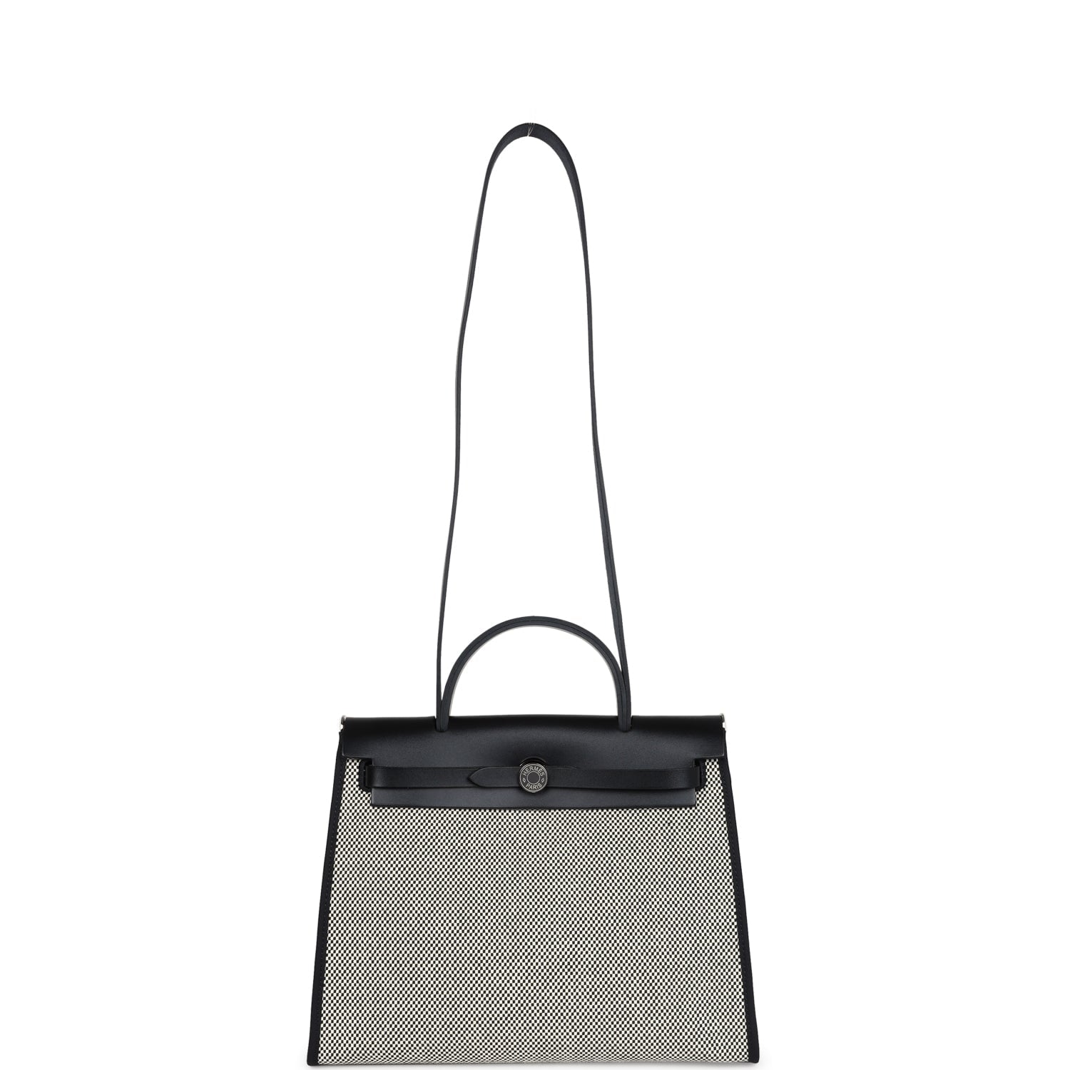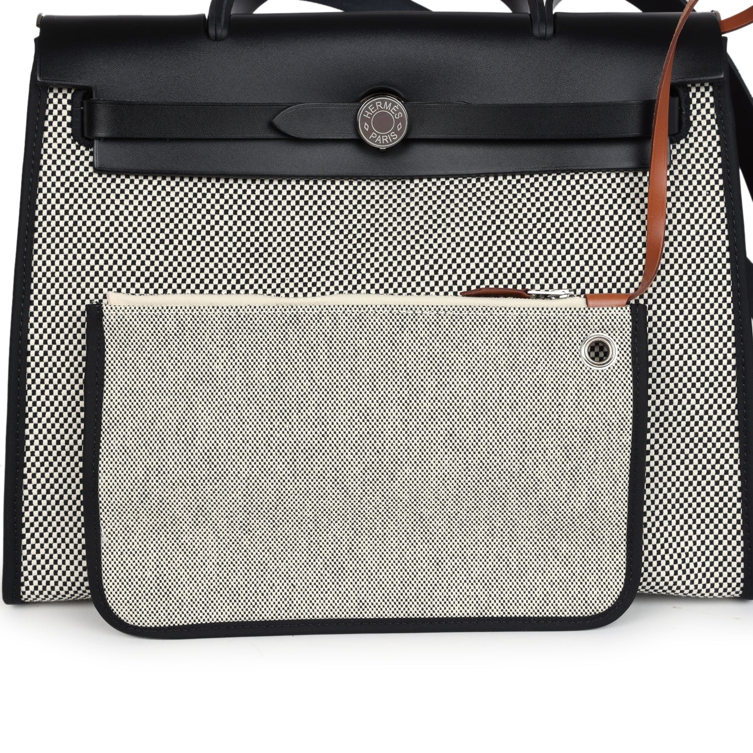 Herbag 31 is in Ecru, White, and Black Criss Viking Toile canvas and Black vache hunter leather with palladium hardware and has tonal stitching, clou de selle closure, top handle and shoulder strap in hunter leather, clochette, interior zip pouch and zip pocket on exterior.