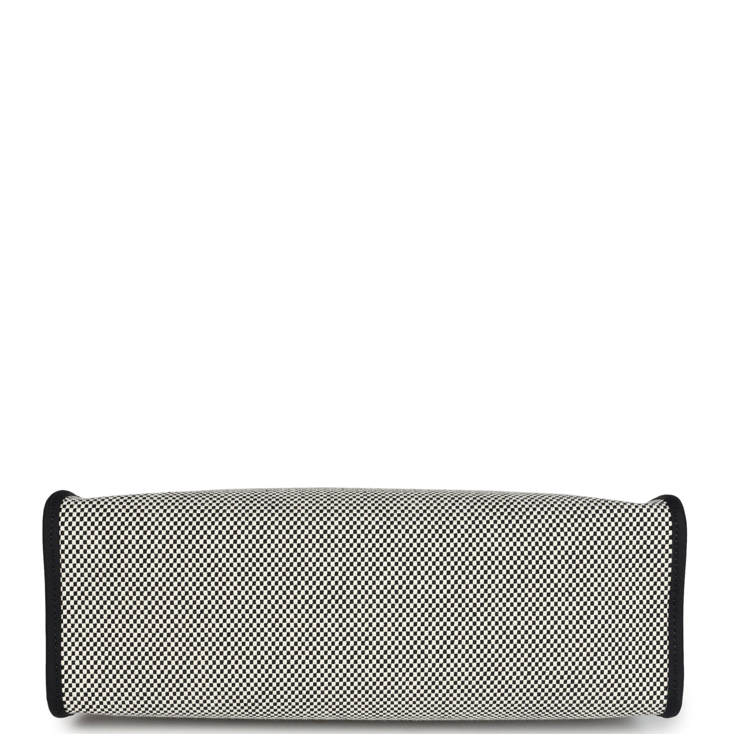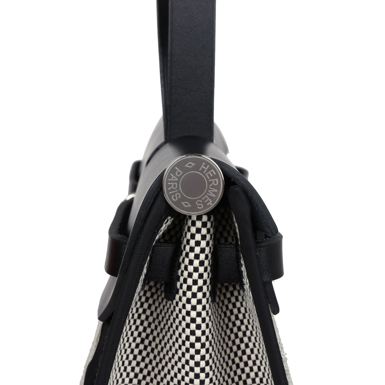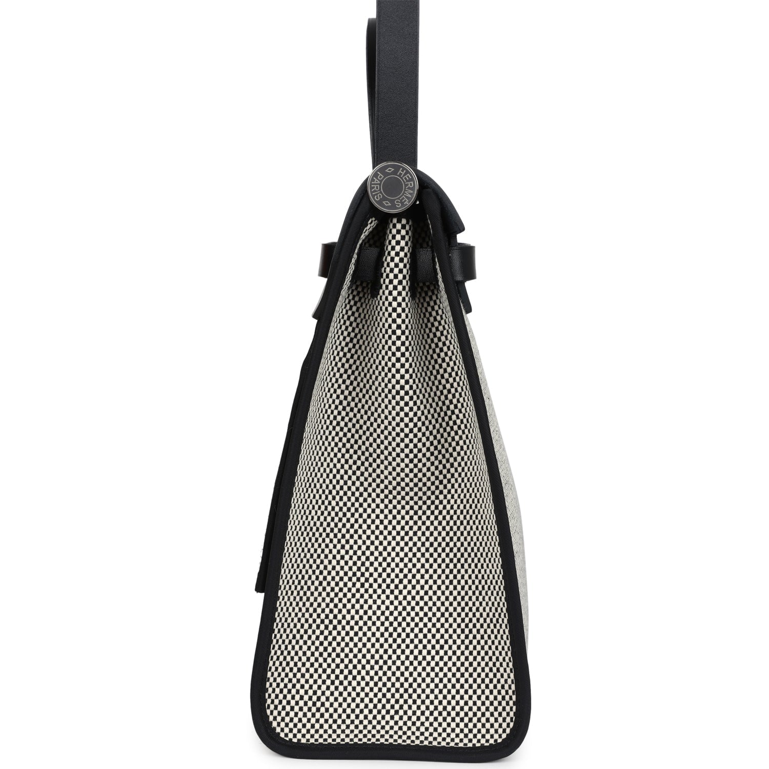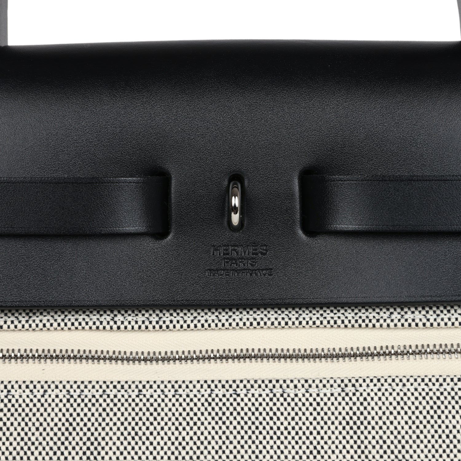 Herbag 31 is in Ecru, White, and Black Criss Viking Toile canvas and Black vache hunter leather with palladium hardware and has tonal stitching, clou de selle closure, top handle and shoulder strap in hunter leather, clochette, interior zip pouch and zip pocket on exterior.