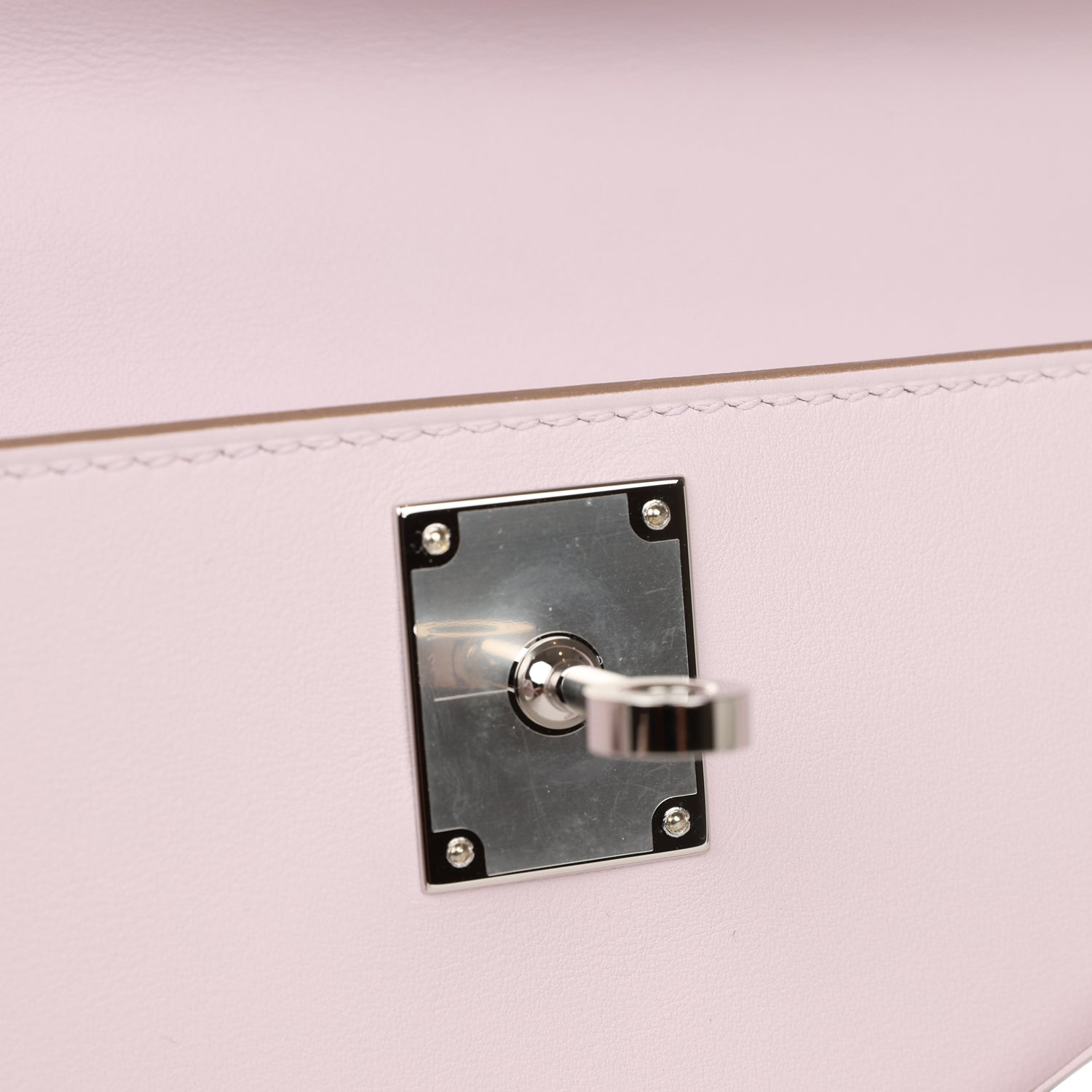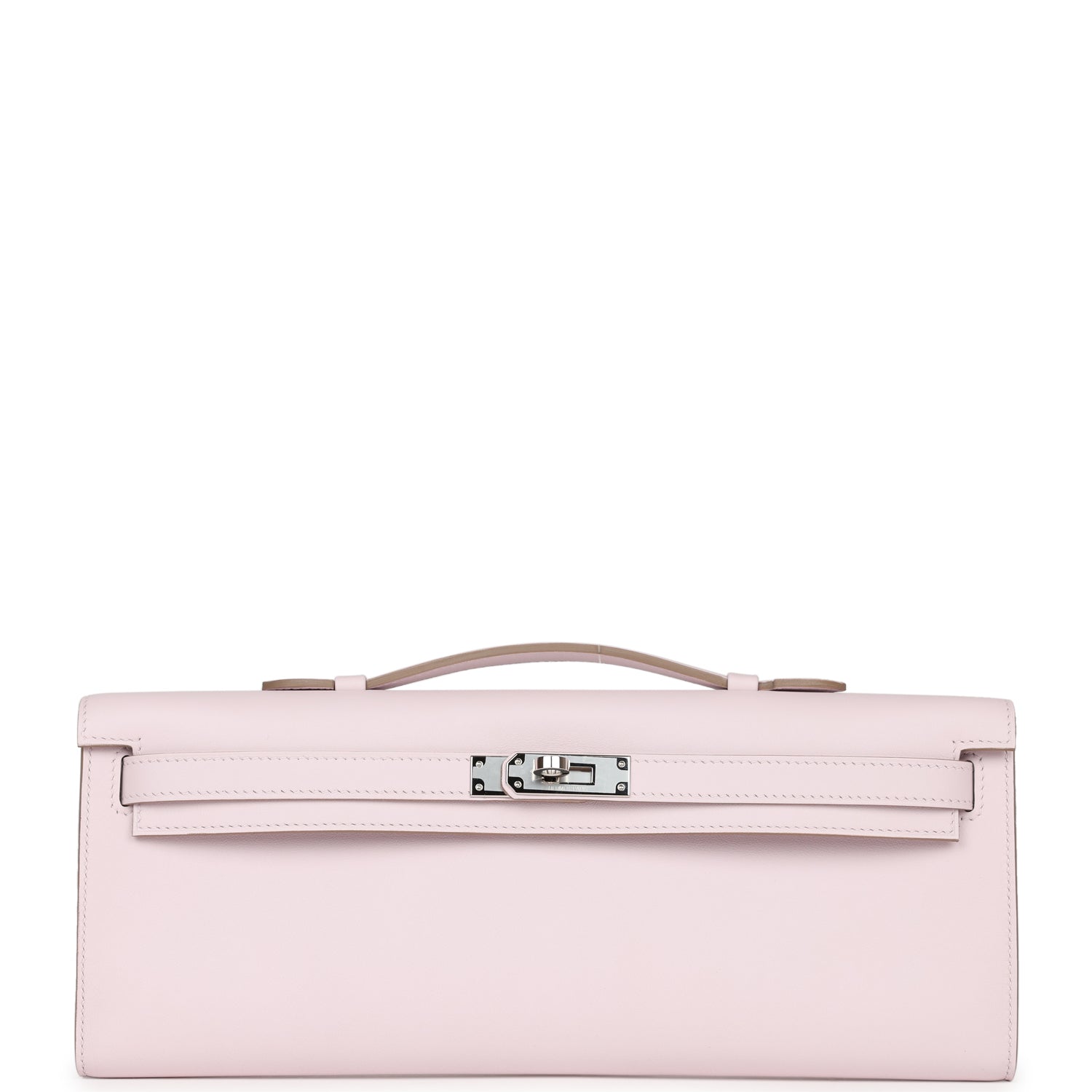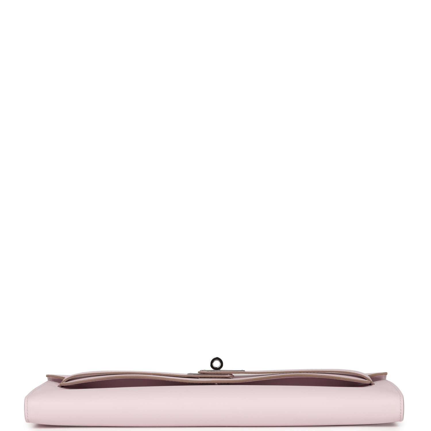 This Kelly Cut wallet is in Mauve Pale swift leather with palladium hardware and has tonal stitching, two straps with front toggle closure and a top flat handle.