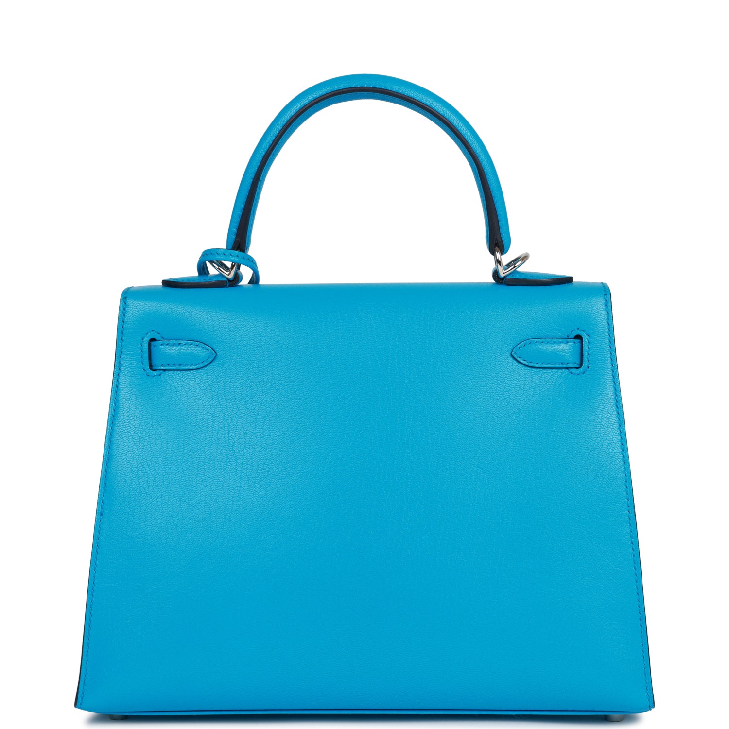 This Kelly, in the Sellier style, is in Bleu Frida chevre leather with palladium hardware and has tonal stitching, two front straps with toggle closure, clochette with lock and two keys, single rolled handle and removable shoulder strap.