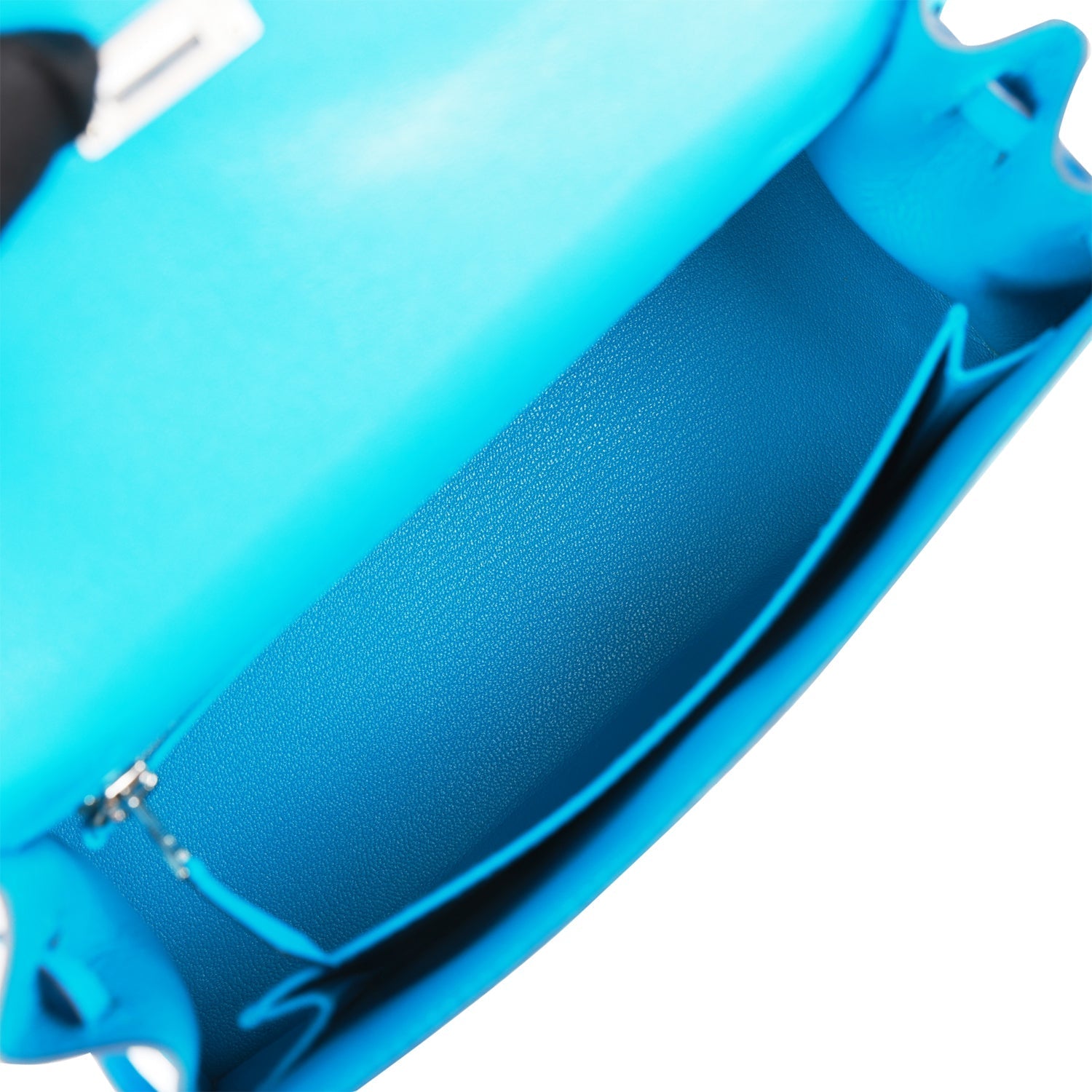 The interior is lined with Bleu Frida chevre leather and has one zip pocket with an Hermes engraved pull and one open pocket on the opposite side.