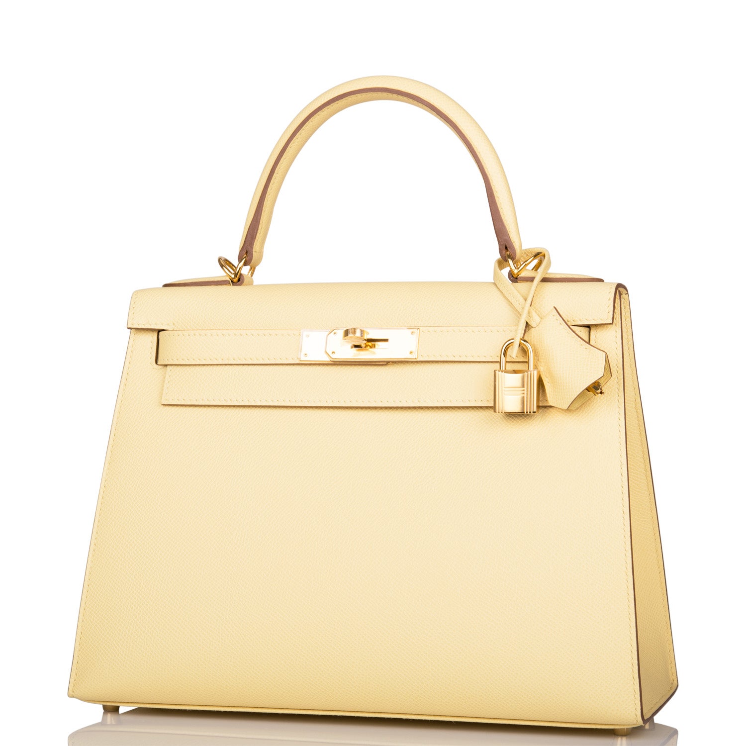 This Kelly, in the Sellier style, is in Jaune Poussin epsom leather with gold hardware and has tonal stitching, front flap, two straps with center toggle closure, clochette with lock and two keys, single rolled handle and removable shoulder strap.