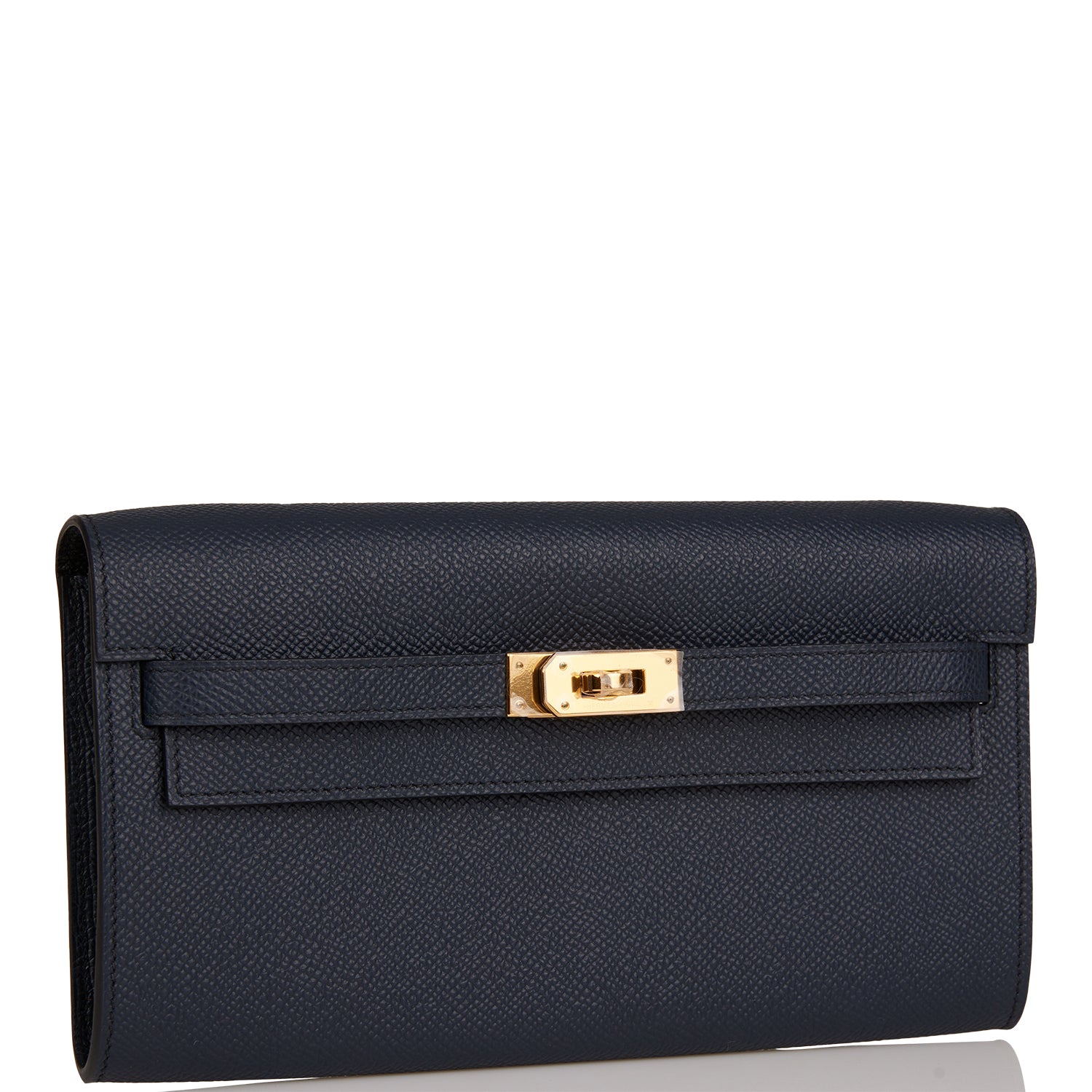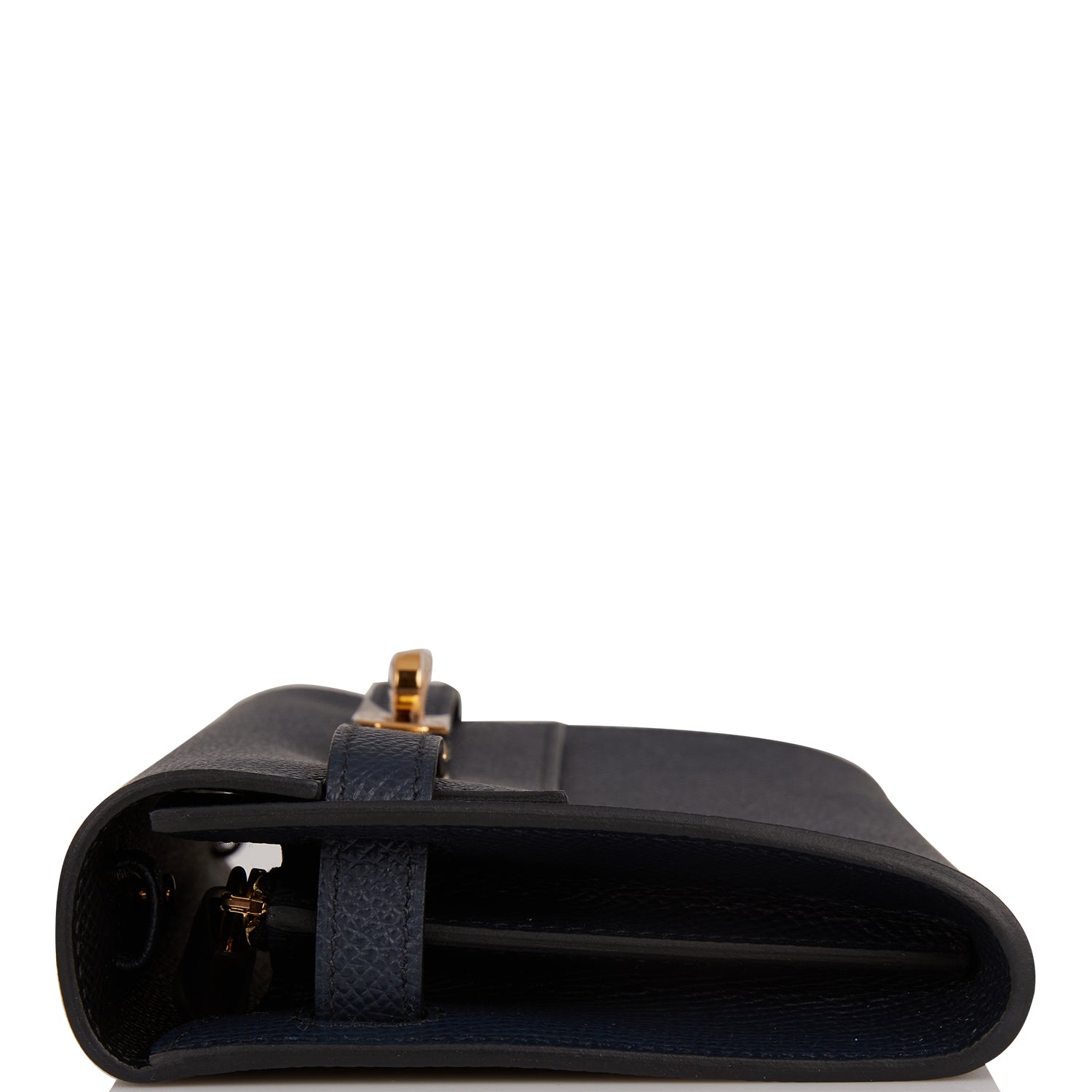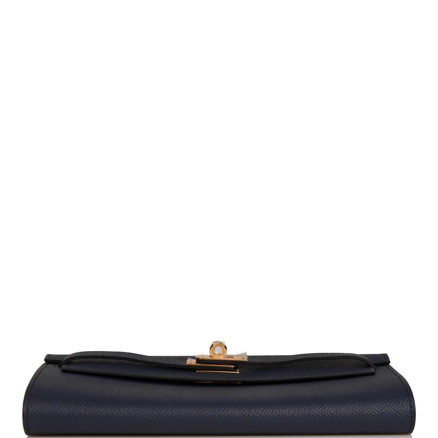 This Kelly Wallet To Go is in Bleu Indigo epsom leather with gold hardware and has tonal stitching, two straps with front toggle closure and removable crossbody strap.