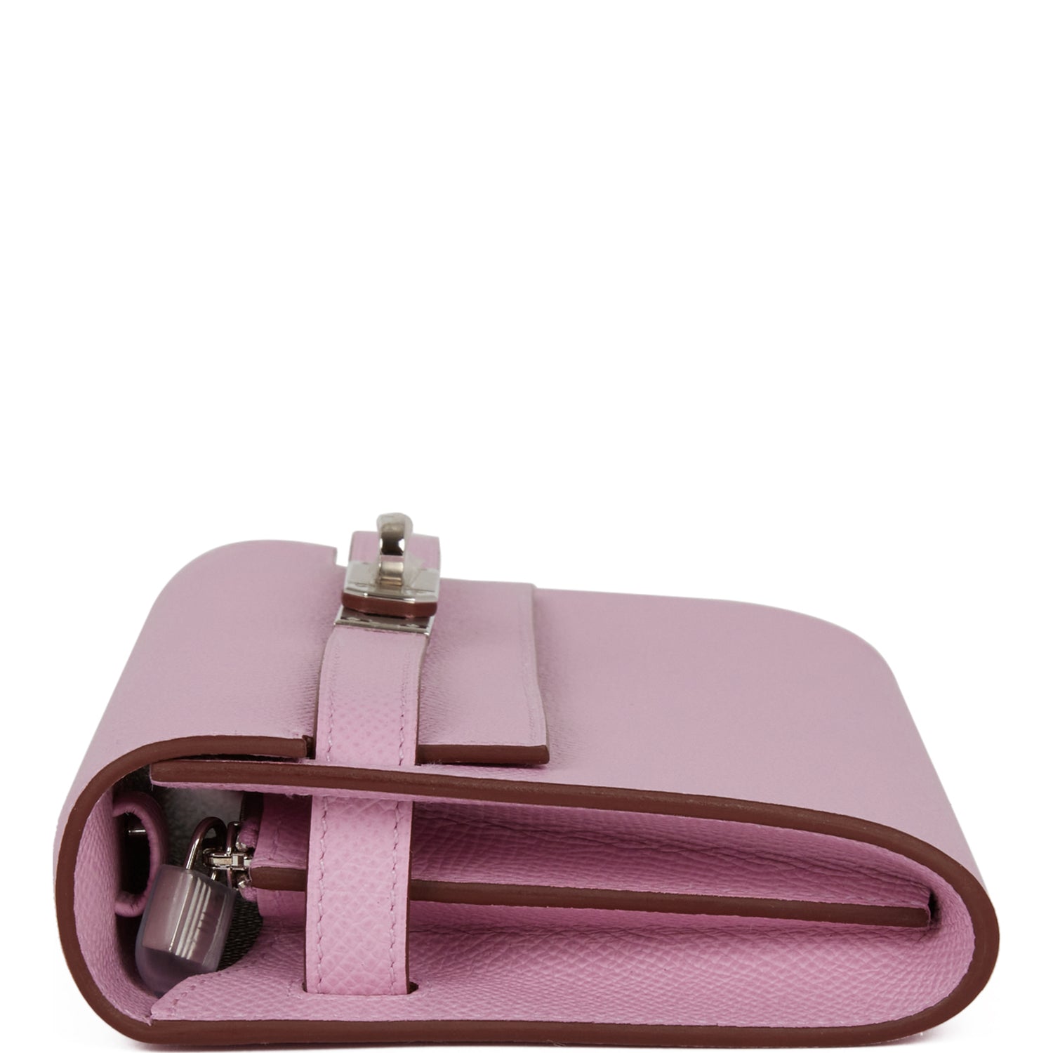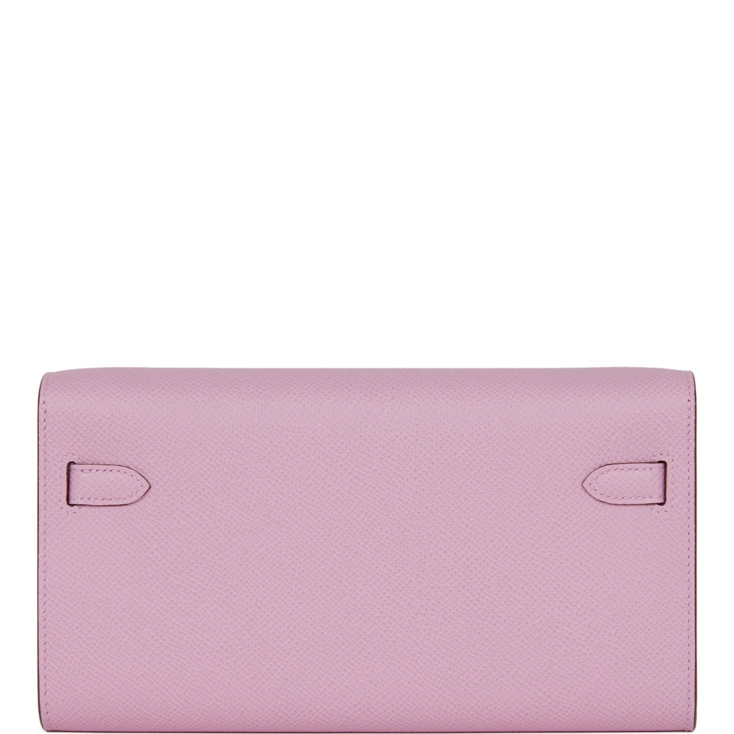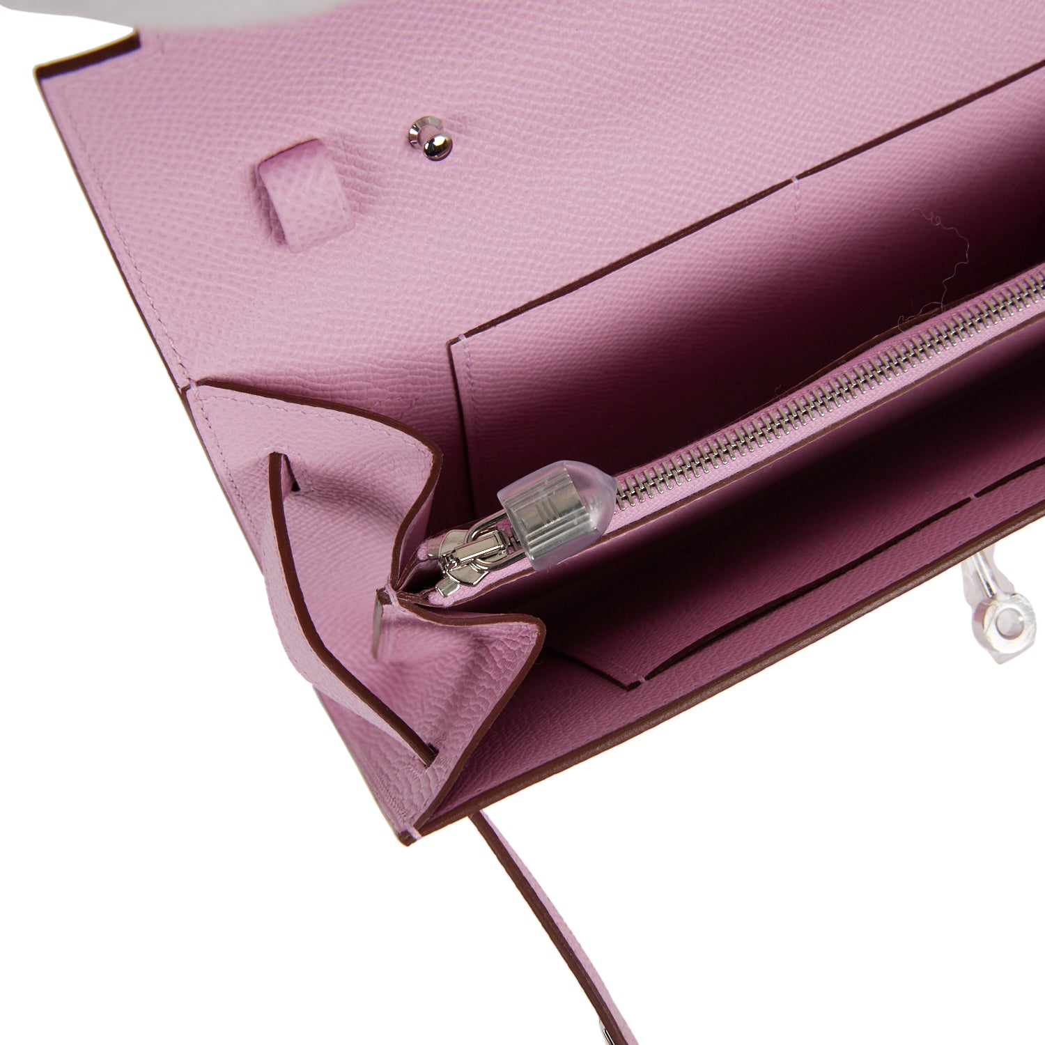This Kelly Wallet To Go is in Mauve Sylvestre epsom leather with palladium hardware and has tonal stitching, two straps with front toggle closure and removable crossbody strap.