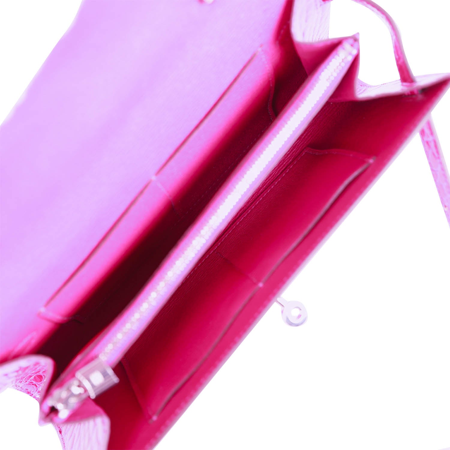 This Kelly Wallet To Go is in Rose Scheherazade shiny alligator with palladium hardware and has tonal stitching, two straps with front toggle closure and removable crossbody strap.
