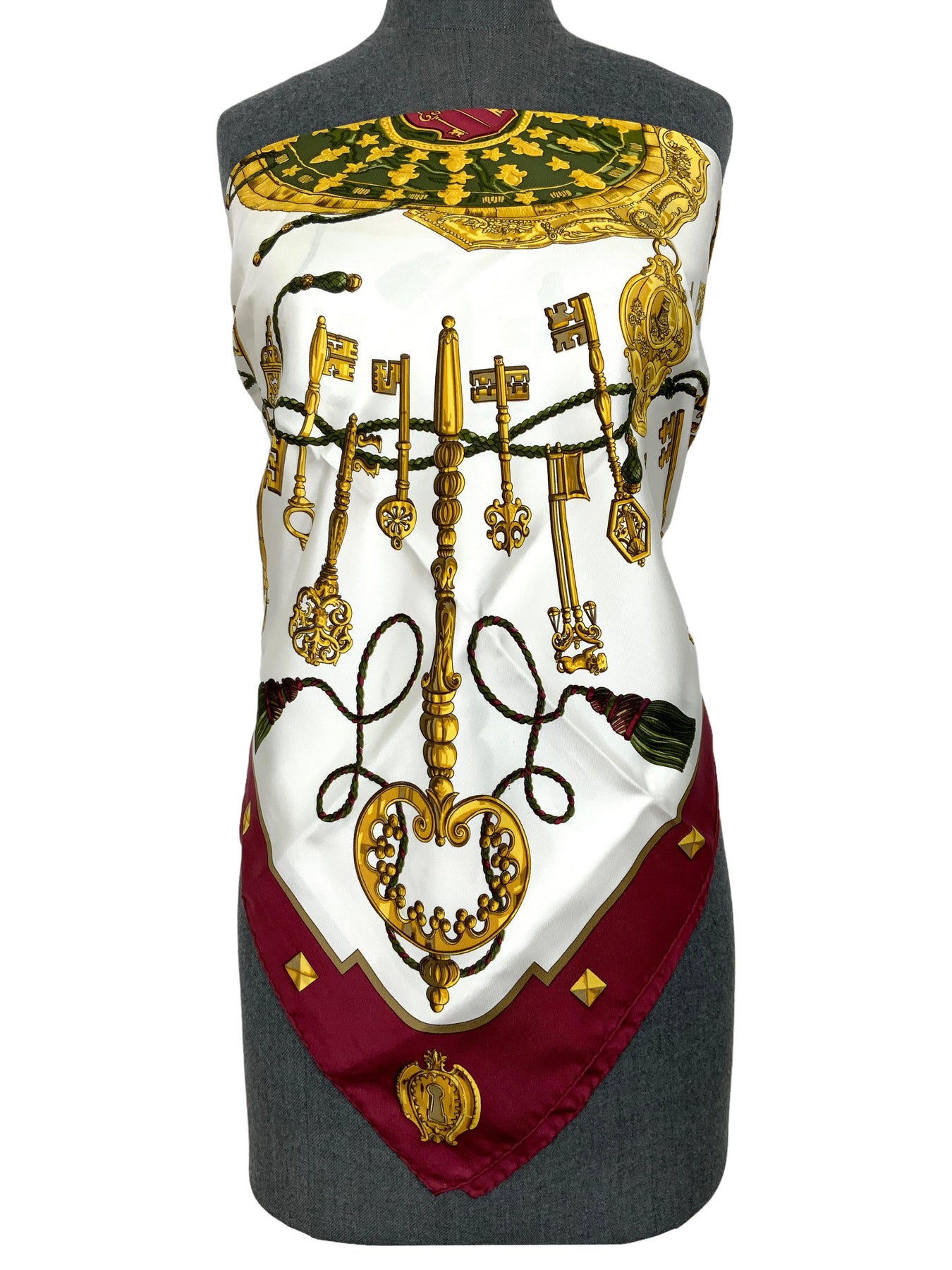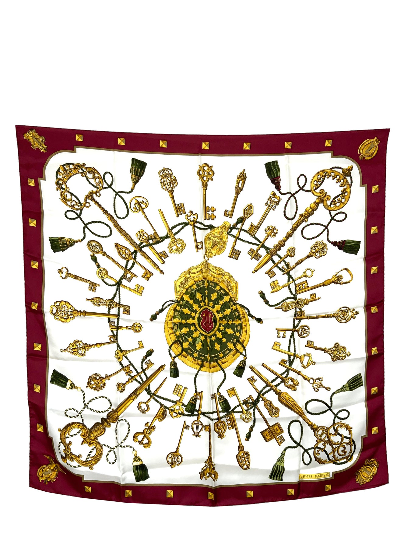 We the ity of this classic Hermes Keys Les Cles Silk Scarf 90 designed by Caty Latham and was first issued in 1965 which translates to "The Keys". This scarf shows a beautiful graphic design of golden keys on a lovely burgundy and white silk background with hand-rolled edges.