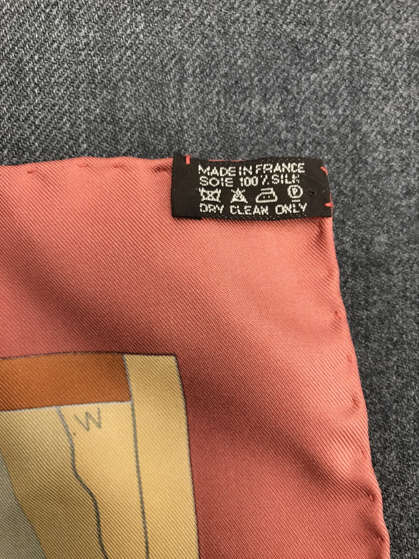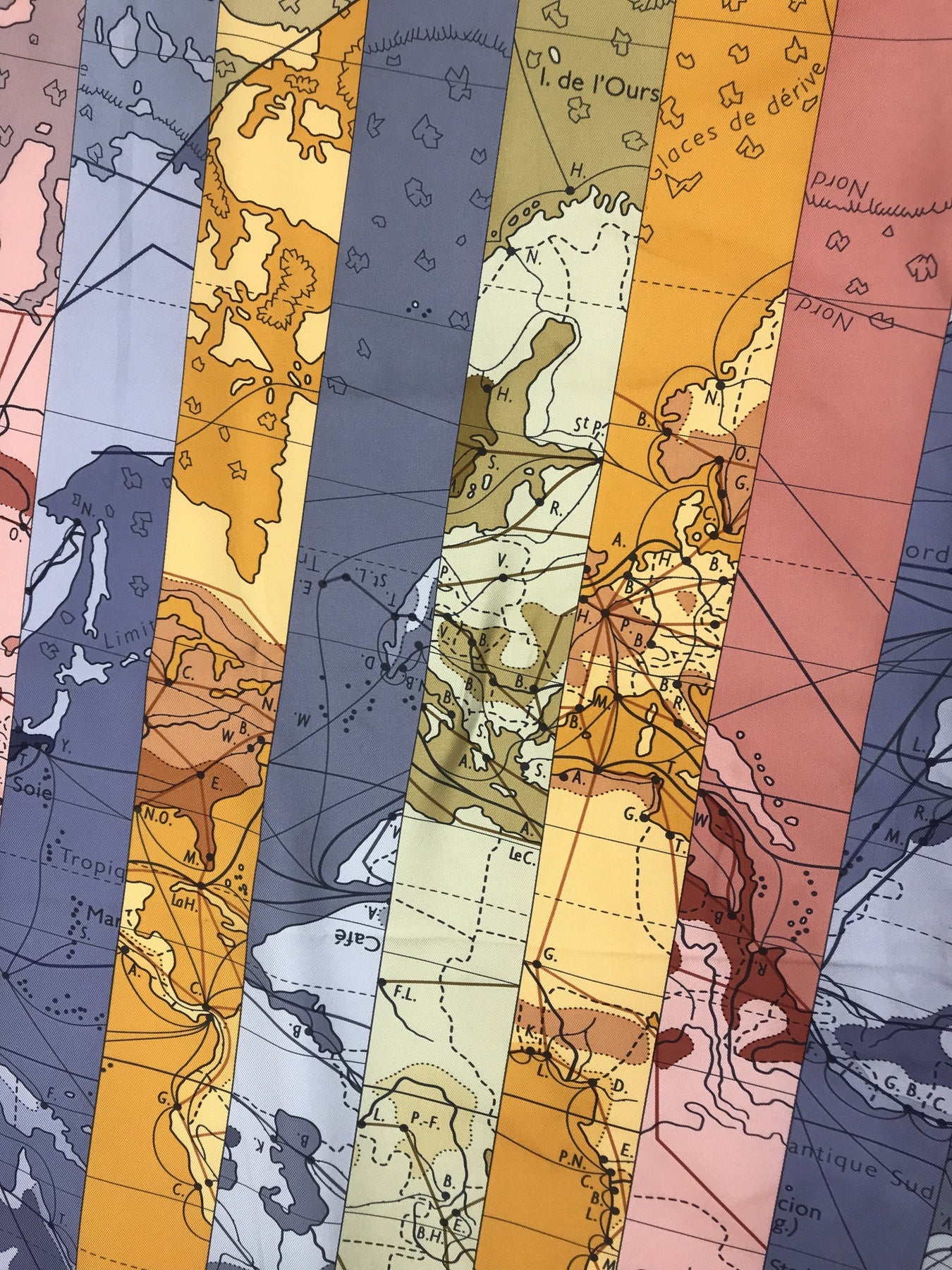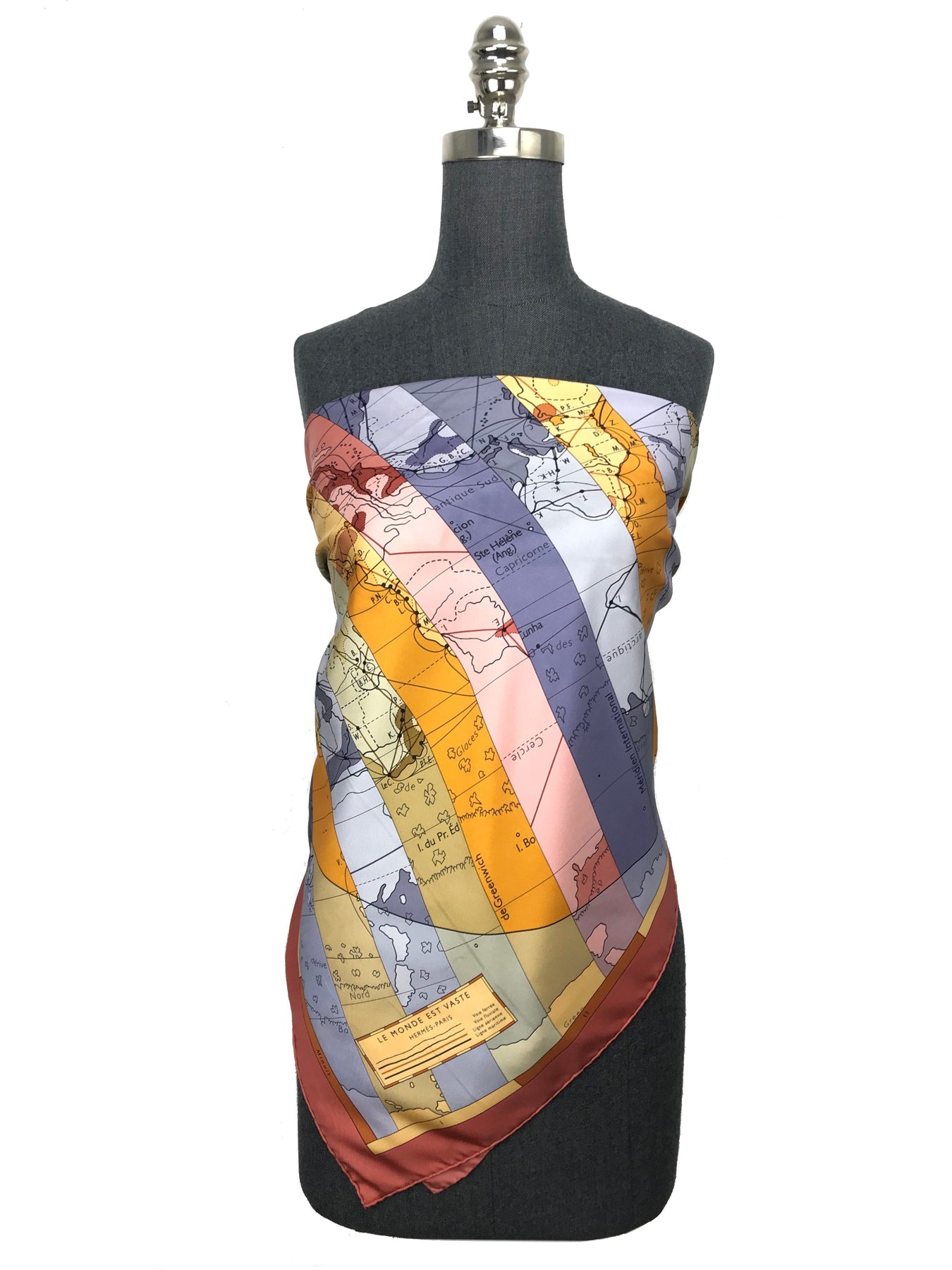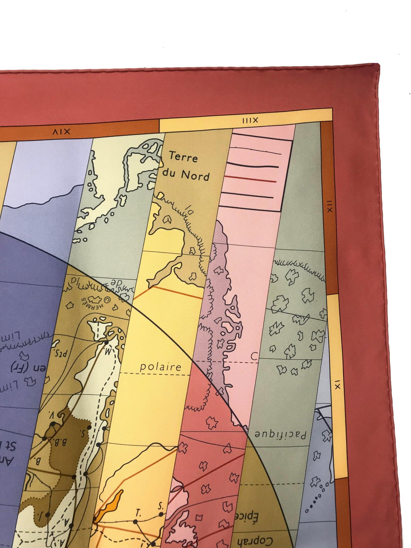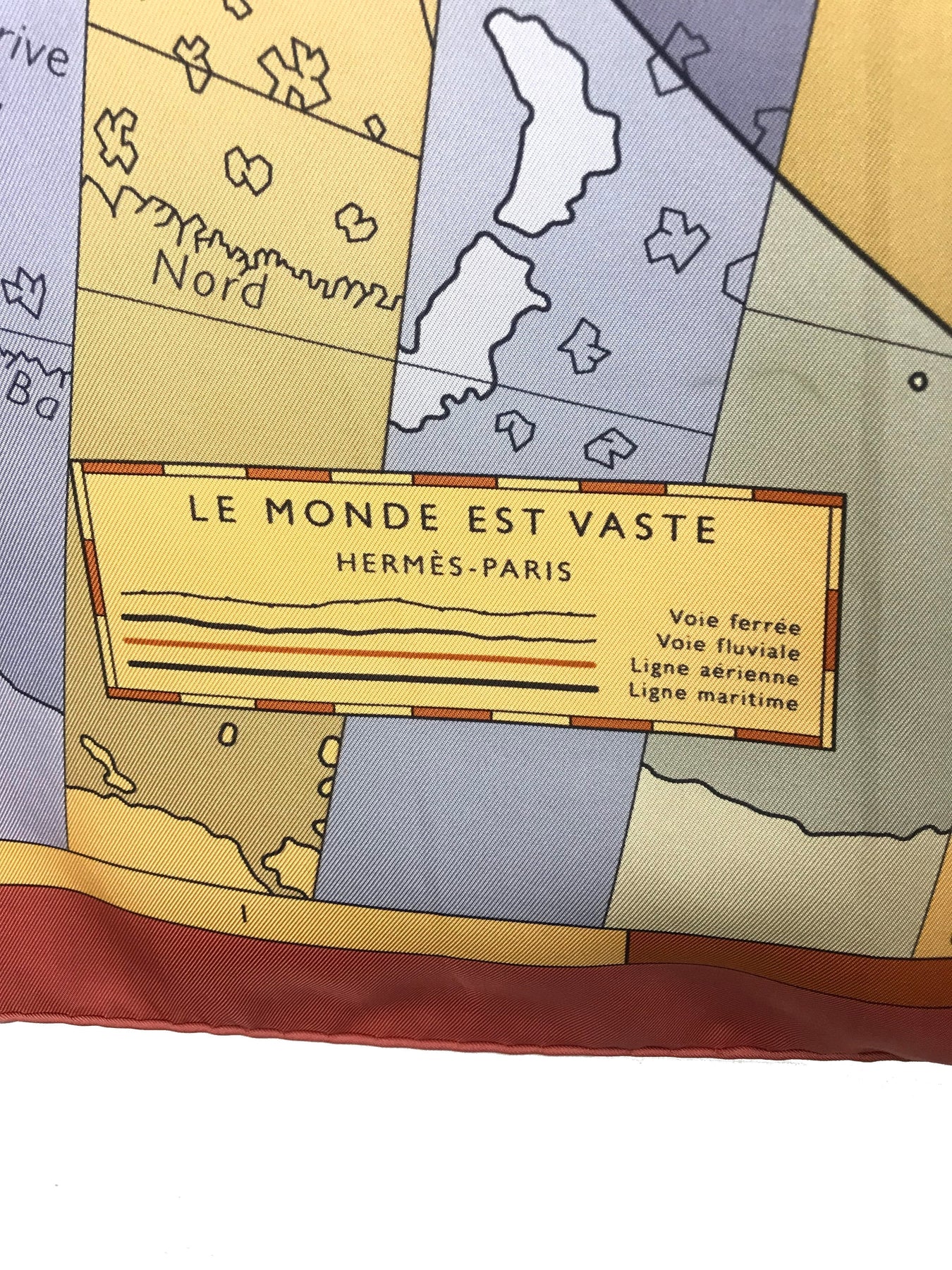 We the ity of this chic Hermes Le Monde Est Vaste Silk Scarf 90 designed by Cyrille Diatkine which translates to "The World is Cast". This scarf shows a beautiful graphic design of a multicolored map with various locations on a rust-toned background with hand-rolled edges.