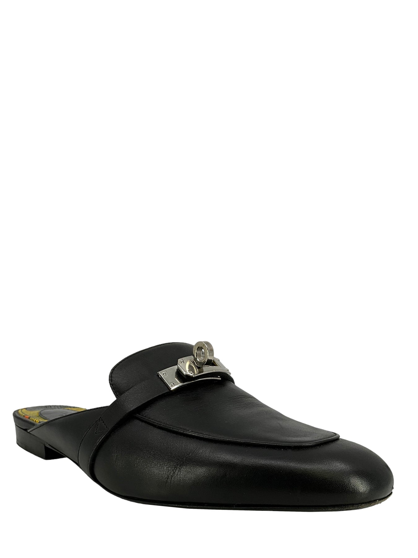 We ity of these gorgeous HERMES Leather OZ Turn-Lock Mules Size 7.5 I IT 37.5, Crafted from black calfskin. These beautiful clogs feature a 0.5" stacked wooden heel and a crossover strap with a polished palladium turn lock.