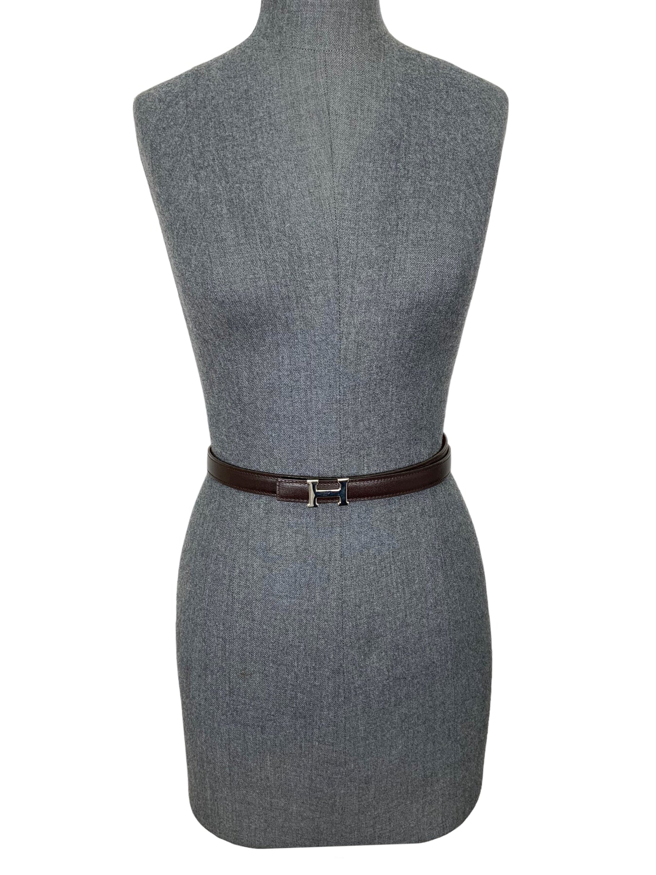 This is an Hermes Thin Leather Reversible H Belt Size 80 crafted from smooth brown leather with a reverse of pebbled orange calfskin. This highly sought-after belt features a palladium plated signature 'H' buckle.
