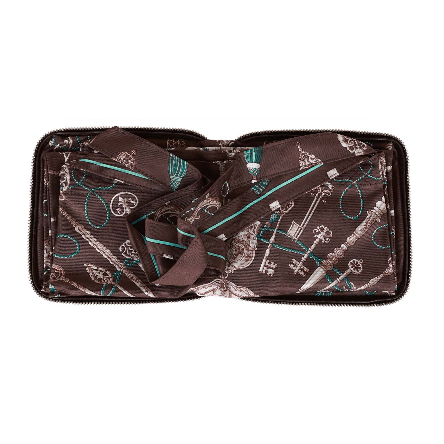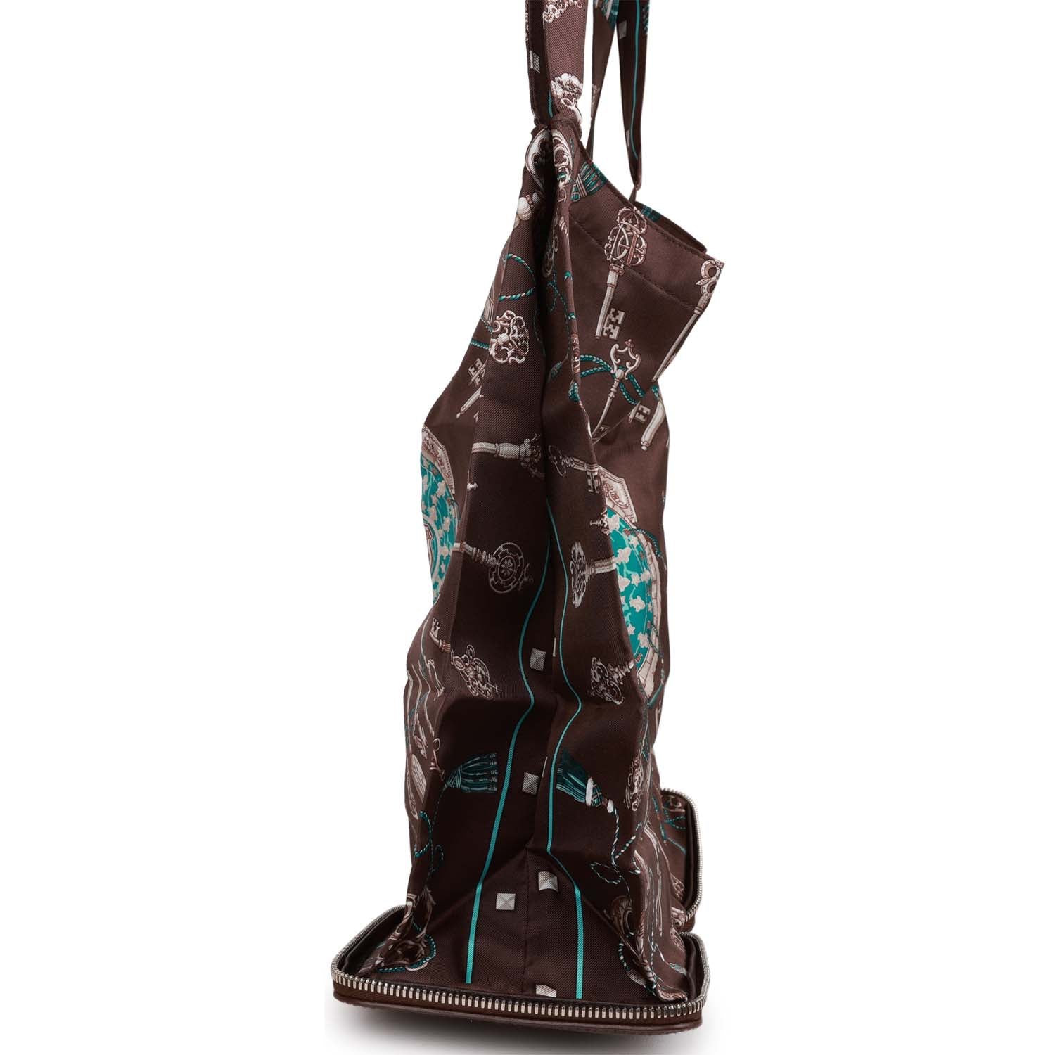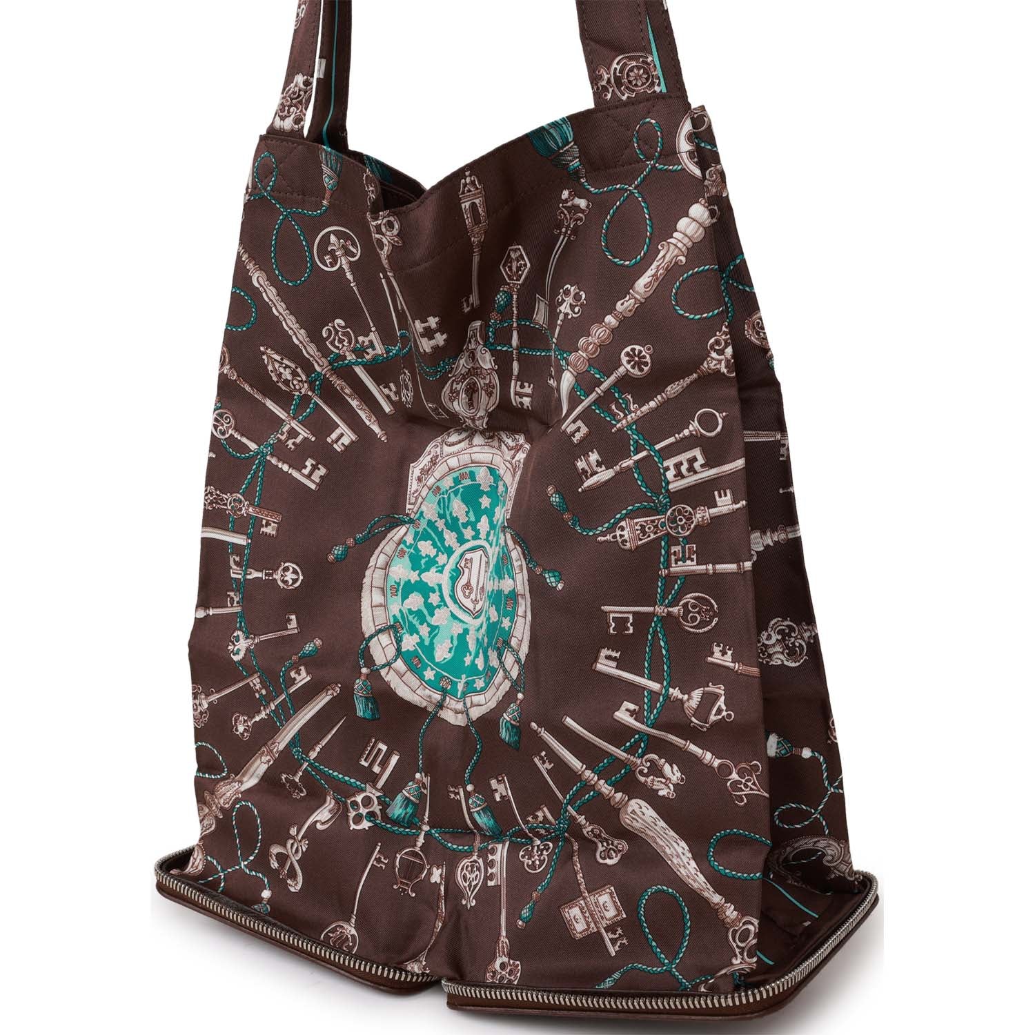This Silky Pop Tote is in the "Les Cles" style in a Chocolate colorway in a Chocolate Evercolor pouch with Palladium hardware and has tonal stitching, zip around closure, and two shoulder straps in printed silk fabric.