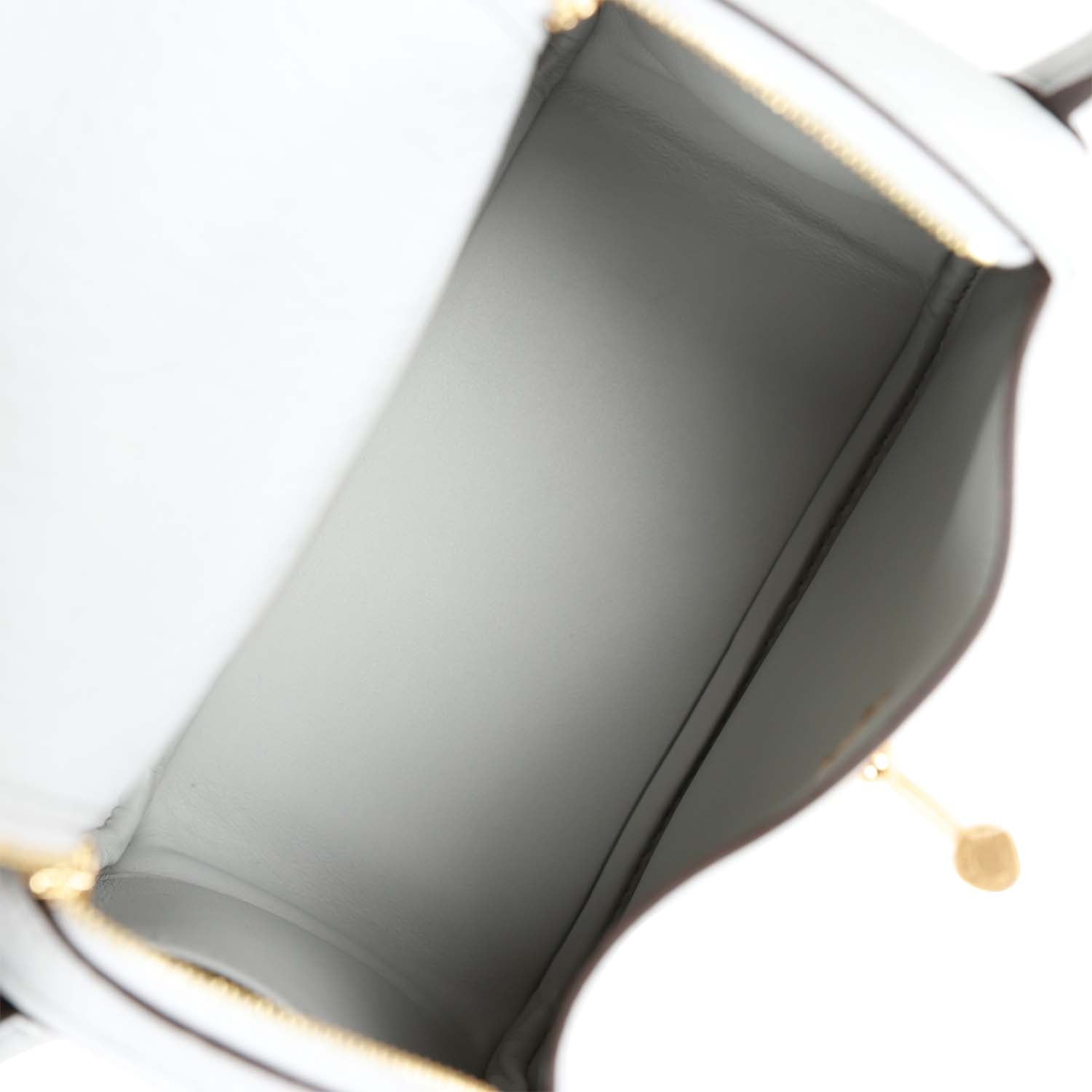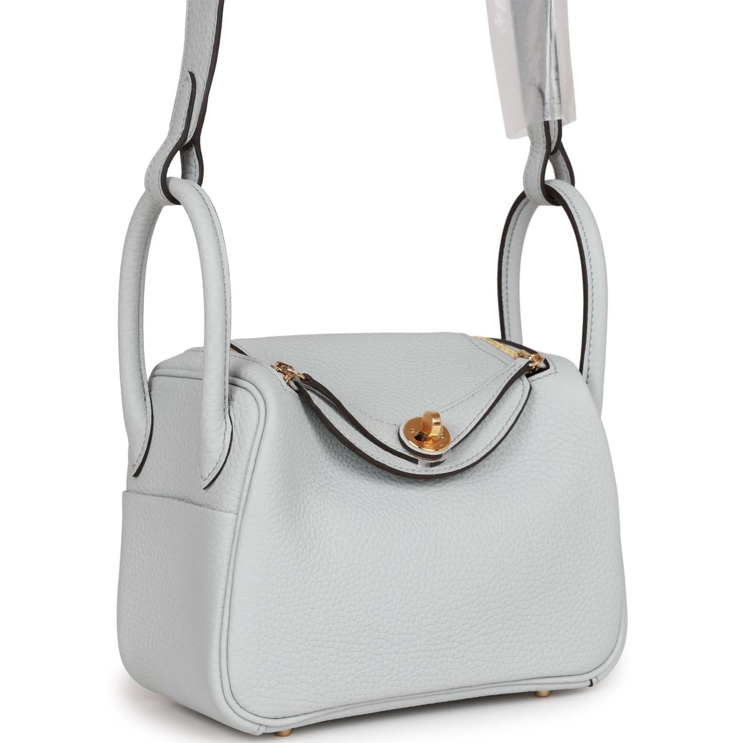This Mini Lindy is in Bleu Pale clemence leather with gold hardware and has tonal stitching, double zipper pulls, front Hermès twist lock, single pocket on each side, two rolled top handles linked by a flat shoulder strap.