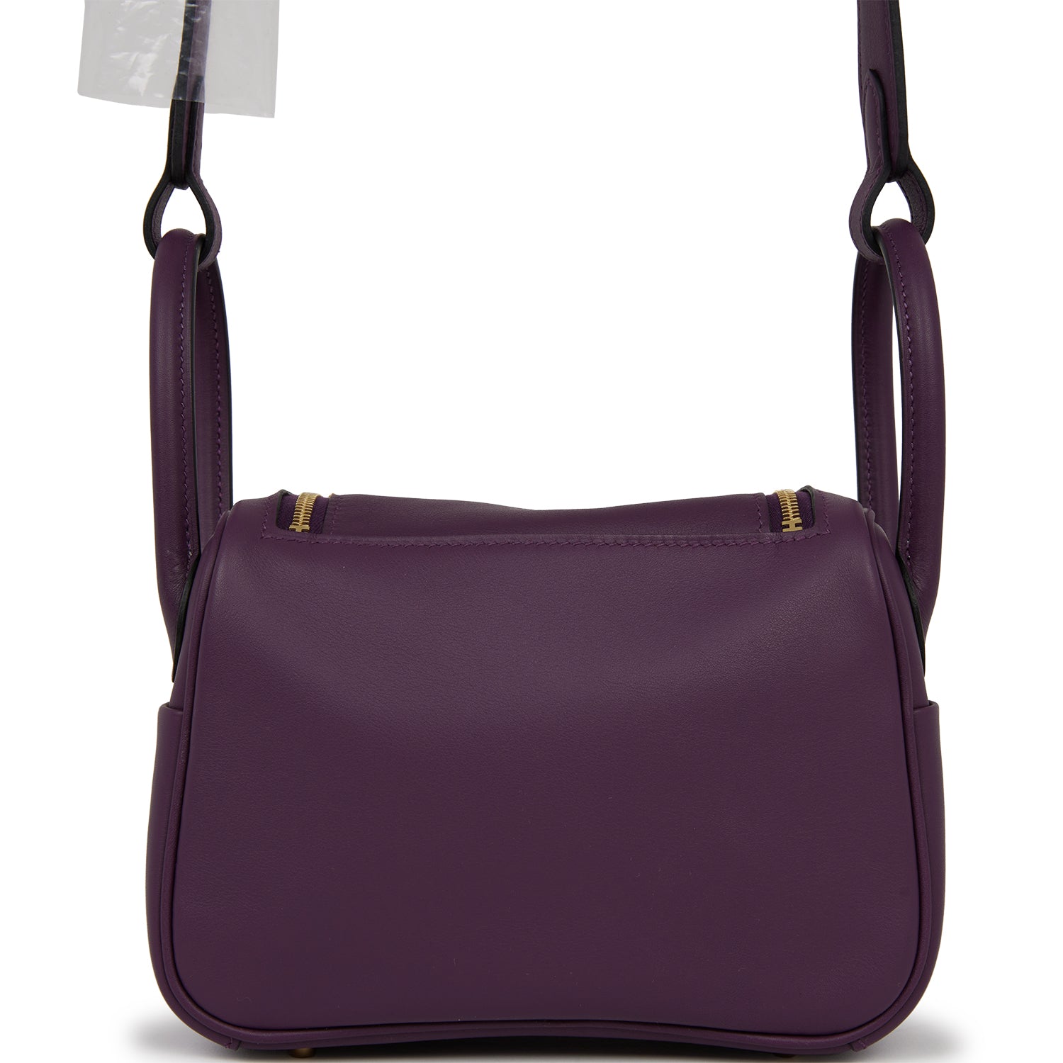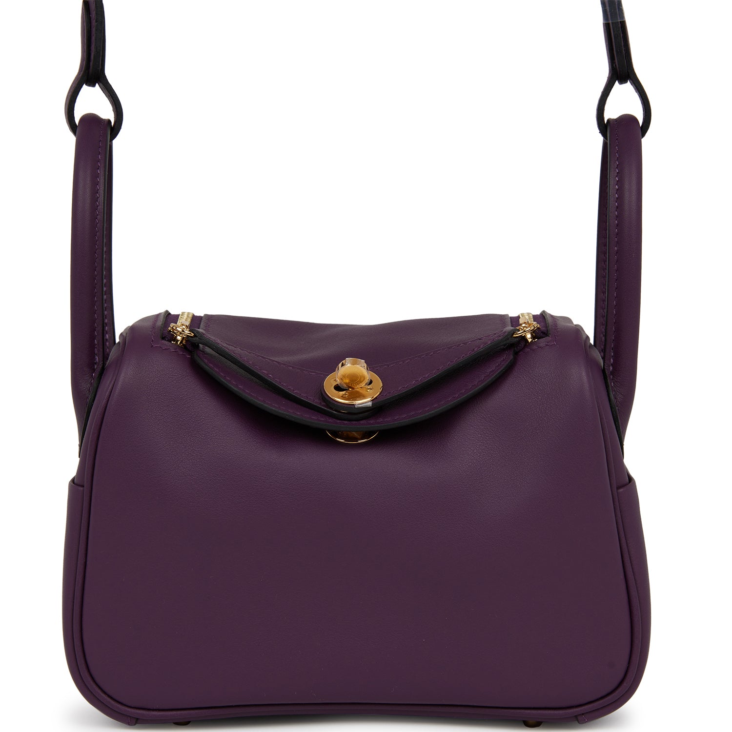This Mini Lindy is in Cassis swift leather with gold hardware and has tonal stitching, double zipper pulls, front Hermès twist lock, single pocket on each side, two rolled top handles linked by a flat shoulder strap.