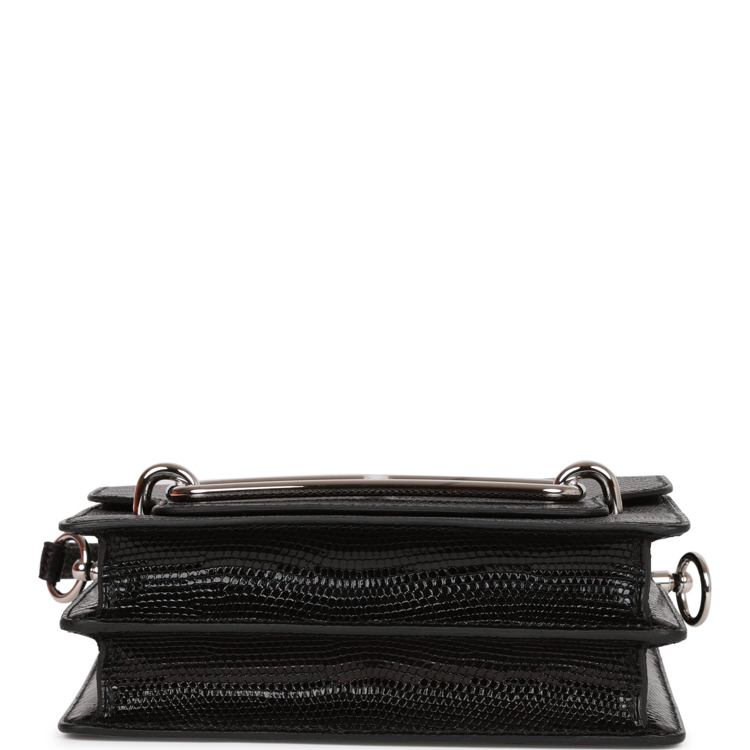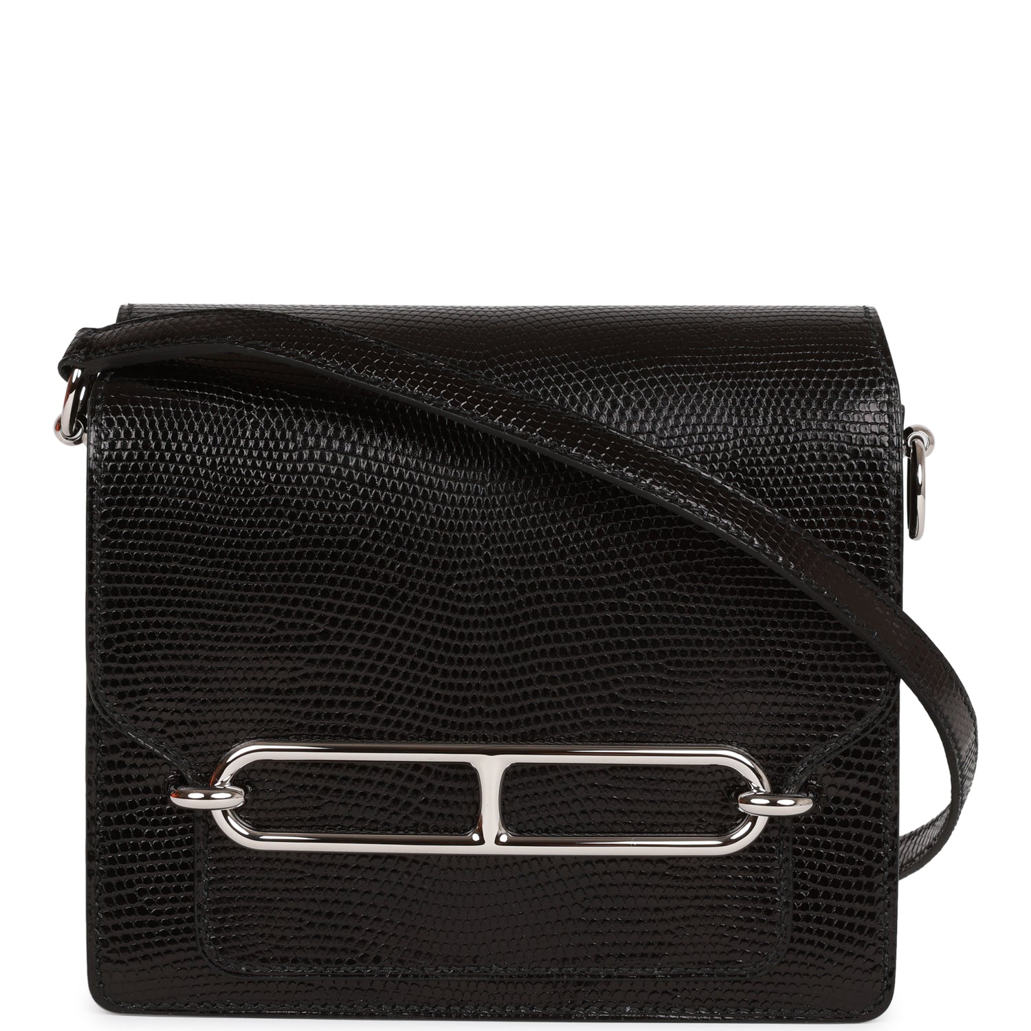 This Mini Sac Roulis is of black lizard with palladium hardware and features tonal stitching, front flap and crossbody strap .