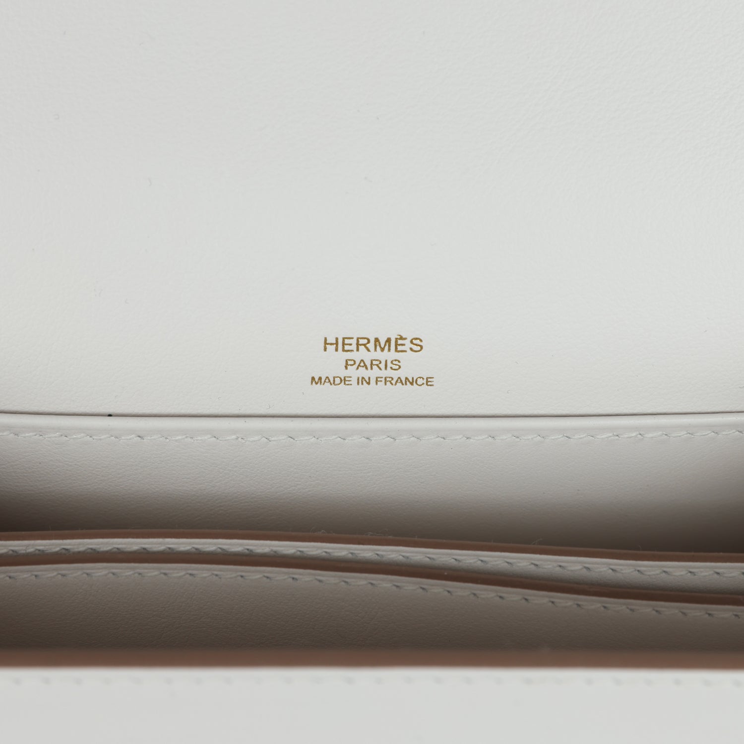 The interior is lined with Gris Pale lambskin leather and has a center divide and one slip pocket on the back wall.