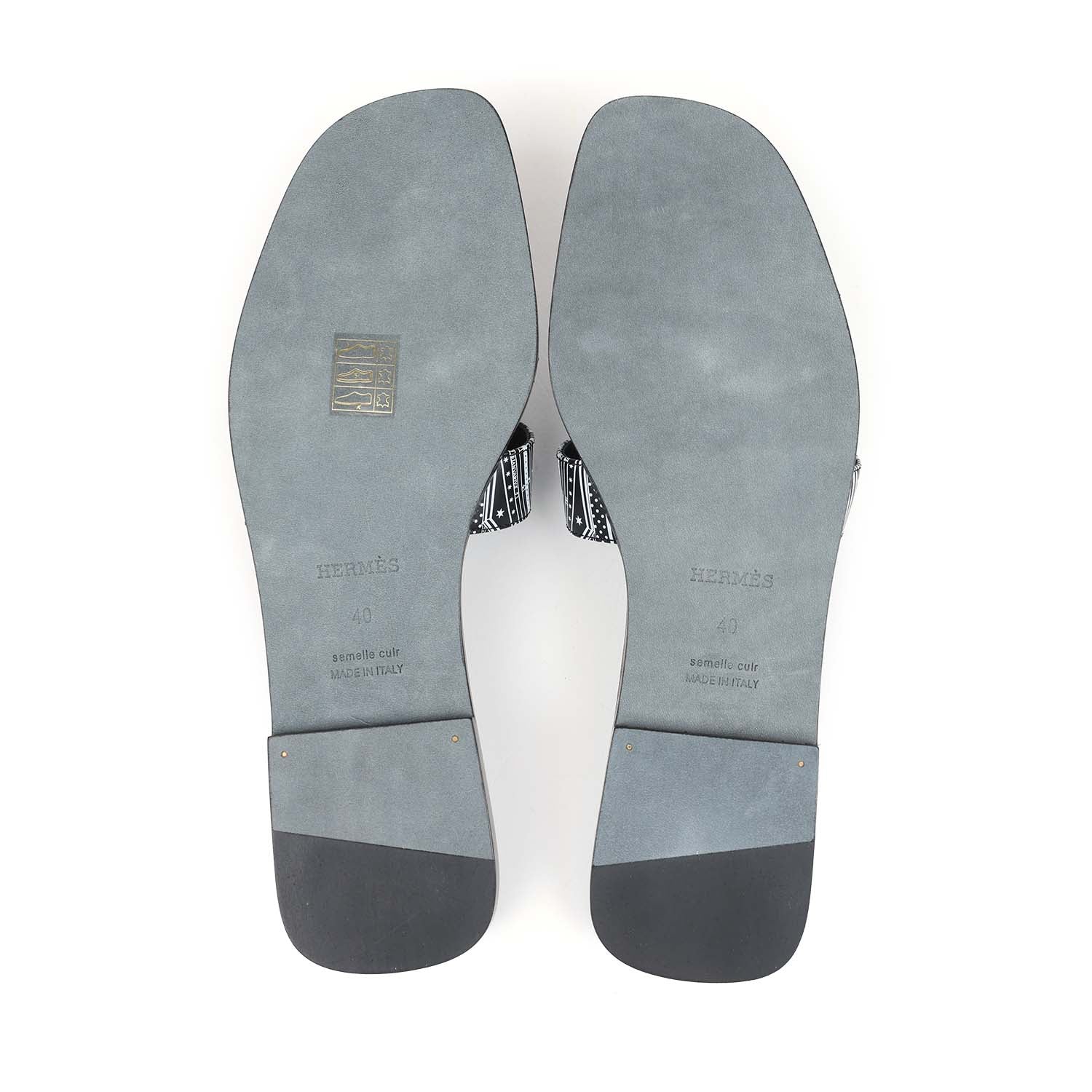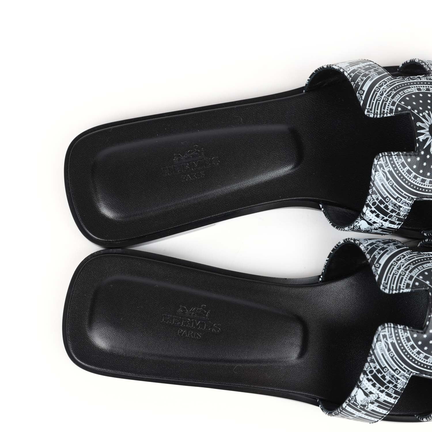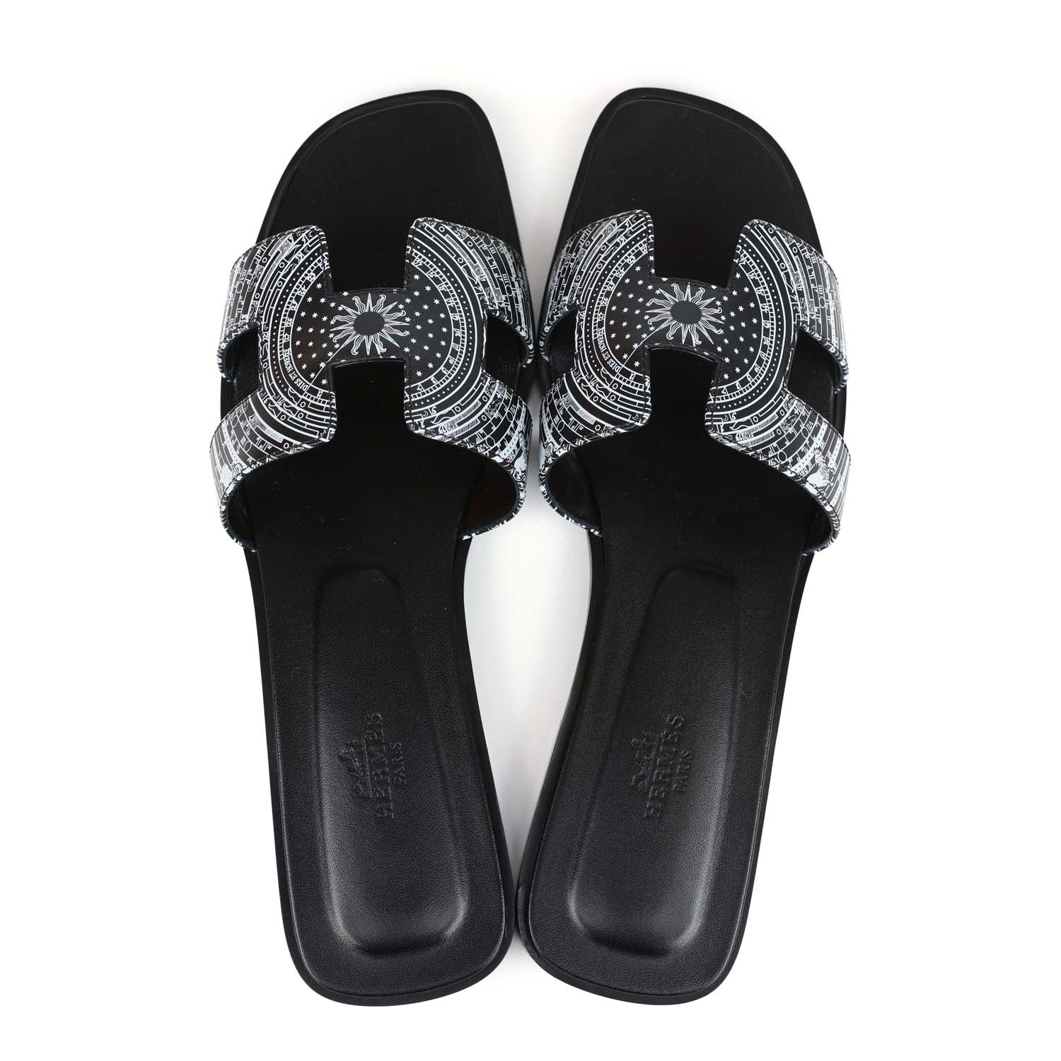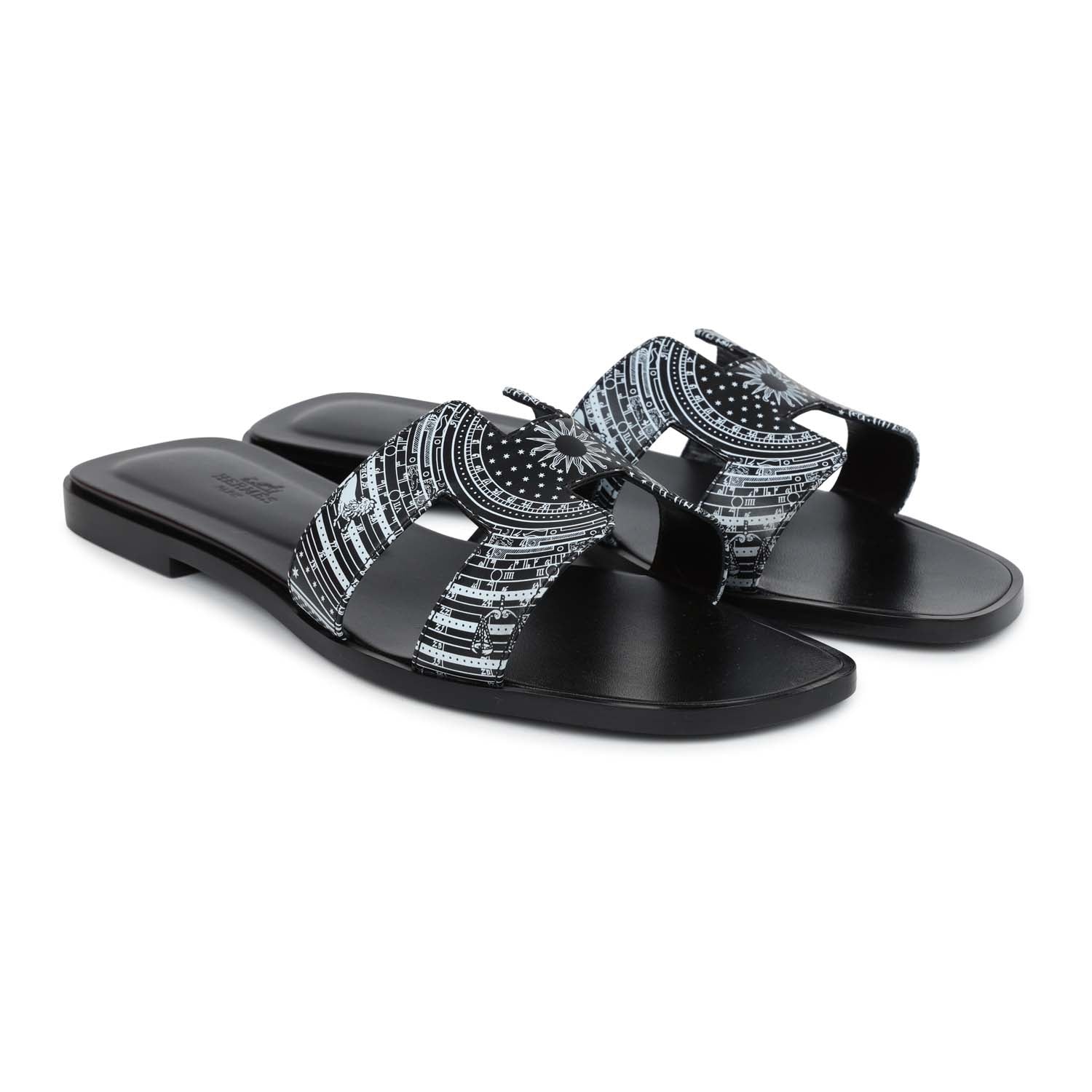 pair of Hermes Oran sandals are of black and white calfskin leather, "Astrologie Bandana" print H cutout detail, natural leather insole, natural leather sole, in size 40 EU.