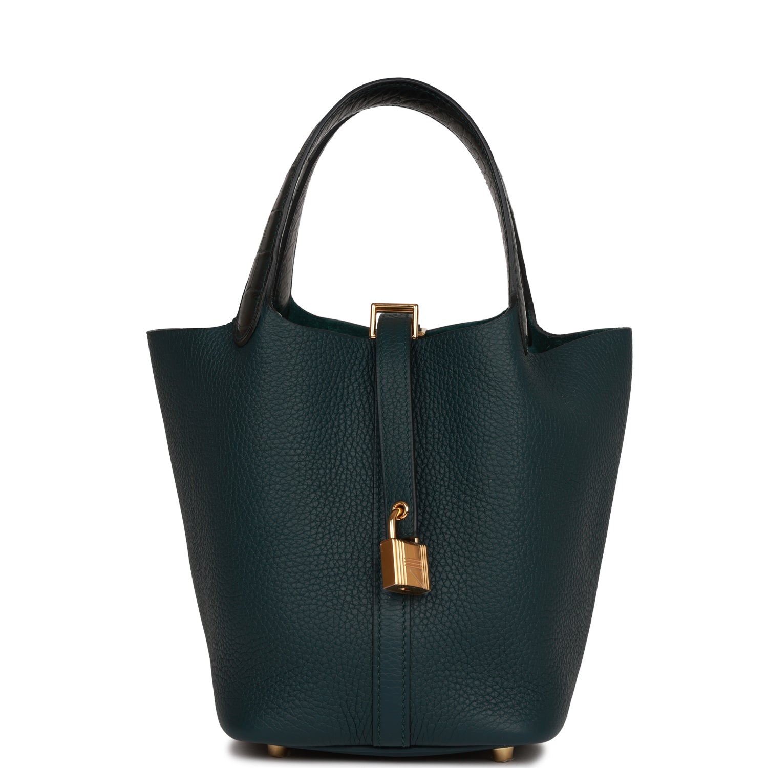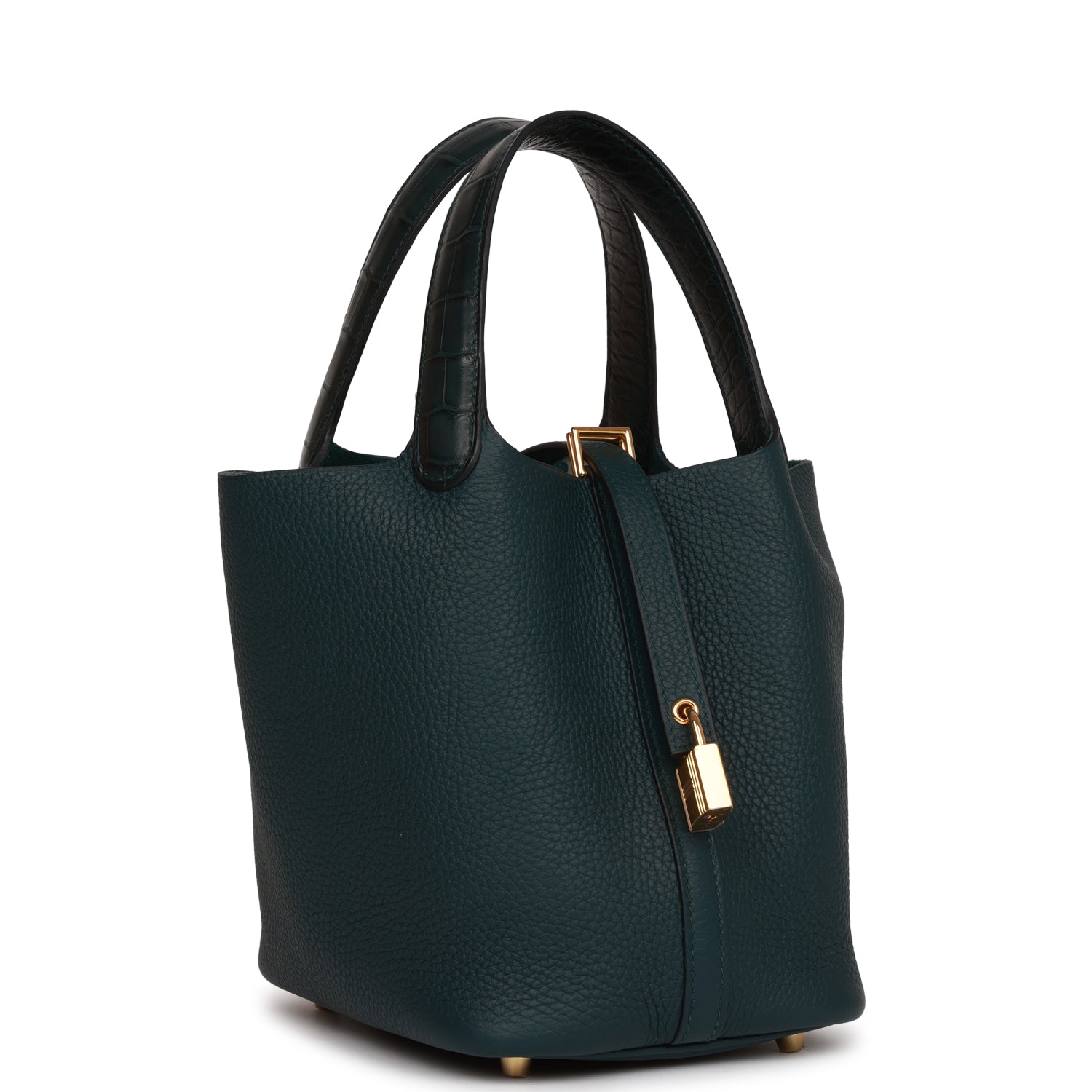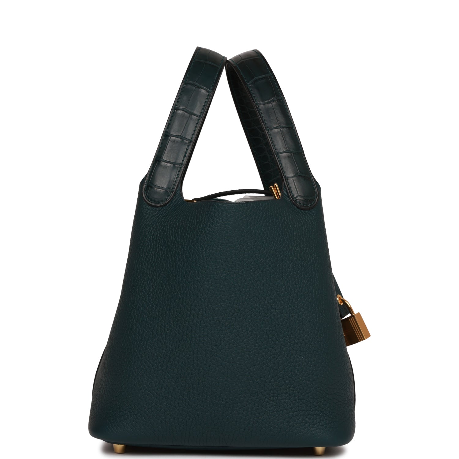 This Picotin Lock is in Vert Cypres matte alligator and clemence leather with gold hardware and has tonal stitching with two top handles.