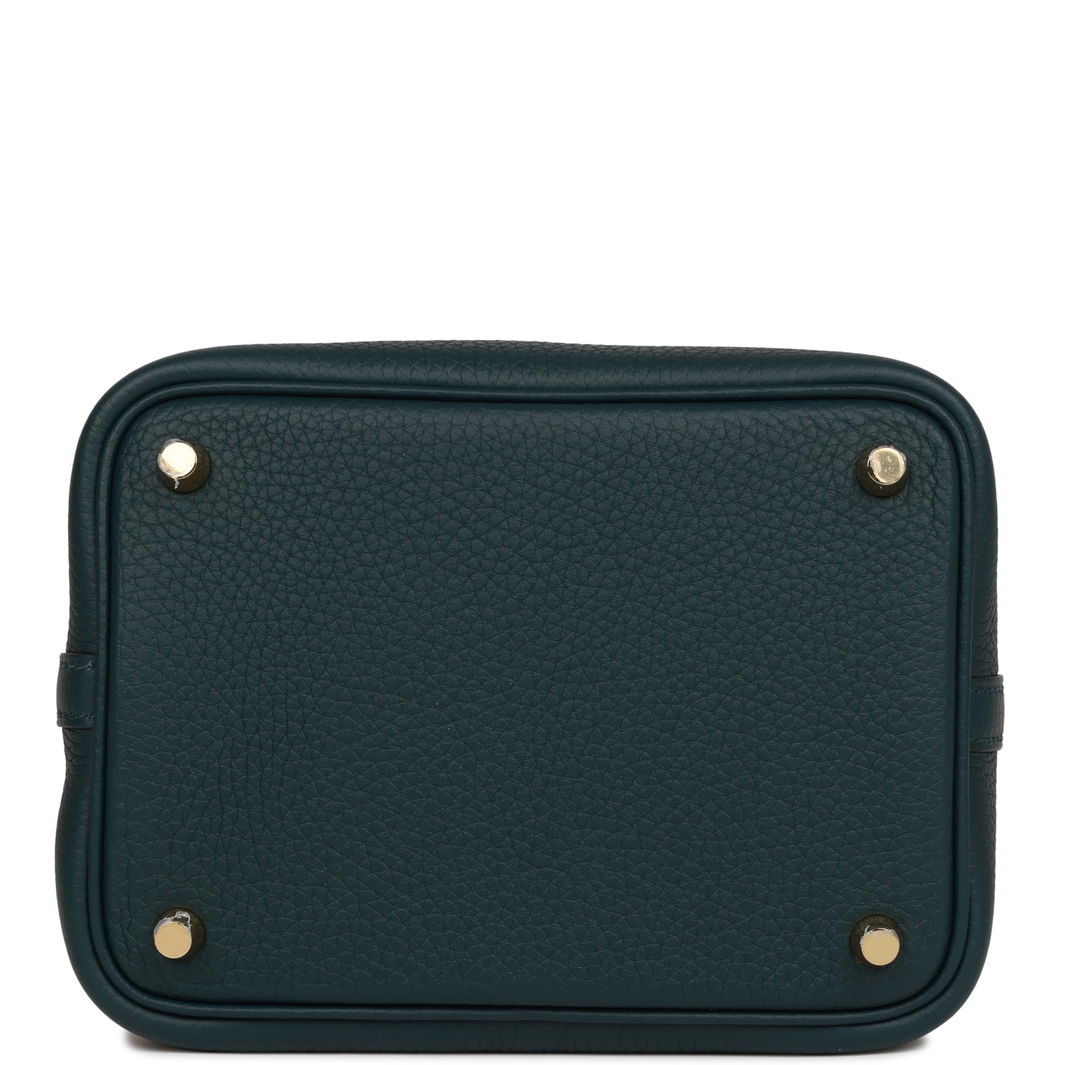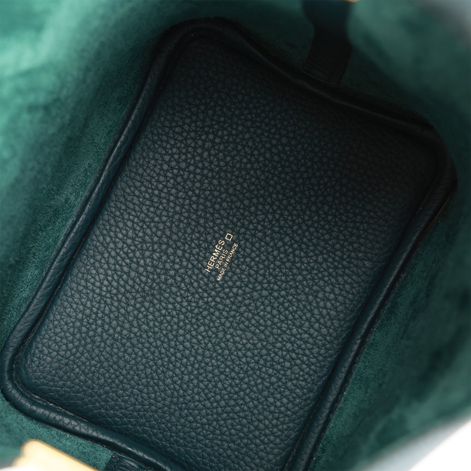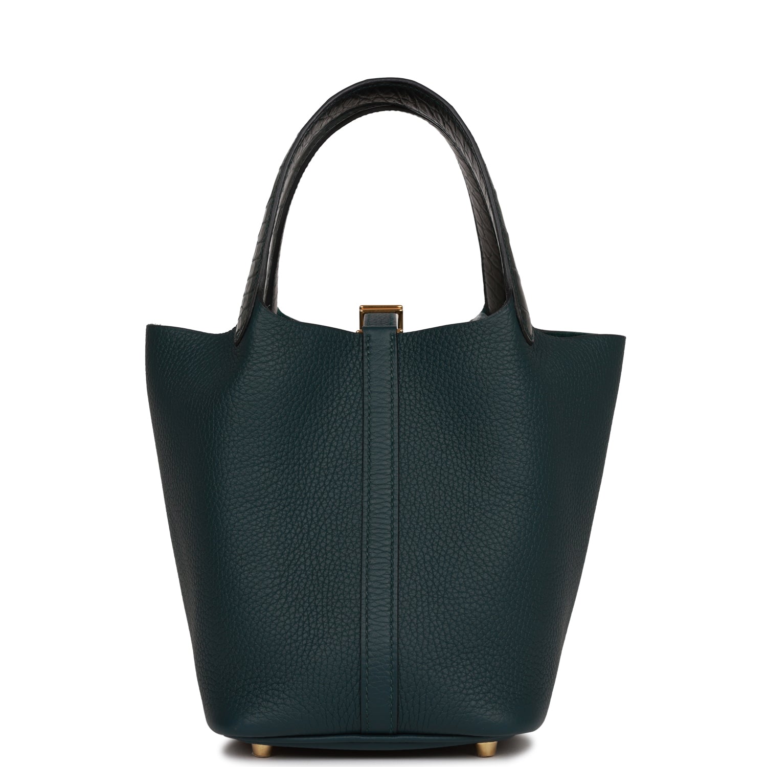This Picotin Lock is in Vert Cypres matte alligator and clemence leather with gold hardware and has tonal stitching with two top handles.
