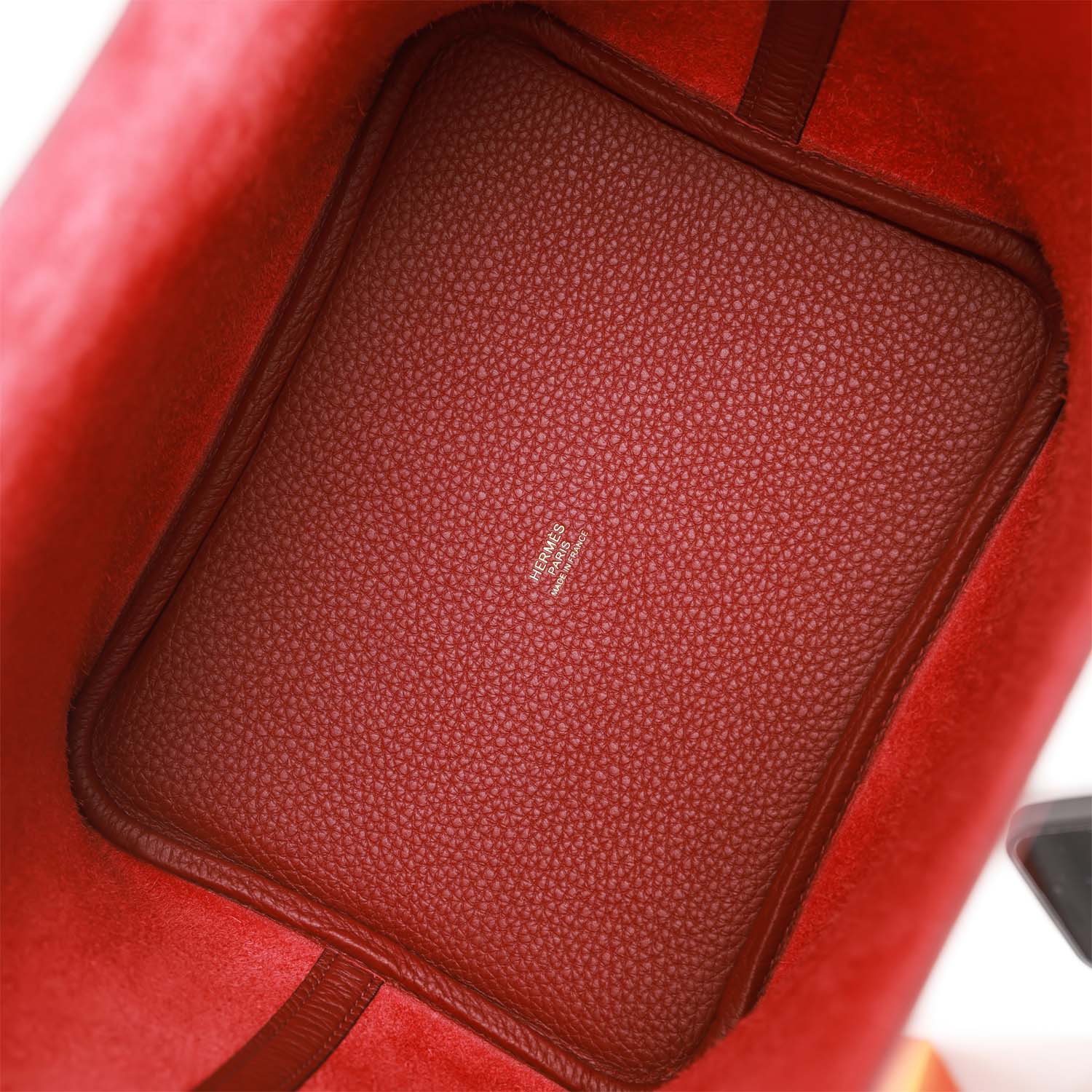 The interior is lined with Rouge H natural leather, no interior pockets and has a pull through closure secured by padlock.