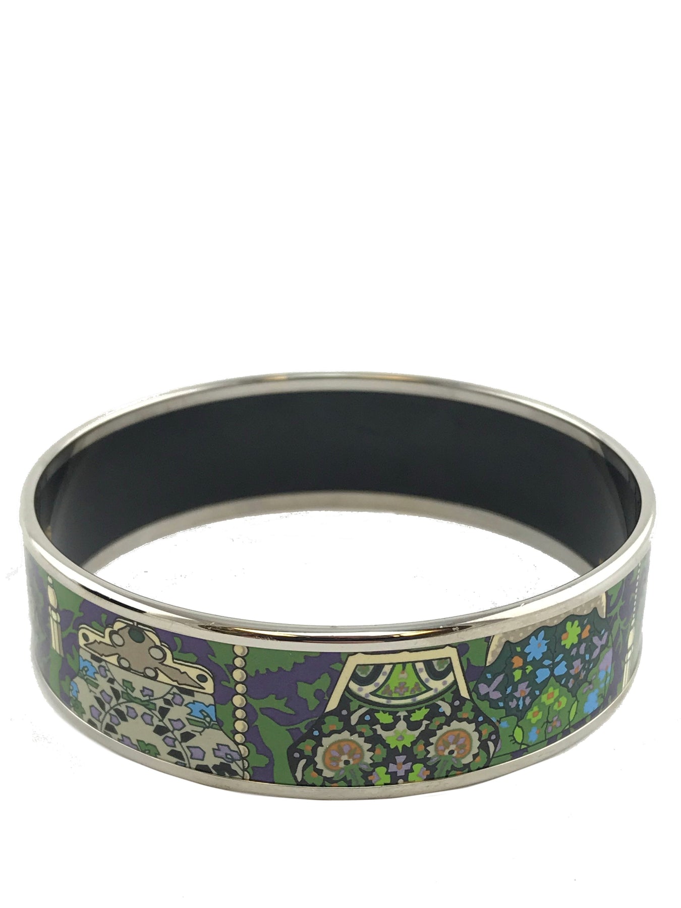 d ! Hermes Printed Enamel Cachemire de Tamara Wide Bracelet 65 featuring a beautiful graphic of various evening bags on a green colored background with a palladium plated rim.