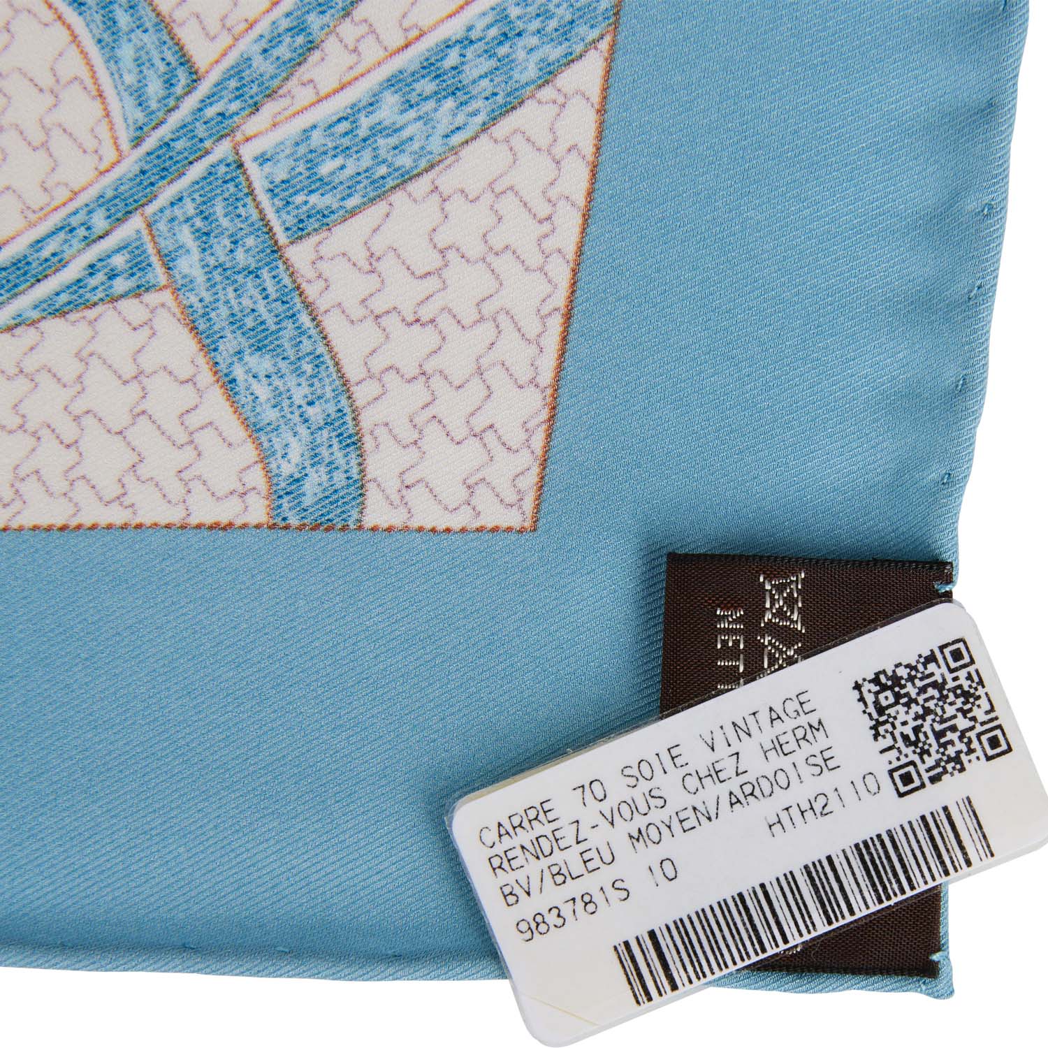 Hermes "Rendez-Vous Chez" silk twill scarf designed by Carine Brancowitz in a bleu moyen colorway.