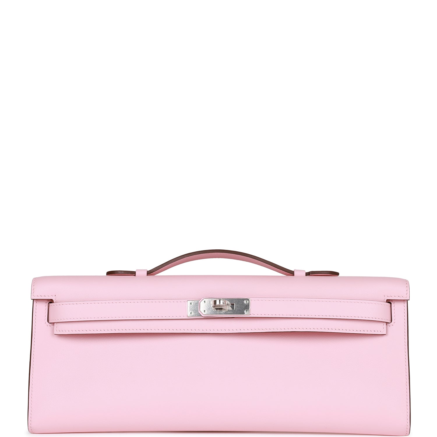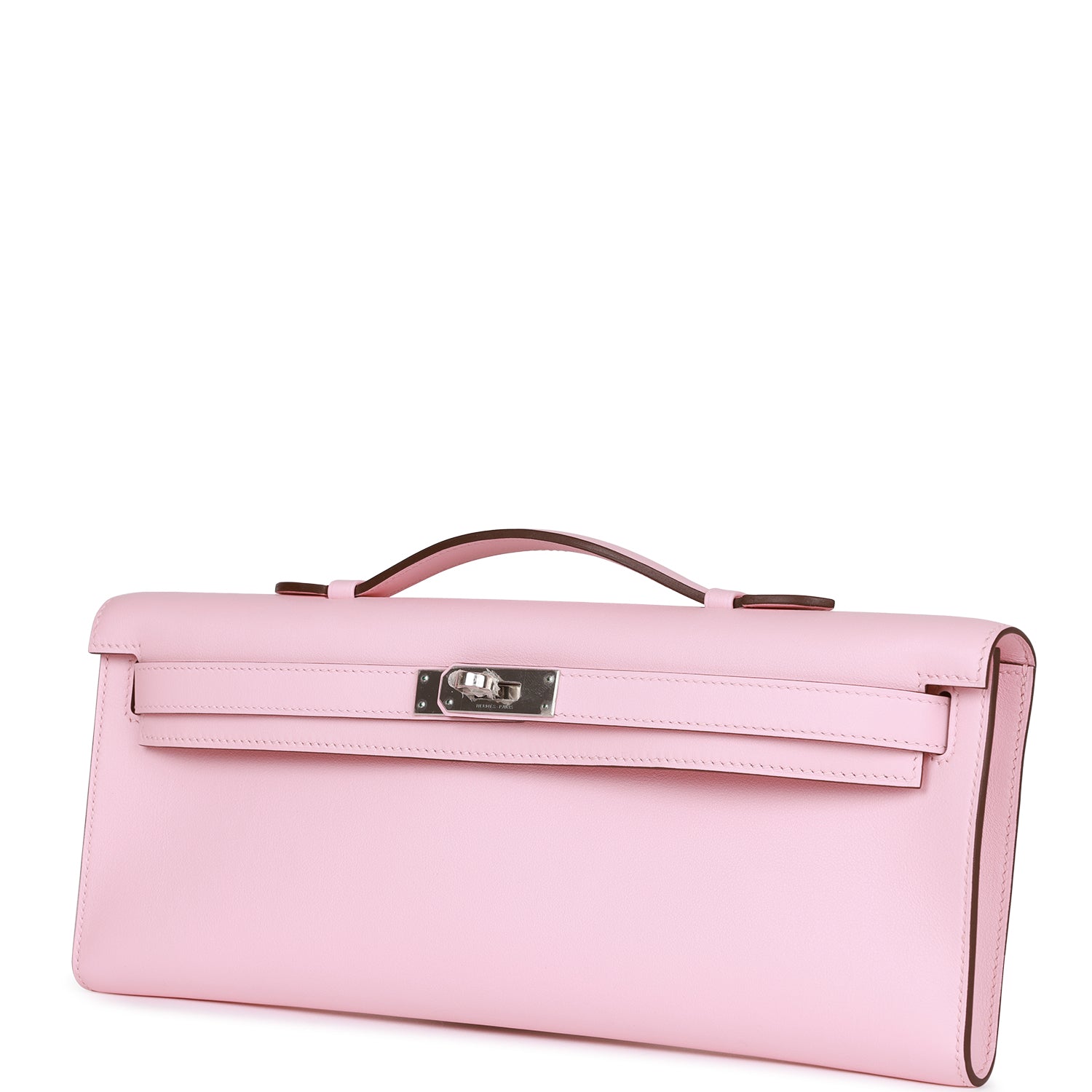 This Kelly Cut wallet is in Rose Sakura swift leather with palladium hardware and has tonal stitching, two straps with front toggle closure and a top flat handle.