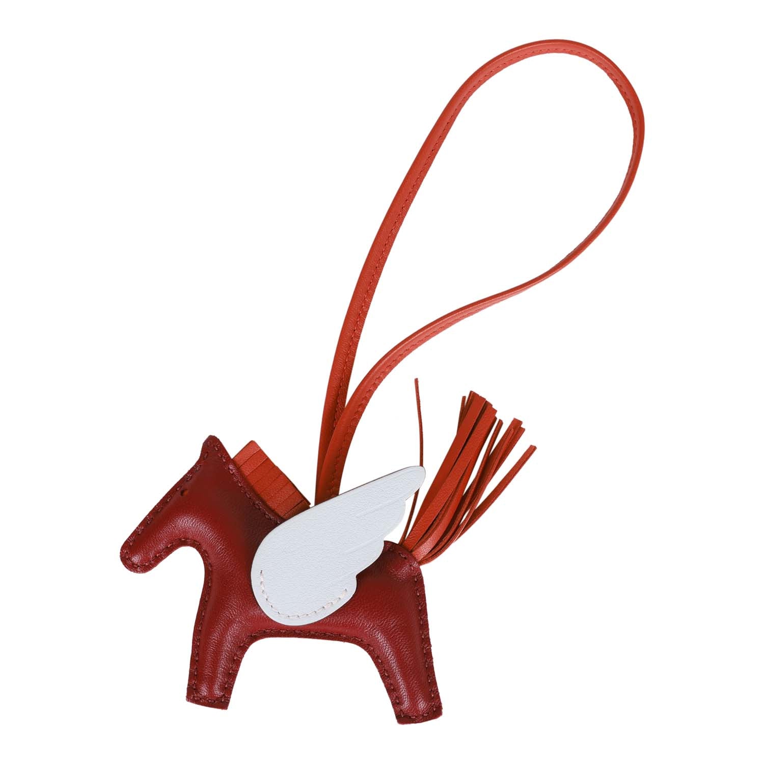 This Pegasus Rodeo bag charm is in Rouge Grenat Milo lambskin leather and accented with a Cornaline mane, tail and holder and Bleu Brume wings.