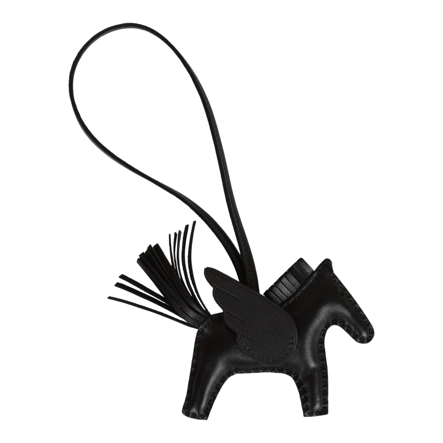 This Pegasus Rodeo bag charm is in Black Milo lambskin leather and accented with a Black mane, tail and holder and Black wings.