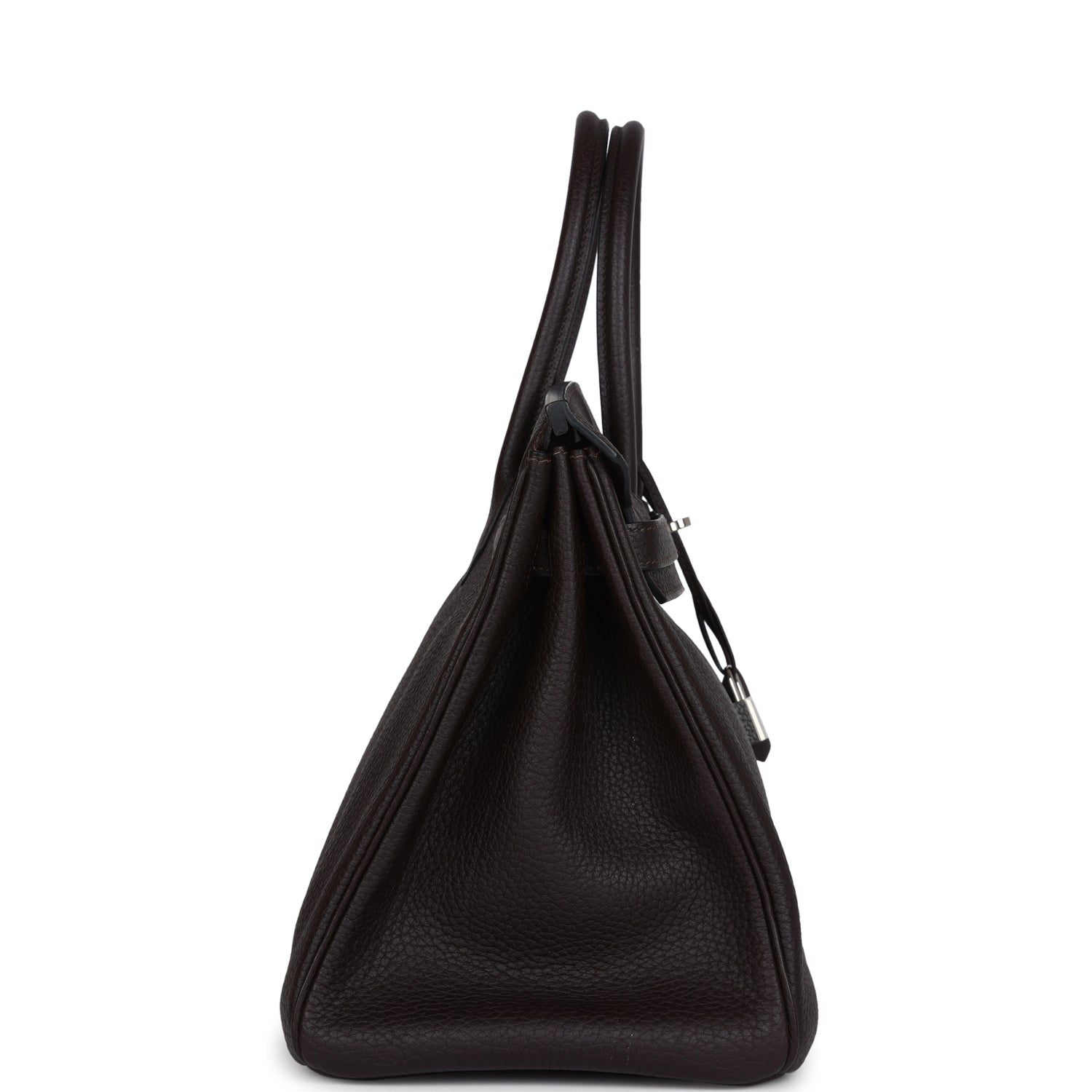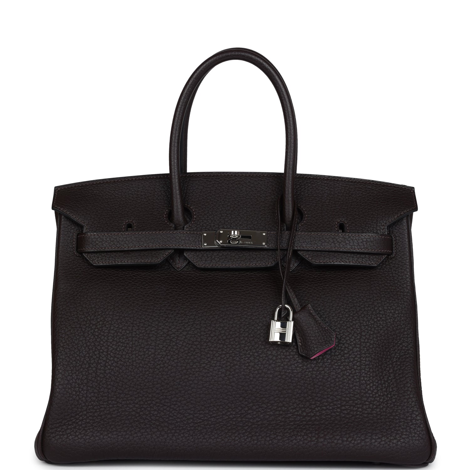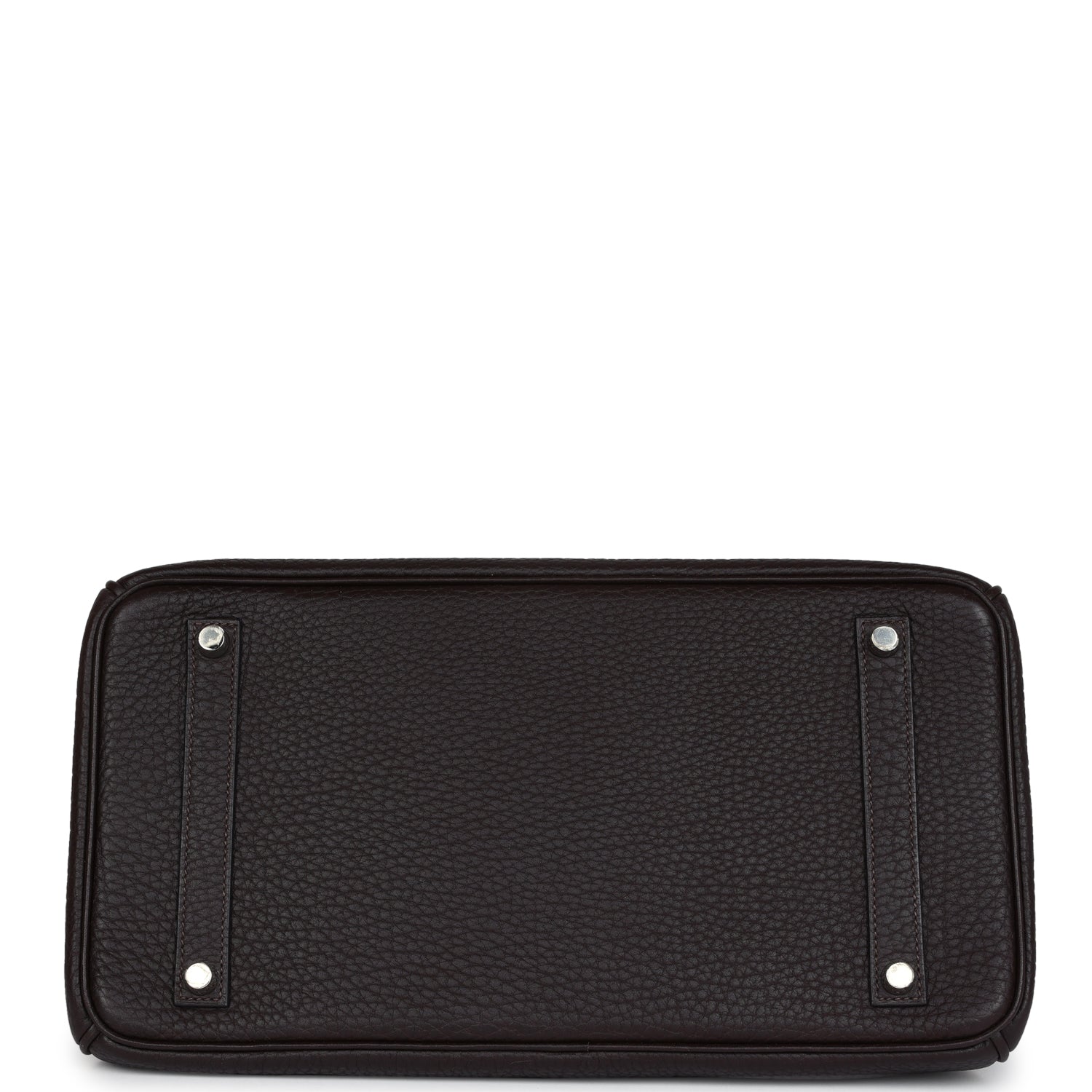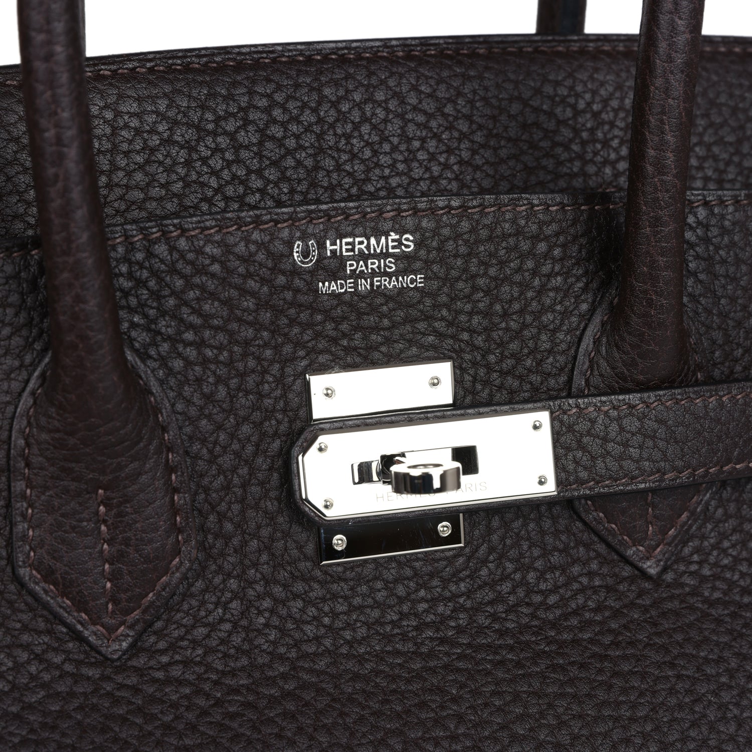 Special Order Verso Birkin is in Ebene Fjord leather with palladium hardware and has tonal stitching, front flap, two straps with center toggle closure, clochette with lock and two keys, and double rolled handles.