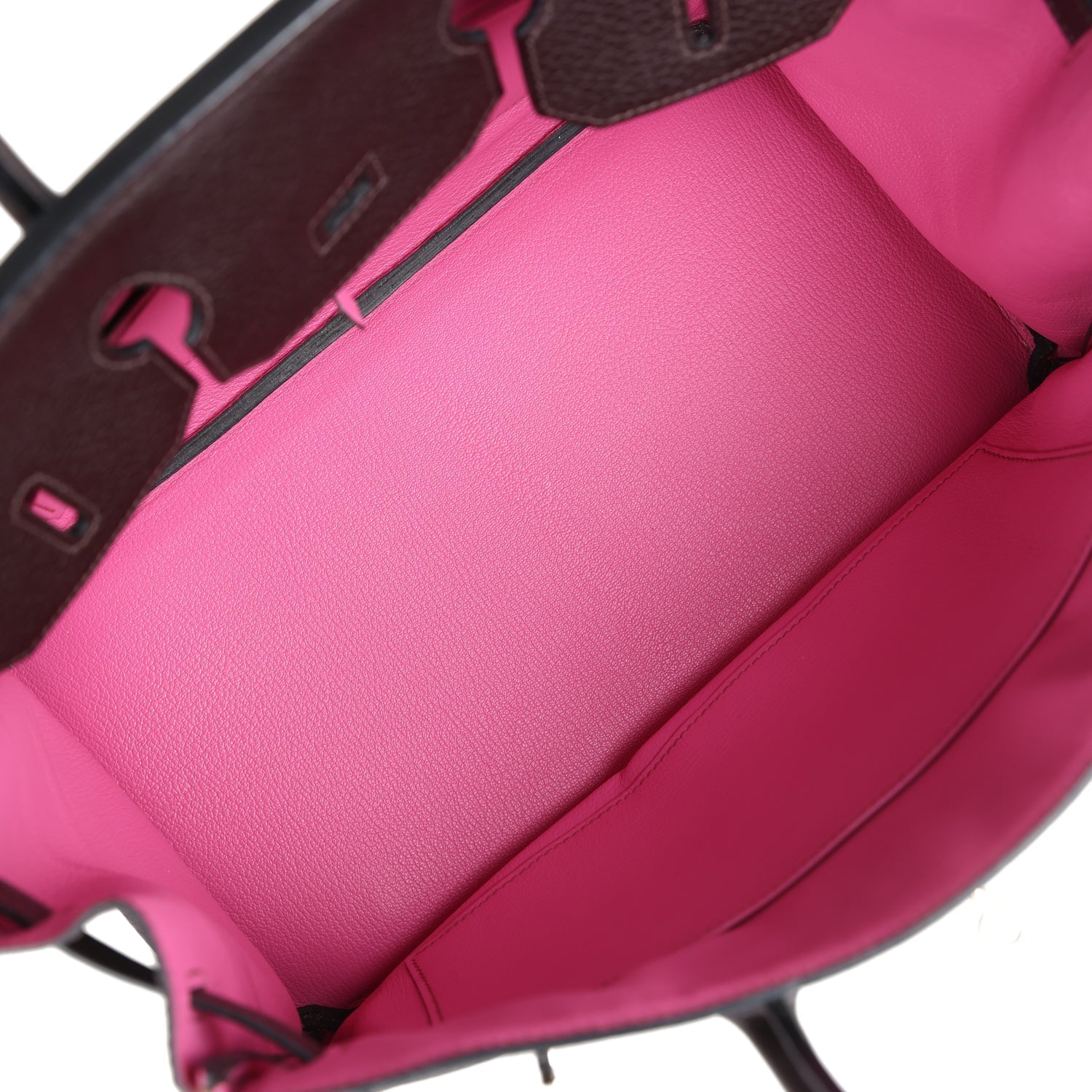 The interior is lined with Rose Shocking chevre and has one zip pocket with an Hermes engraved zipper pull and an open pocket on the opposite side.
