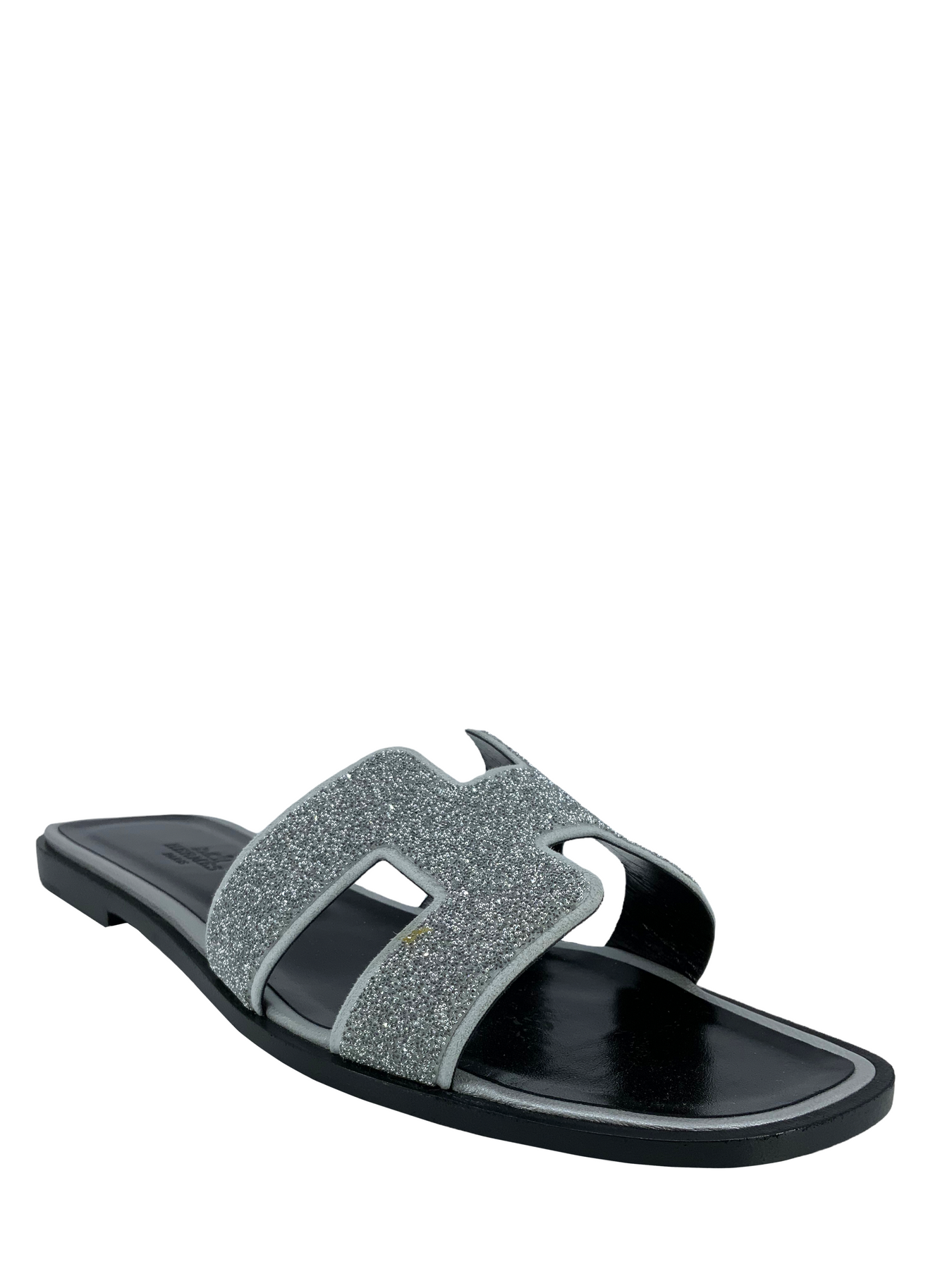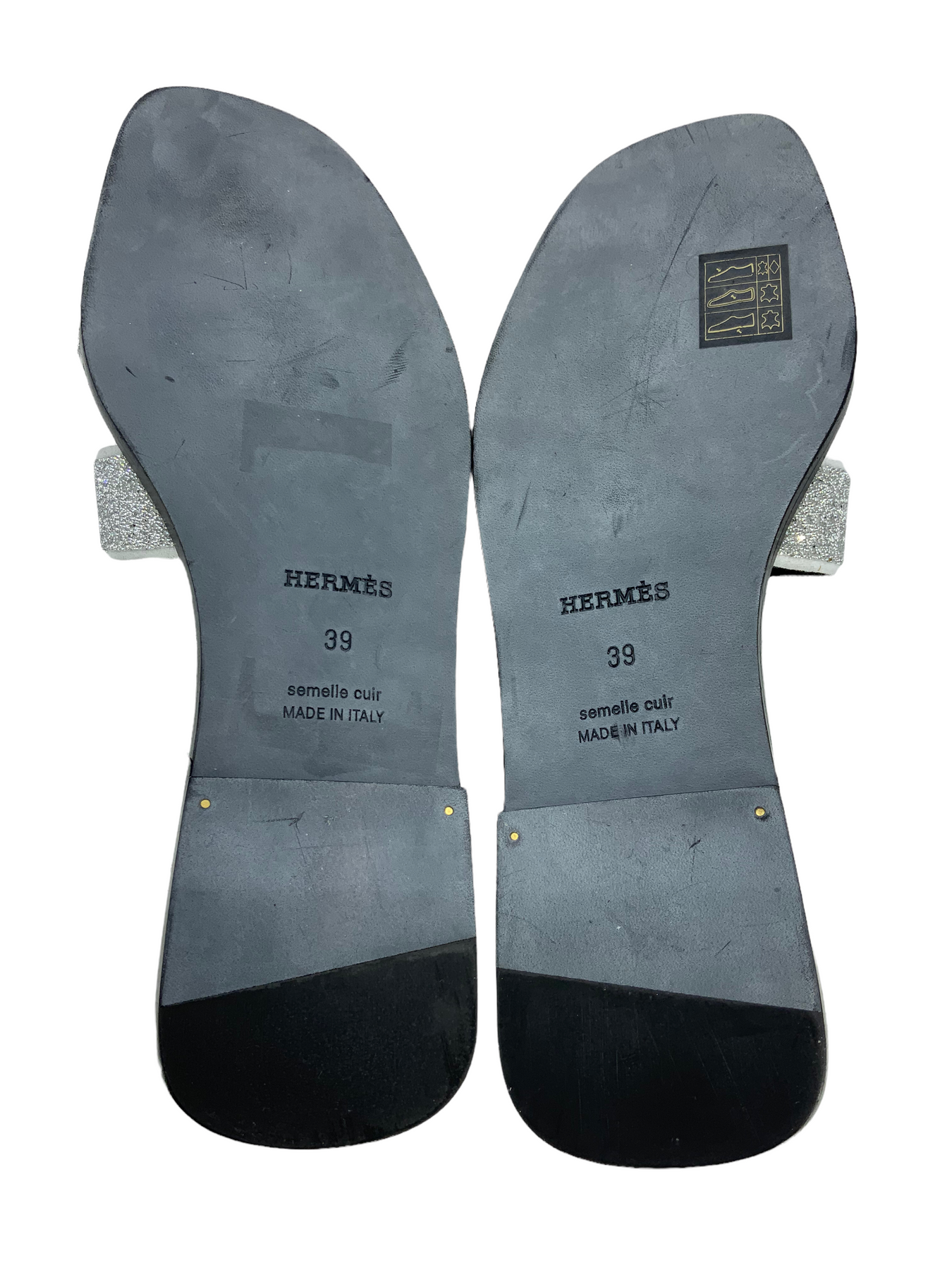This pair of HERMES Suede Goatskin Oran Glitter Sandals Size 9 (IT 39) define simple elegance. Expertly crafted from supple gray suede with a glitter-embellished 'H' logo and smooth black leather foot-beds.