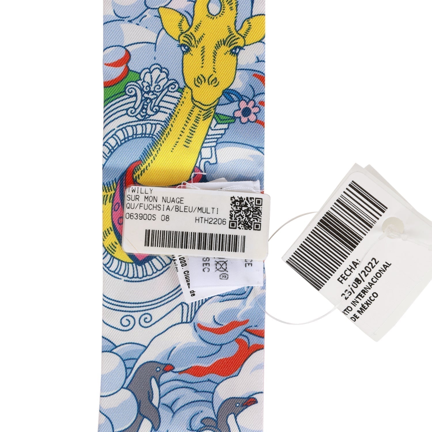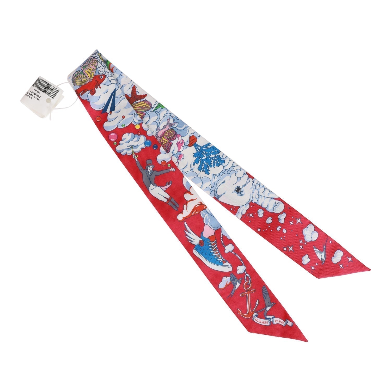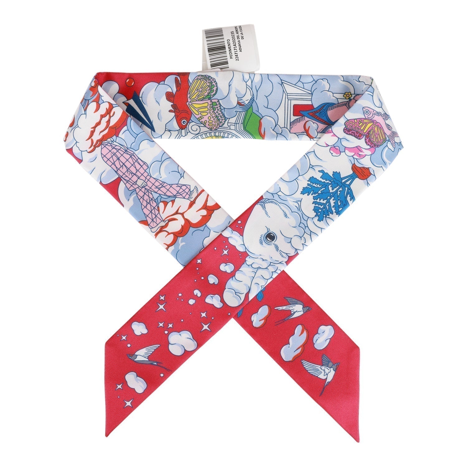 Hermes "Sur Mon Nuage" silk twilly designed by Dimitri Rybaltchenko in a fuchsia colorway.