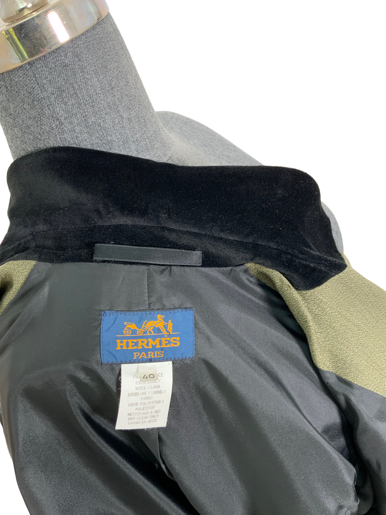 We the ity of this Hermes Wool Blazer Jacket Size M (FR 40) crafted from an olive green virgin wool blend. Featuring a black velvet trim on the back of the notched lapel collar, two front patch pockets and center button closures.