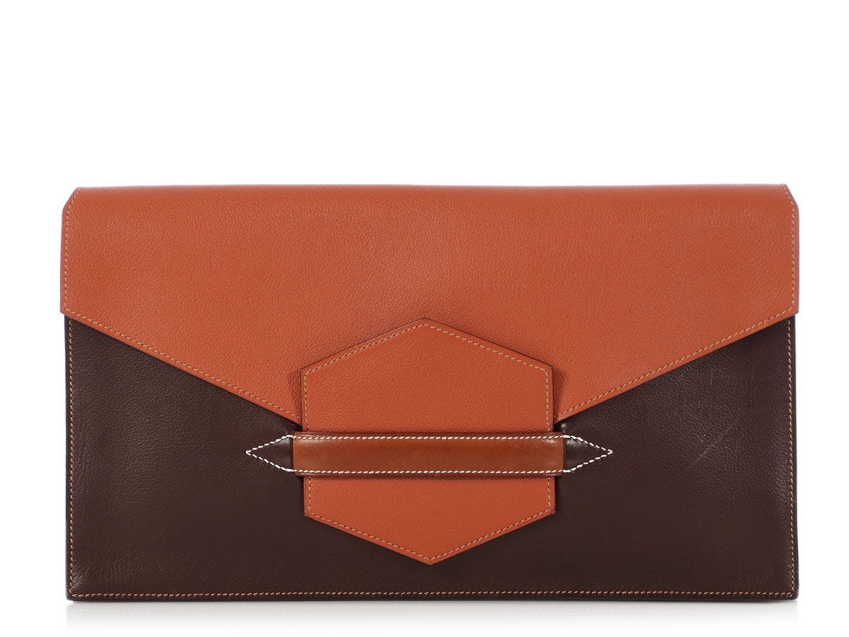 Hermès’ Tricolor Faco II Convertible Clutch hits the trifecta with three colors and three types of leather rolled into one rare bag! The front and back faces are in contrast-stitched Havane Evergreen, the envelope-shaped flap that secures with a leather strap is Fauve Barenia, and the interior is Blush Evercolor. What an ostentatious display of fine leather in a minimalist bag that can be carried three ways—as a shoulder bag or crossbody when you attach the adjustable strap with a 10-inch drop that has palladium hardware or as a clutch when it’s slipped inside. The interior has a large slide pocket connected to the face followed by an open area with one snap-flapped pocket against the back wall, while an expertly disguised slide pocket can be found on the back face. In good condition with a dustbag, it has wear under the flap and marks on the exterior and interior leather. Not that it needs it, but the perfect pairing for this large rectangle would be a Carmen Key Ring or Paddock Bag Charm!