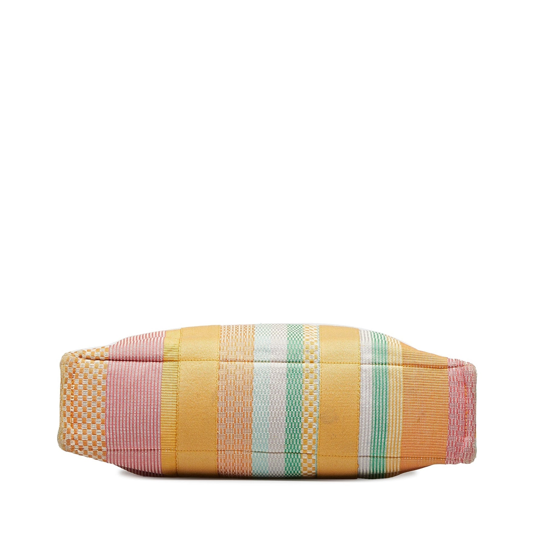 Product Details: Multi Hermes Fourre Tout MM Tote Bag. The Fourre Tout MM tote features a canvas body, exterior front and back slip pockets, flat handles, an open top with a snap closure, and an interior zip compartment. 11.8" L x 16.5" W x 3.9" D, 5.1" drop. Serial number V.