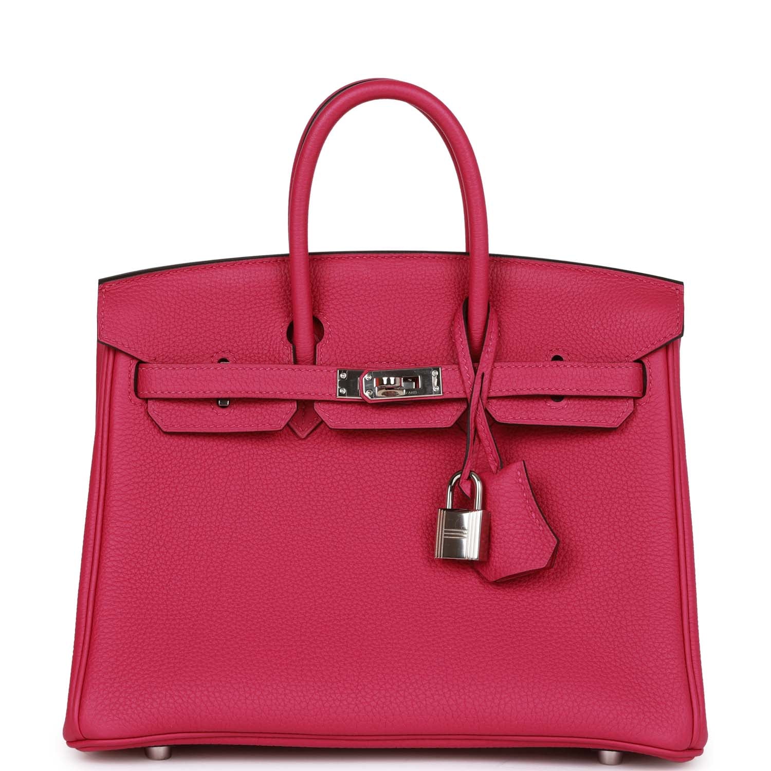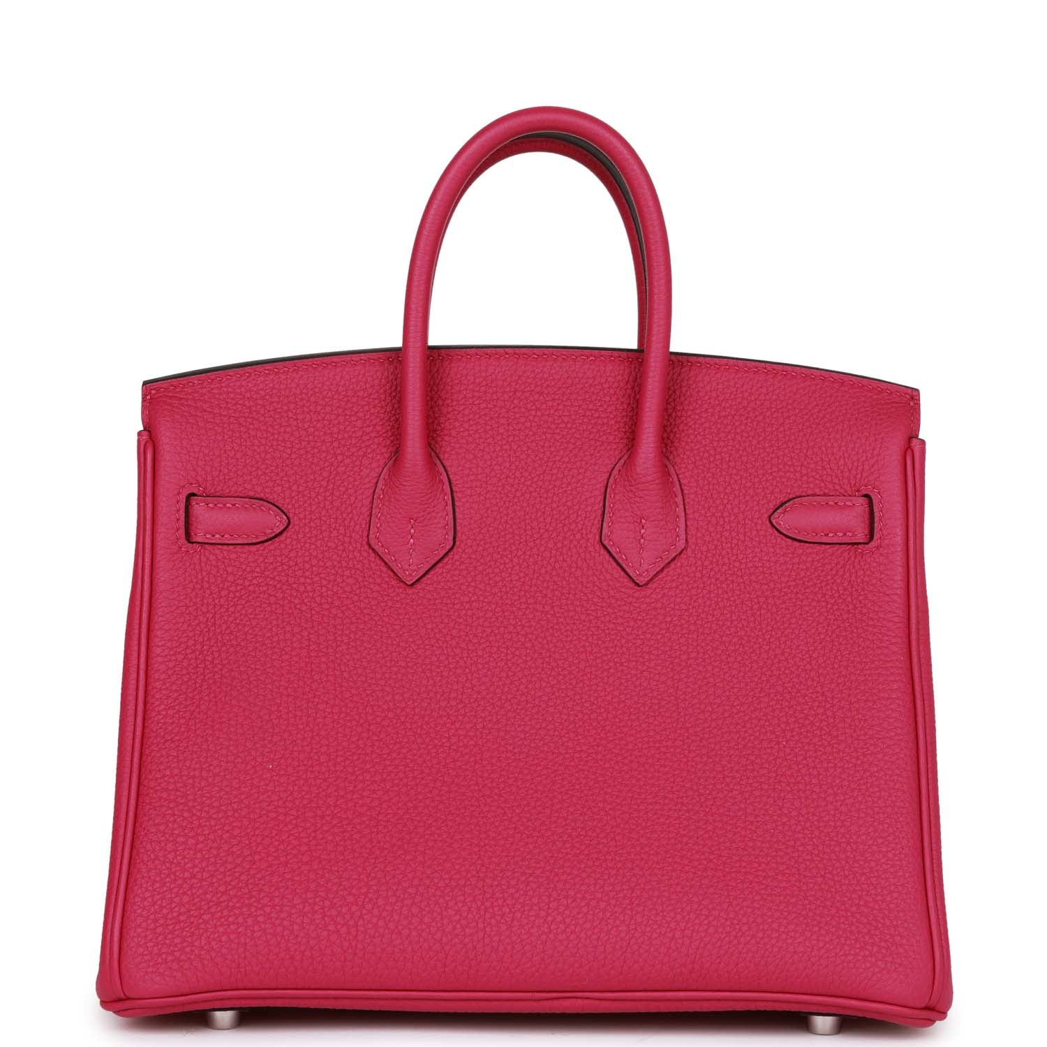 This Birkin is in Rose Pourpre togo leather with palladium hardware and has tonal stitching, front flap, two straps with center toggle closure, clochette with lock and two keys, and double rolled handles.