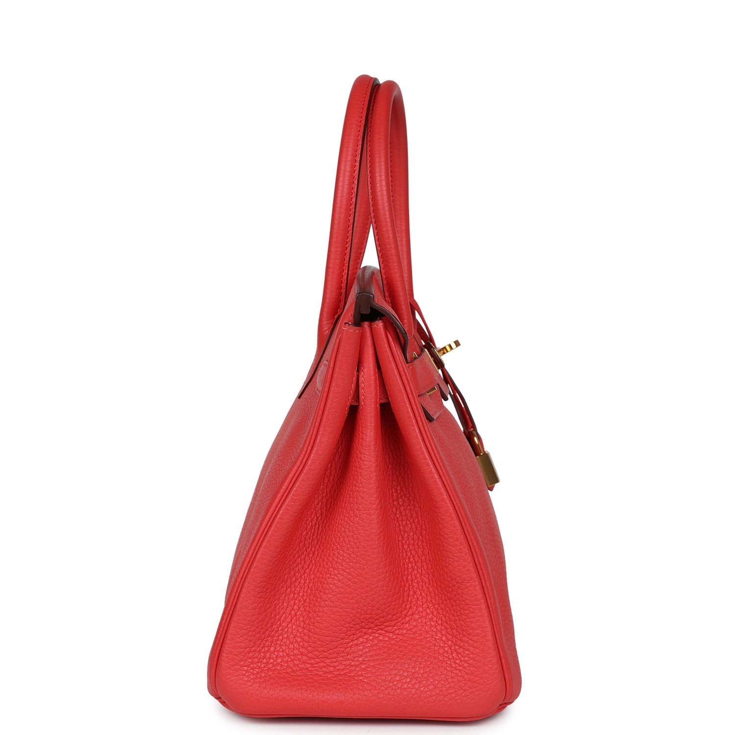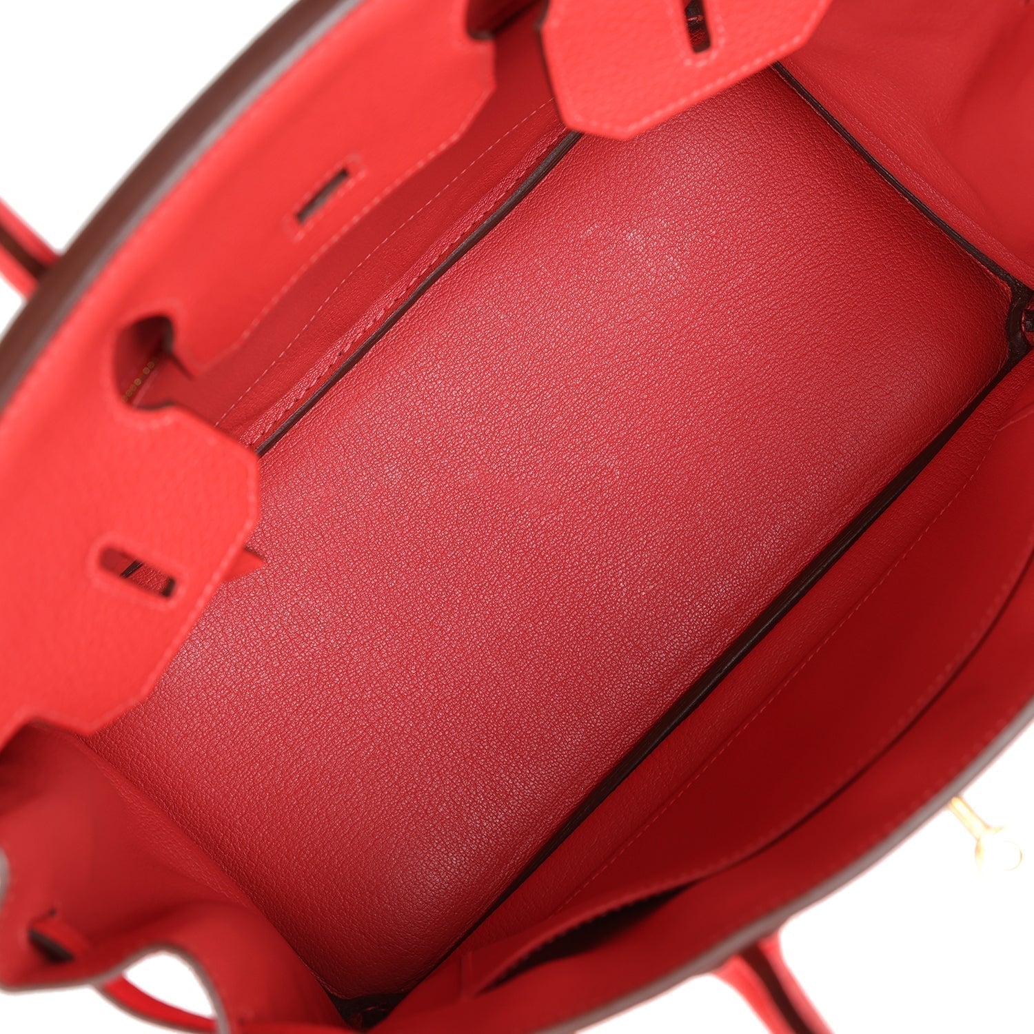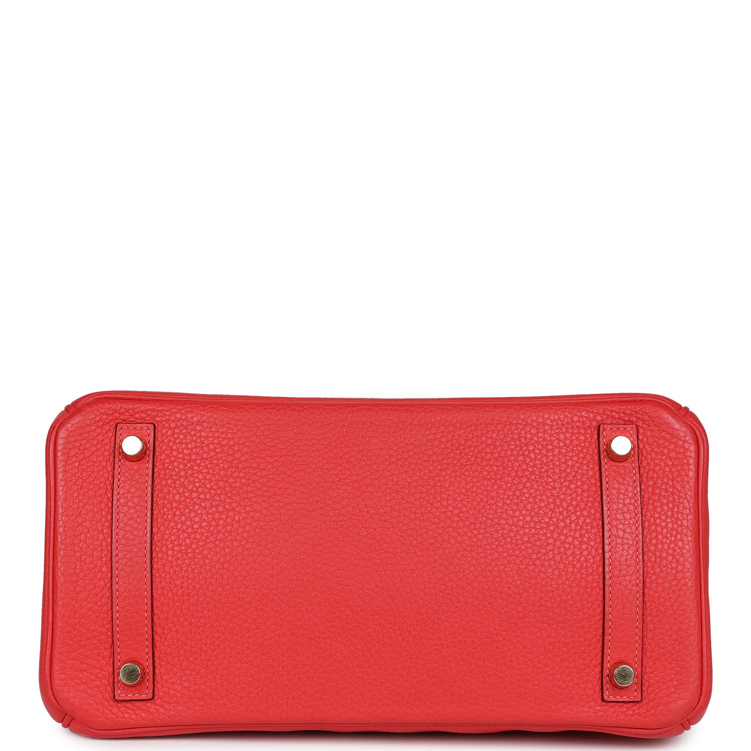 This Birkin is in Geranium clemence leather with gold hardware and has tonal stitching, front flap, two straps with center toggle closure, clochette with lock and two keys, and double rolled handles.