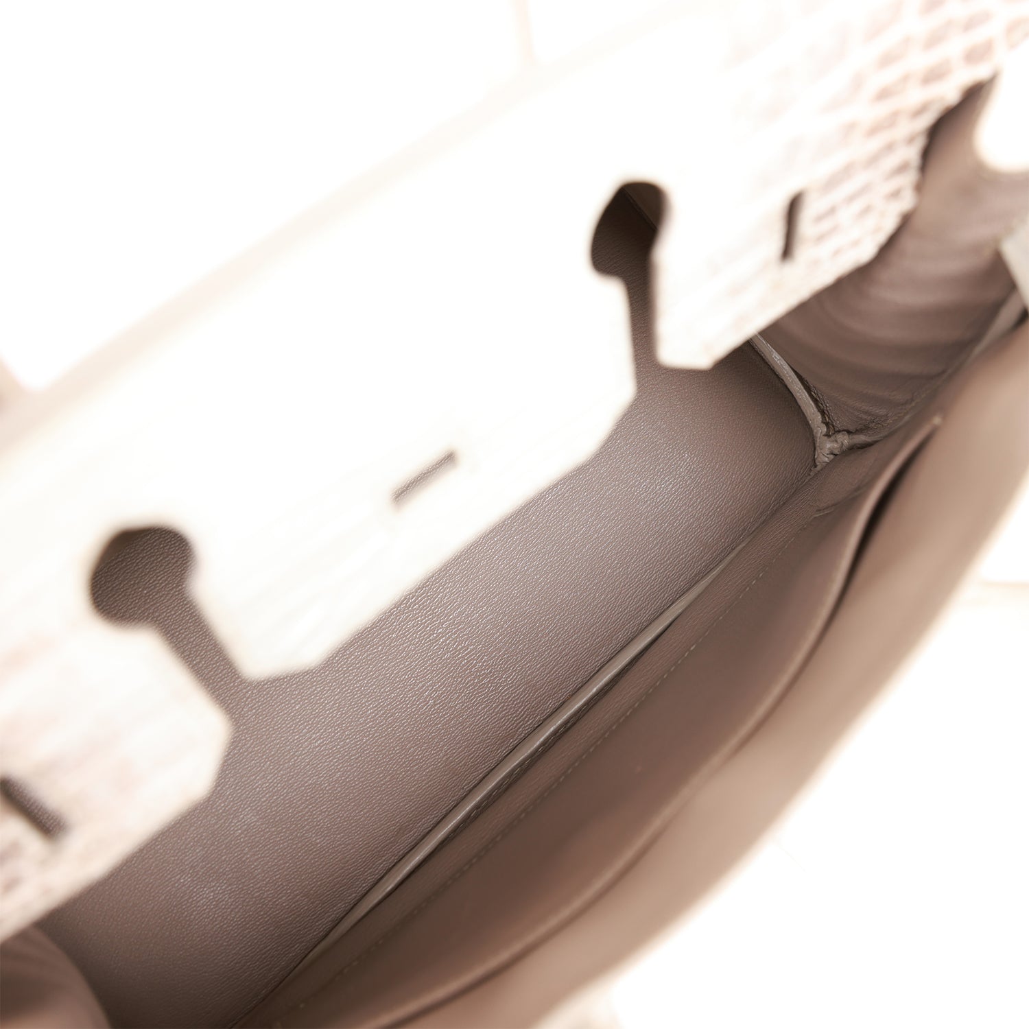 The interior is lined with Gris Perle chevre and has one zip pocket with an Hermes engraved zipper pull and an open pocket on the opposite side.