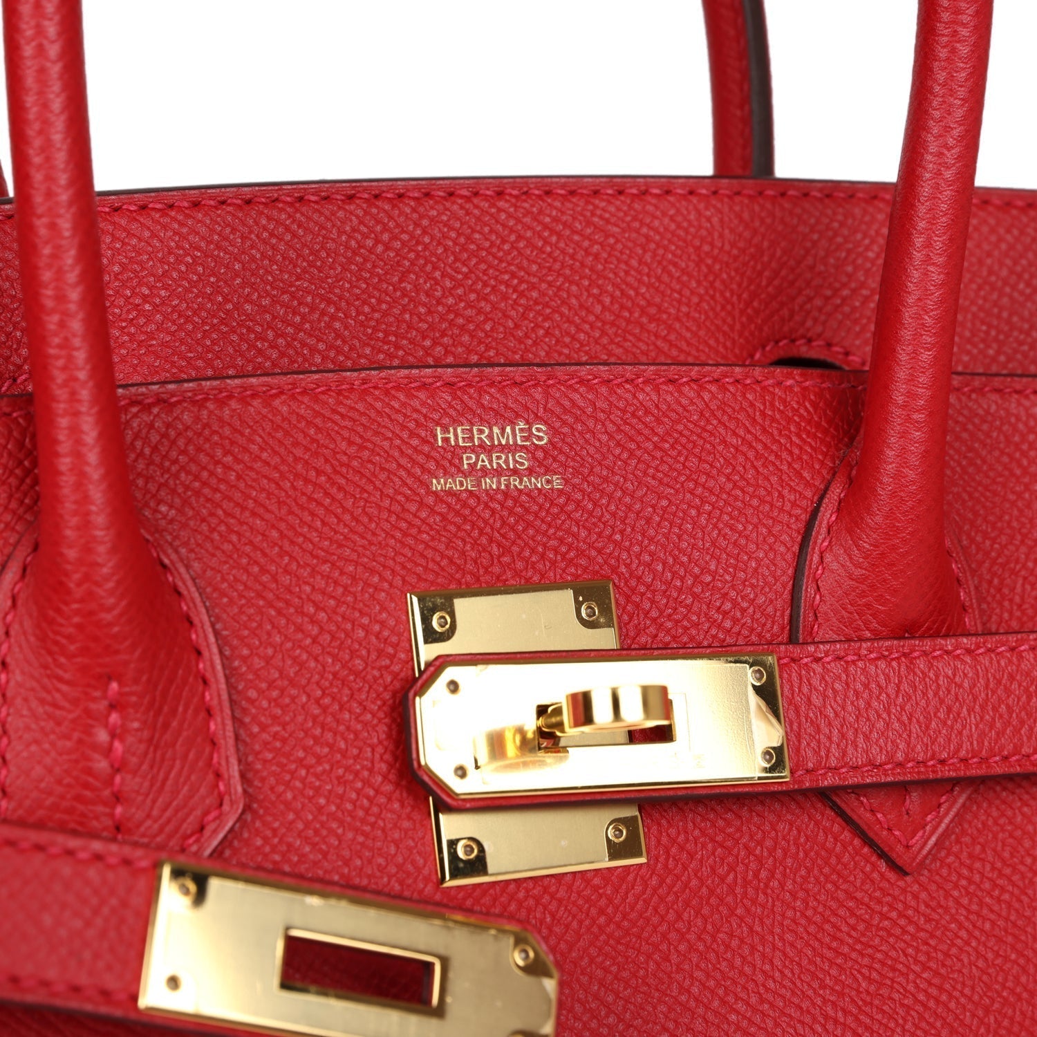 This Birkin is in Rouge Casaque epsom leather with gold hardware and has tonal stitching, front flap, two straps with center toggle closure, clochette with lock and two keys, and double rolled handles.