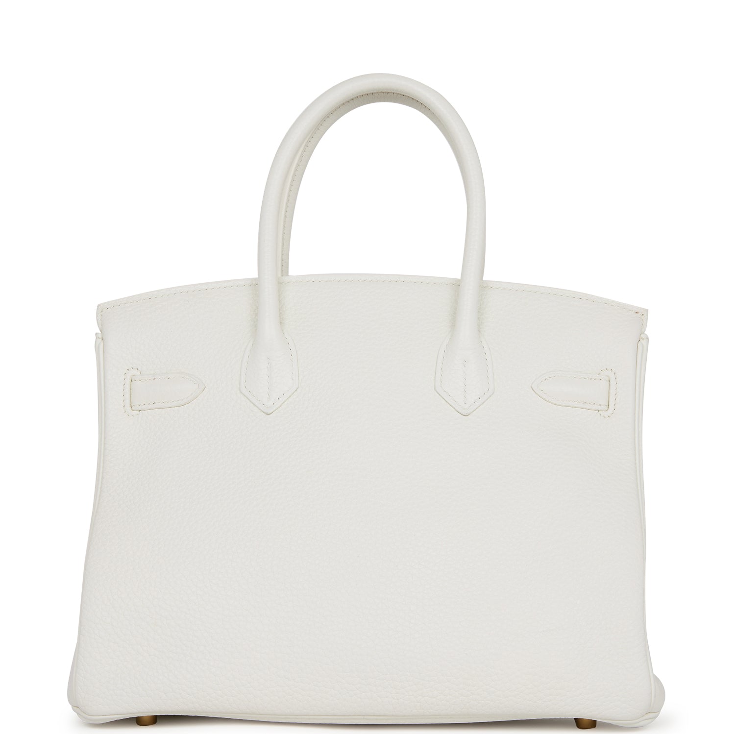 This Birkin is in White clemence leather with gold hardware and has tonal stitching, a front toggle closure, a clochette with lock and two keys, and double rolled handles.