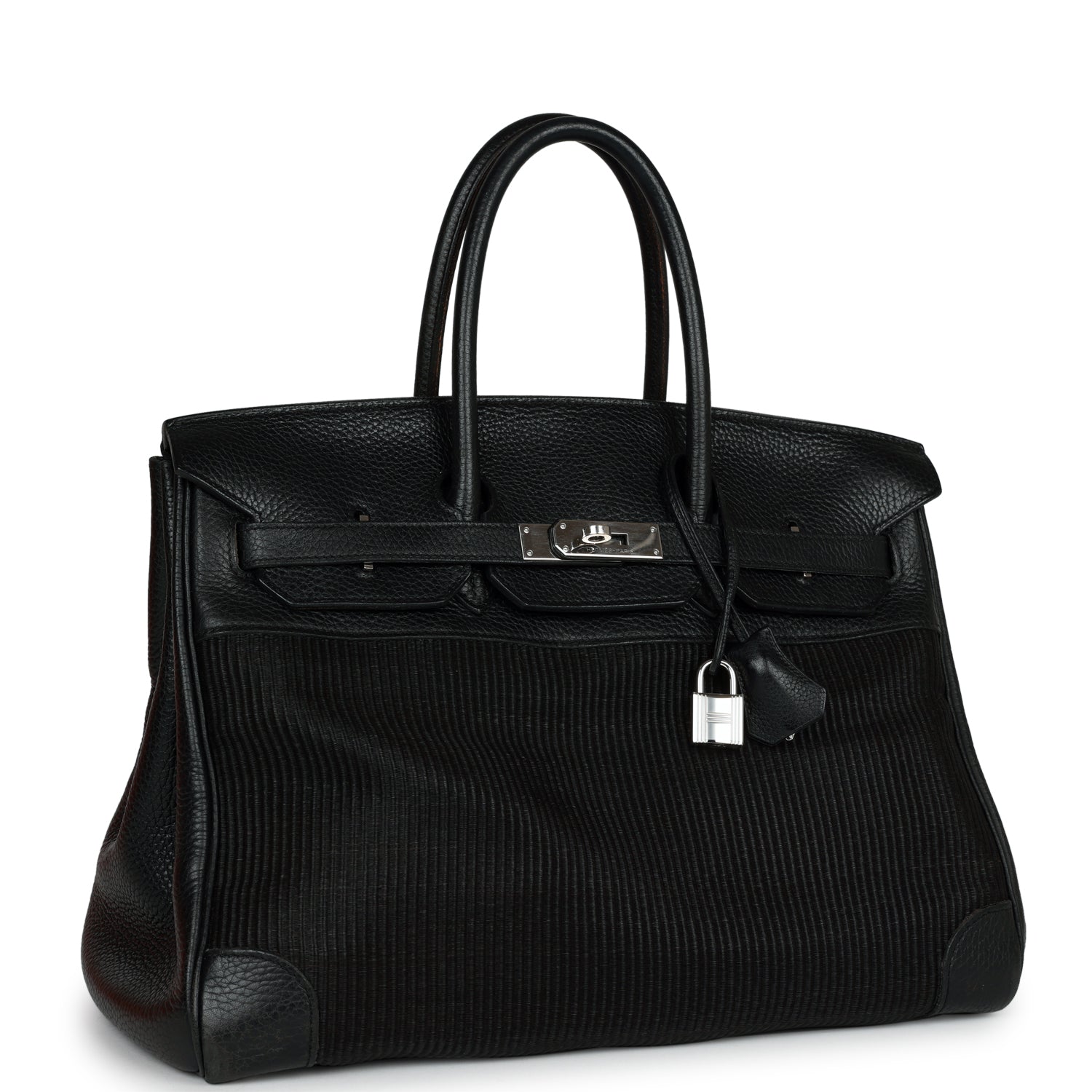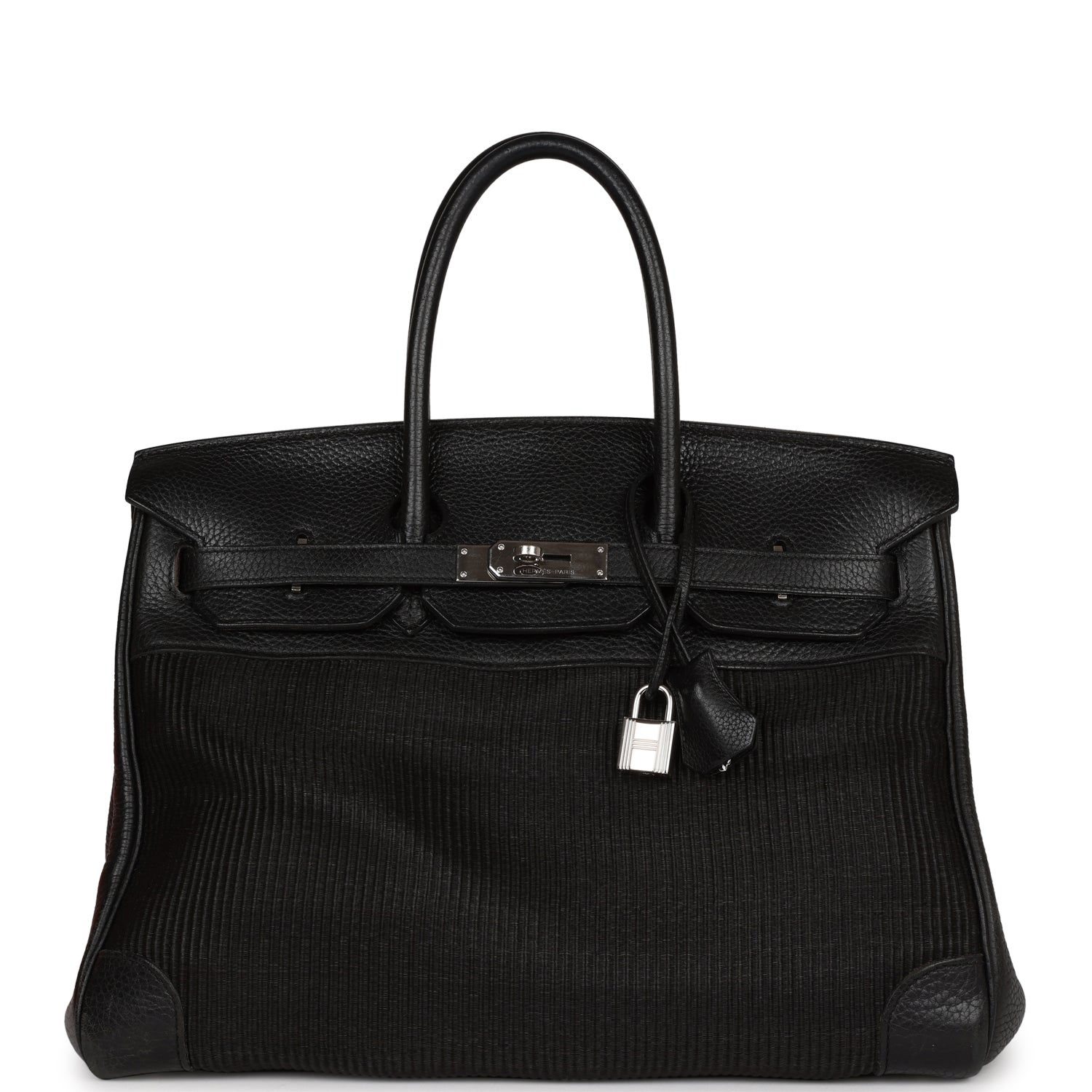 This Birkin is in black crinoline and clemence leather with palladium hardware and has tonal stitching, front flap, two straps with center toggle closure, clochette with lock and two keys, and double rolled handles.