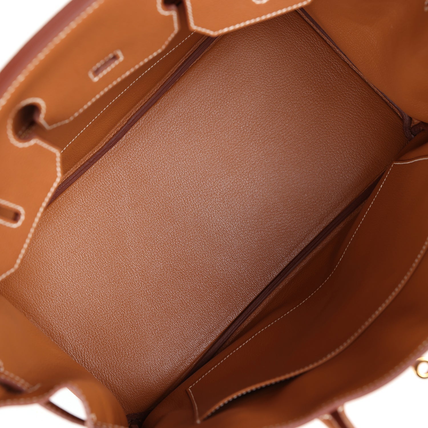 The interior is lined with gold chevre and has one zip pocket with an Hermes engraved zipper pull and an open pocket on the opposite side.