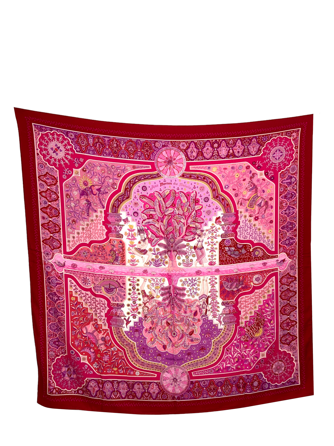 We the ity of this absolutely stunning and bursting with color Hermes Aux Portes du Palais Cashmere Shawl Scarf 140 designed by Christine Henry which was first issued in 2008. This gorgeous scarf features vibrant red and pink hues with hand-rolled edges.