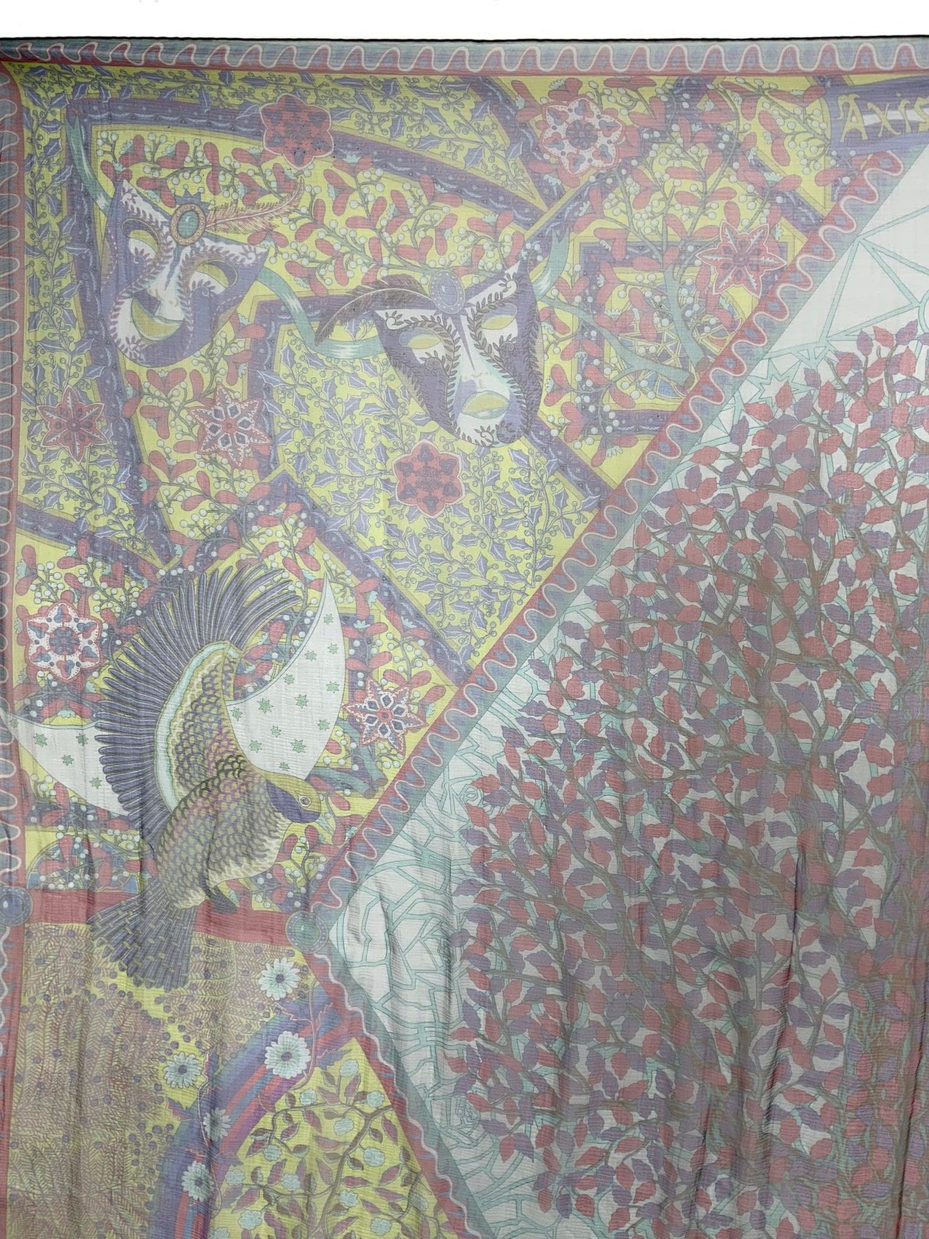 Wrap yourself in luxury with this  Hermes Axis Mundi Silk Scarf 140 designed by Christine Henry and first issued in 1999 which celebrates the 'World Tree'. It features an olive green background with a purple and dark blue print that depicts the four seasons surrounded by a giant oak tree at center.